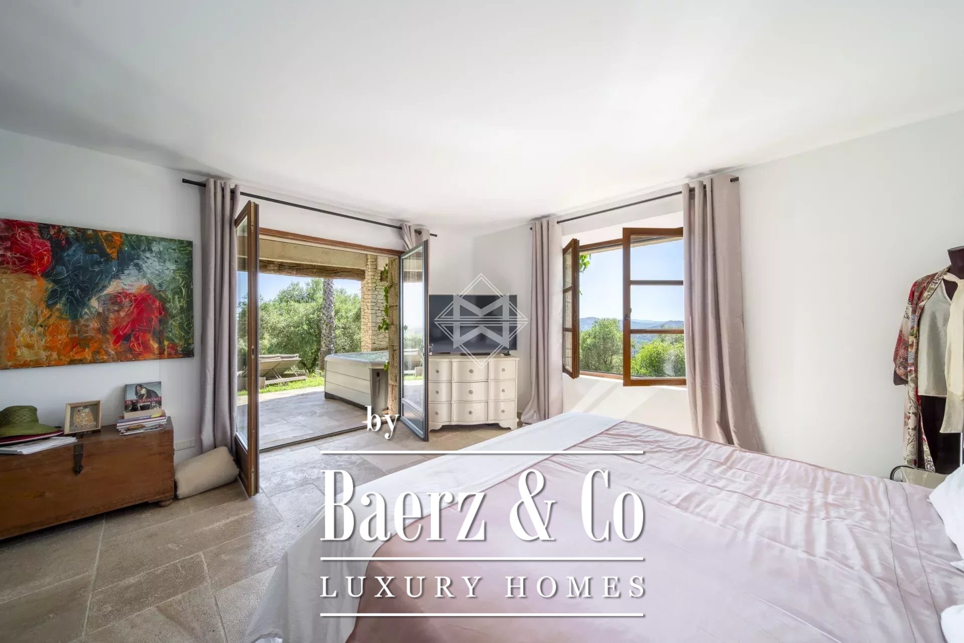 Vier slaapkamers, elk met een eigen badkamer of douche, bieden rust en comfort. Twee suites springen eruit: één met kantoor grenzend aan een overdekt terras met jacuzzi, de andere biedt gasten een privé Tropézienne-terras met onbelemmerd uitzicht. Voorzieningen zijn onder meer een tennisbaan, vloerverwarming, airconditioning, glasvezel, open haard en beveiliging met elektrische toegangspoort en videointercom. De garage, carport en een flexibel bijgebouw laten ruimte voor verdere verfijning.