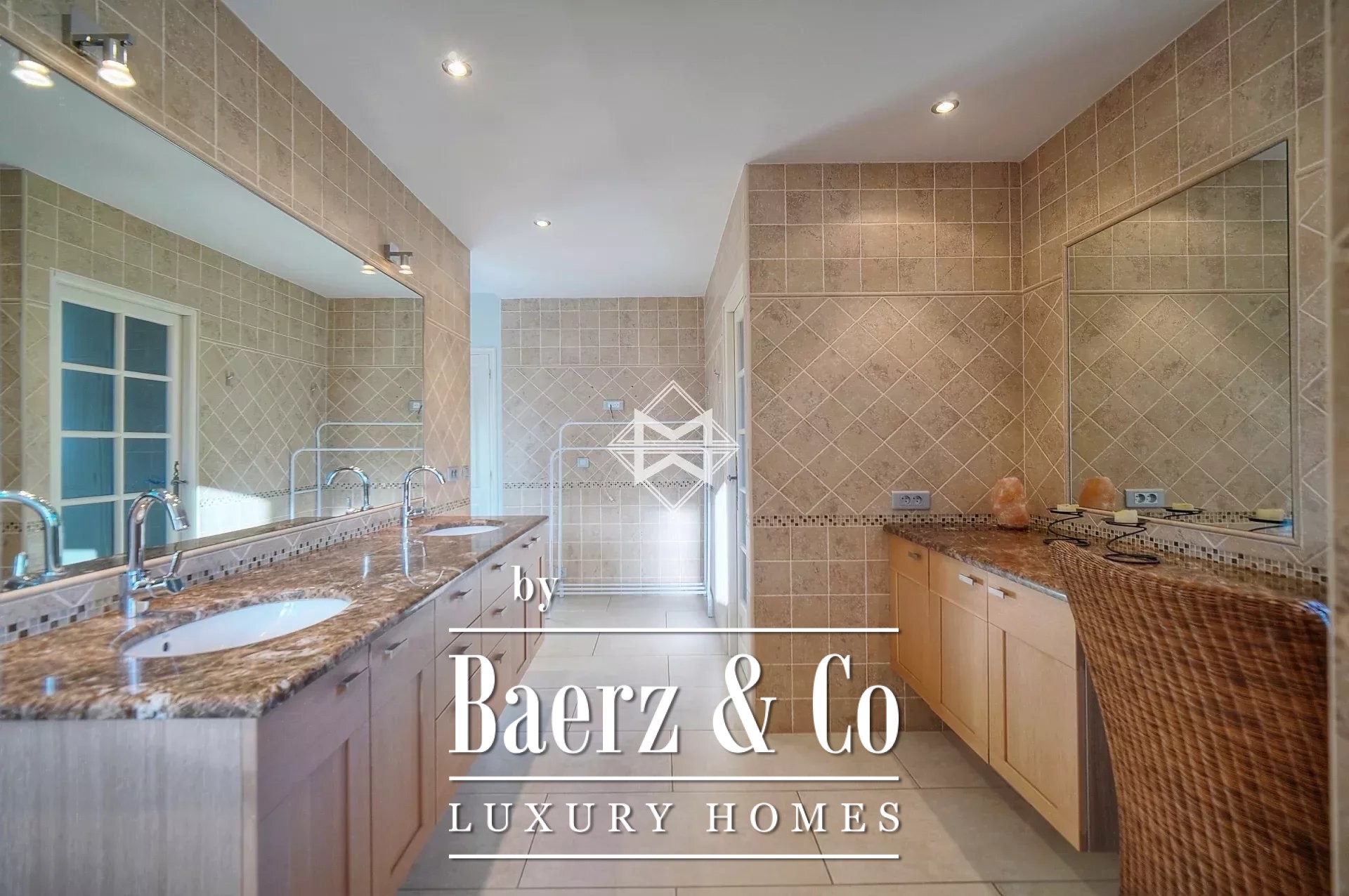 De villa meet 360 m², verdeeld over drie verdiepingen, en beschikt over vijf slaapkamers, waaronder een suite op de begane grond met directe toegang tot de fraai aangelegde tuin. De indeling brengt open leefruimtes en privévertrekken mooi in balans; airconditioning en radiatorverwarming zorgen het hele jaar door voor comfort. Hoogwaardige afwerkingen omvatten elektrische rolluiken, een geavanceerd alarmsysteem en een elektrische poort voor een ongestoorde en discrete levensstijl.