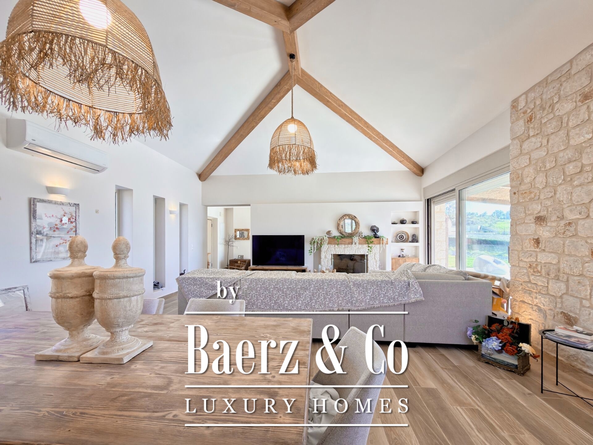 Bij binnenkomst vormt de royale woonkamer het hart van de woning, met een sfeervolle open haard die is opgebouwd uit authentiek natuursteen en doorloopt tot het exterieur. De open keuken, harmonieus verbonden met de leefruimte, combineert comfort met functionele helderheid. Drie ruime masterbedrooms en drie verfijnde badkamers, aangevuld met een extra gastentoilet, bieden optimaal wooncomfort en privacy voor zowel dagelijks gebruik als gastenverblijf. Door het hele huis zorgen dubbele beglazing, energiezuinige ramen, hoogwaardige isolatie en geavanceerde beveiliging voor rust en gemoedsrust.