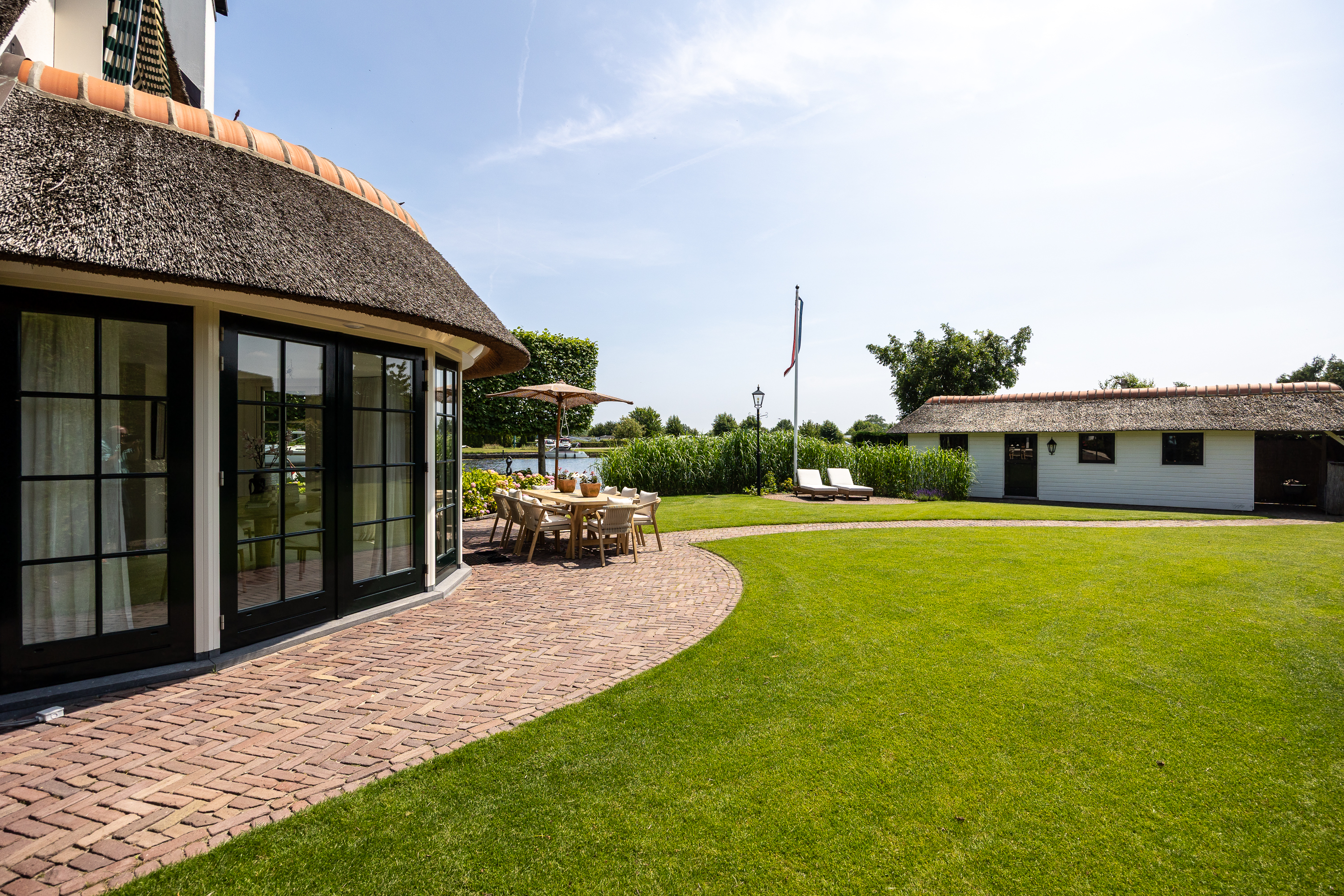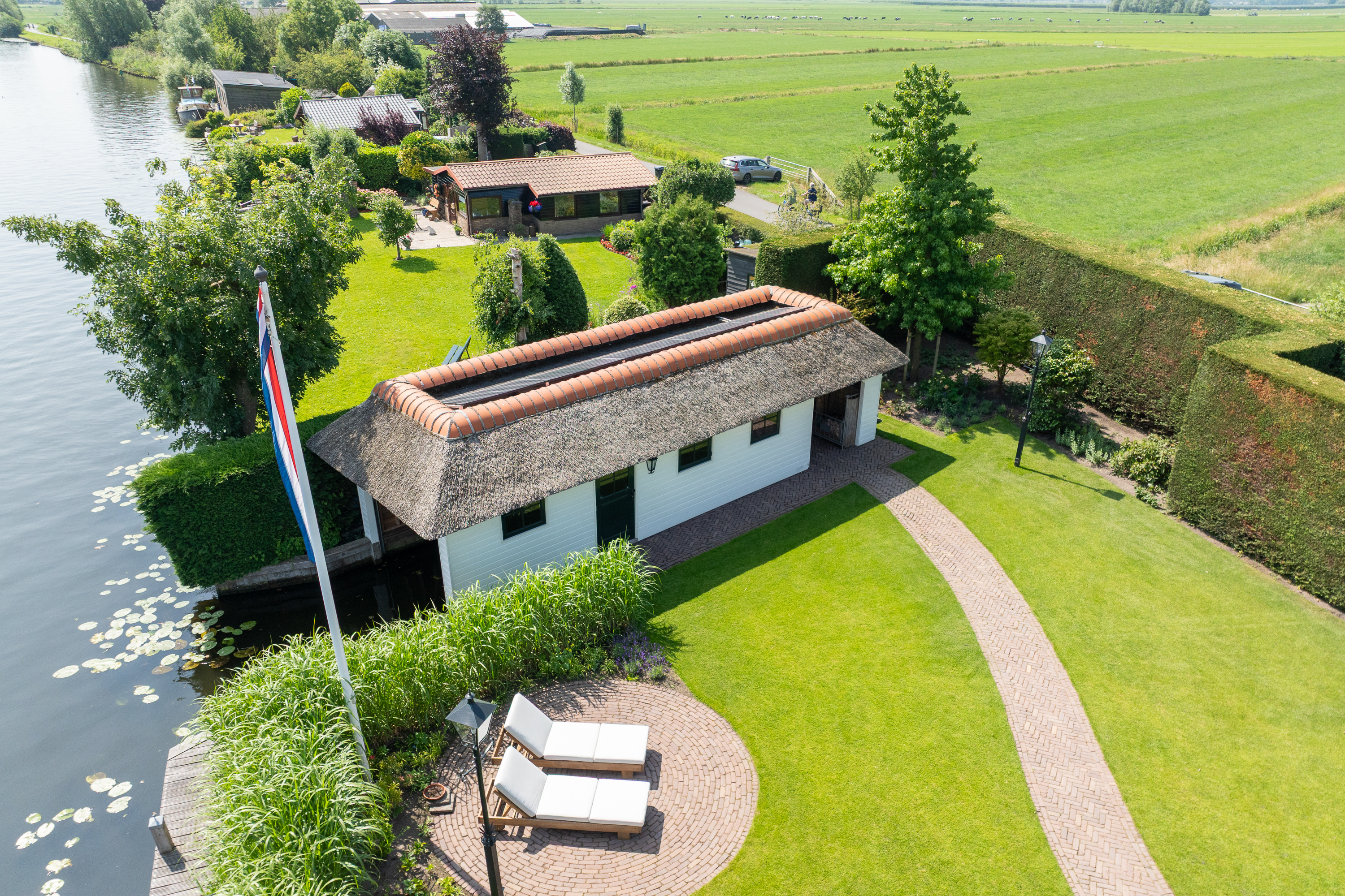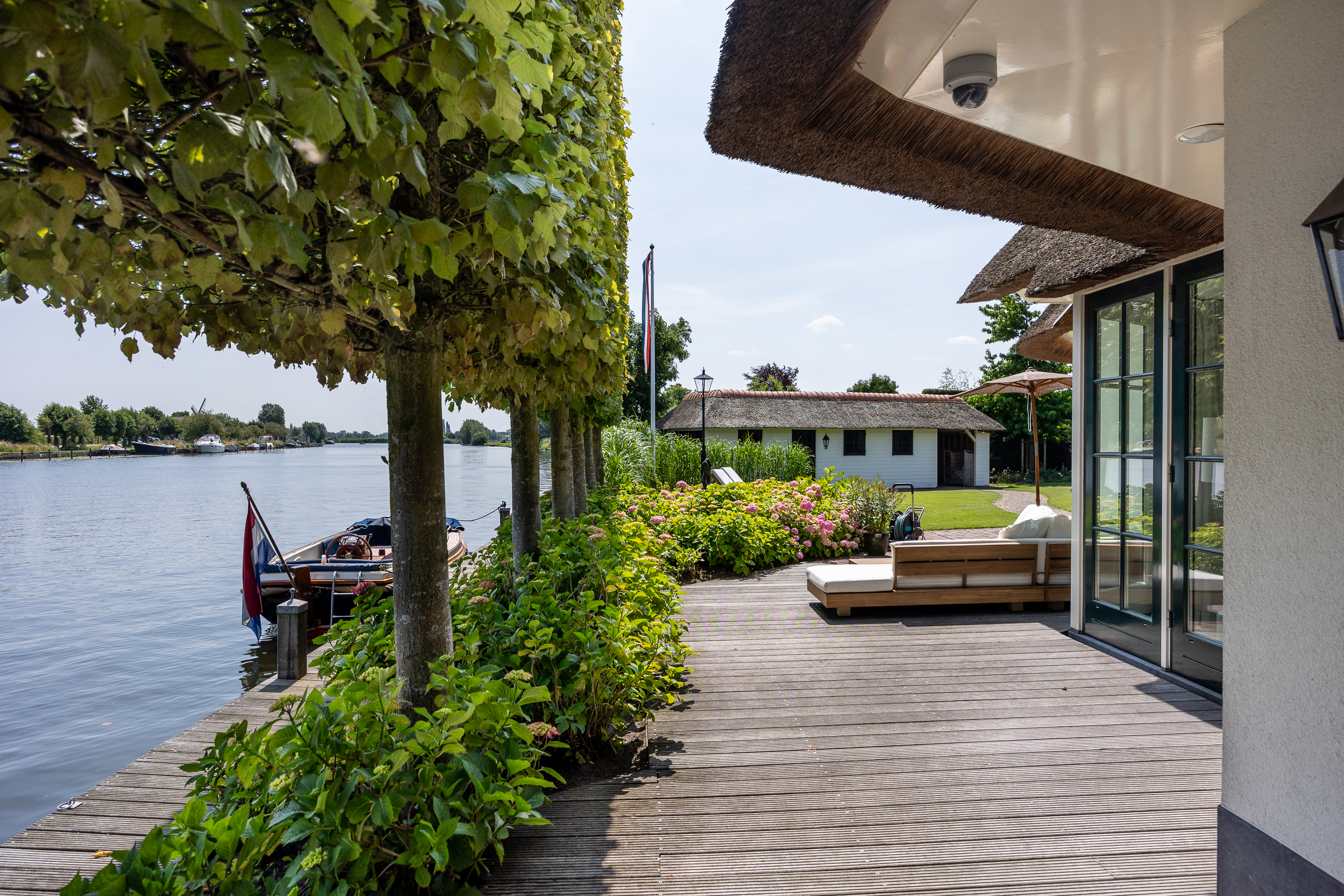 Achter in de tuin staat een fraaie botenhuis (ook rietgedekt en voorzien van zonnepannelen) welke voor uw boot ter beschikking staat!