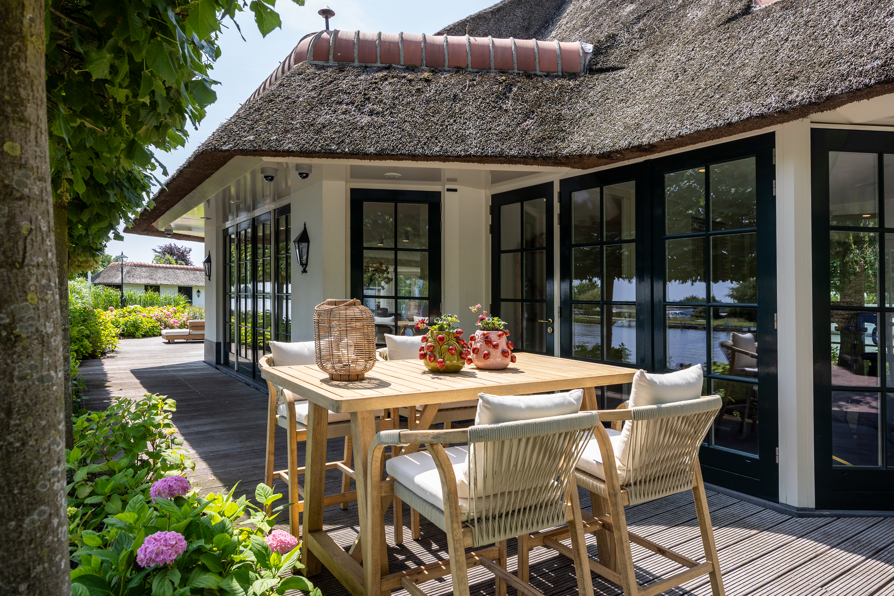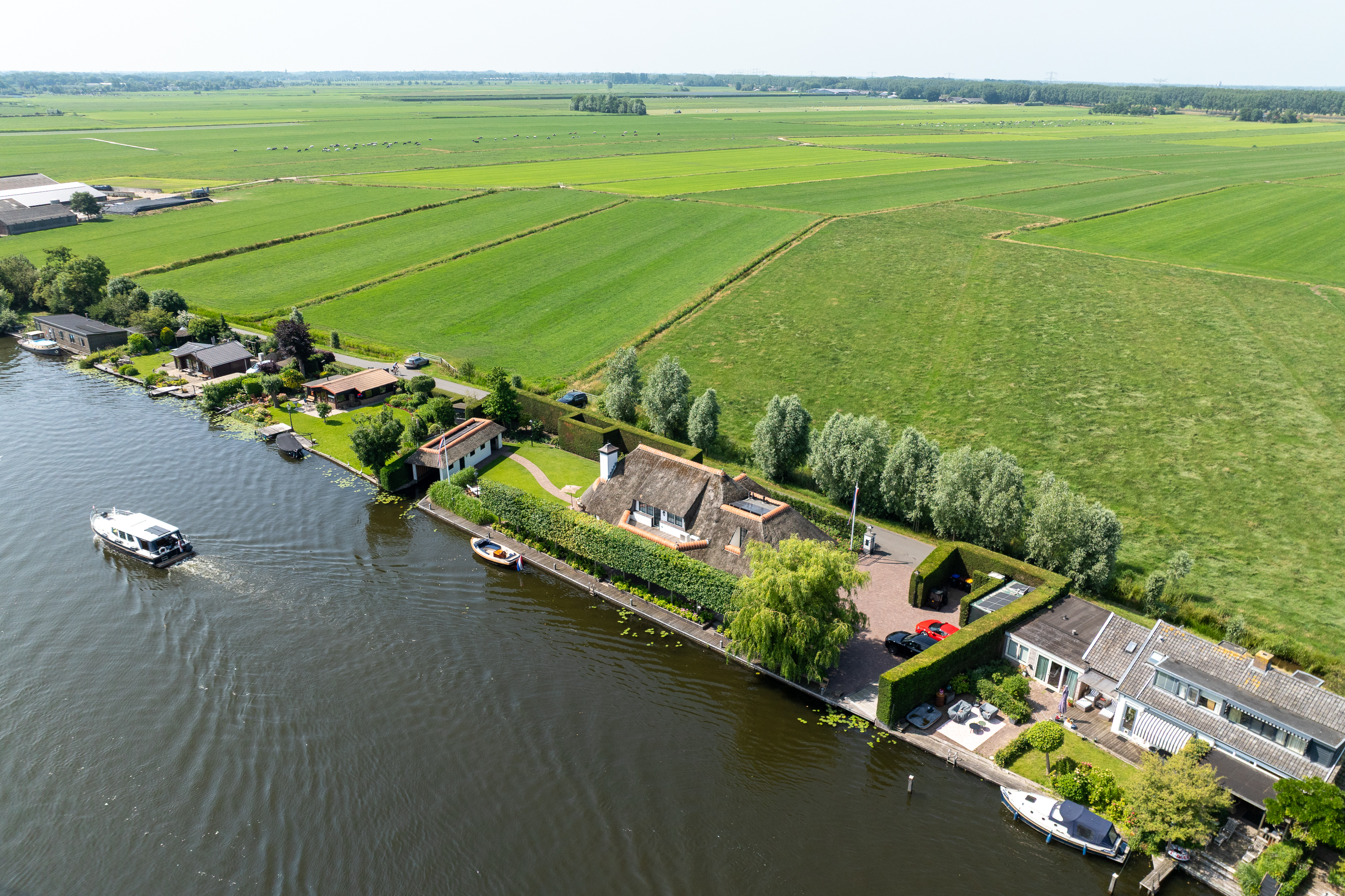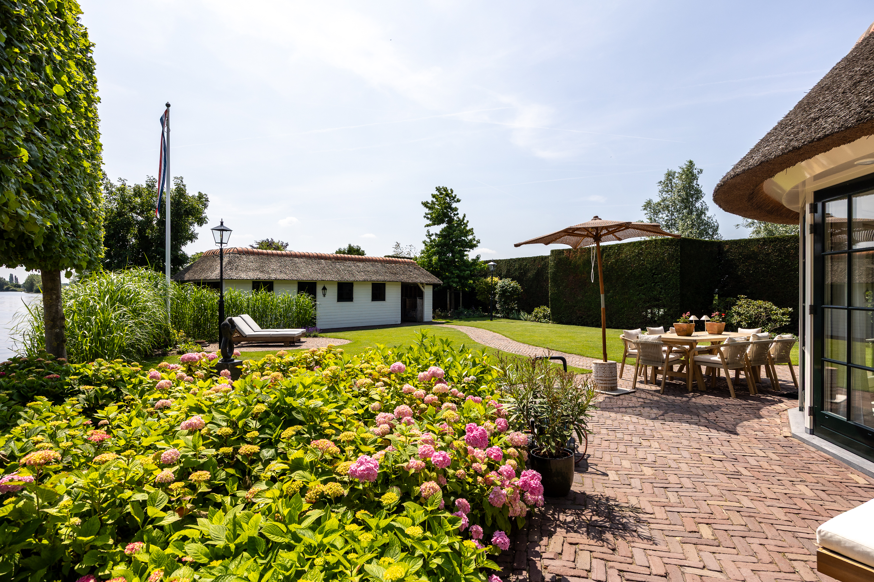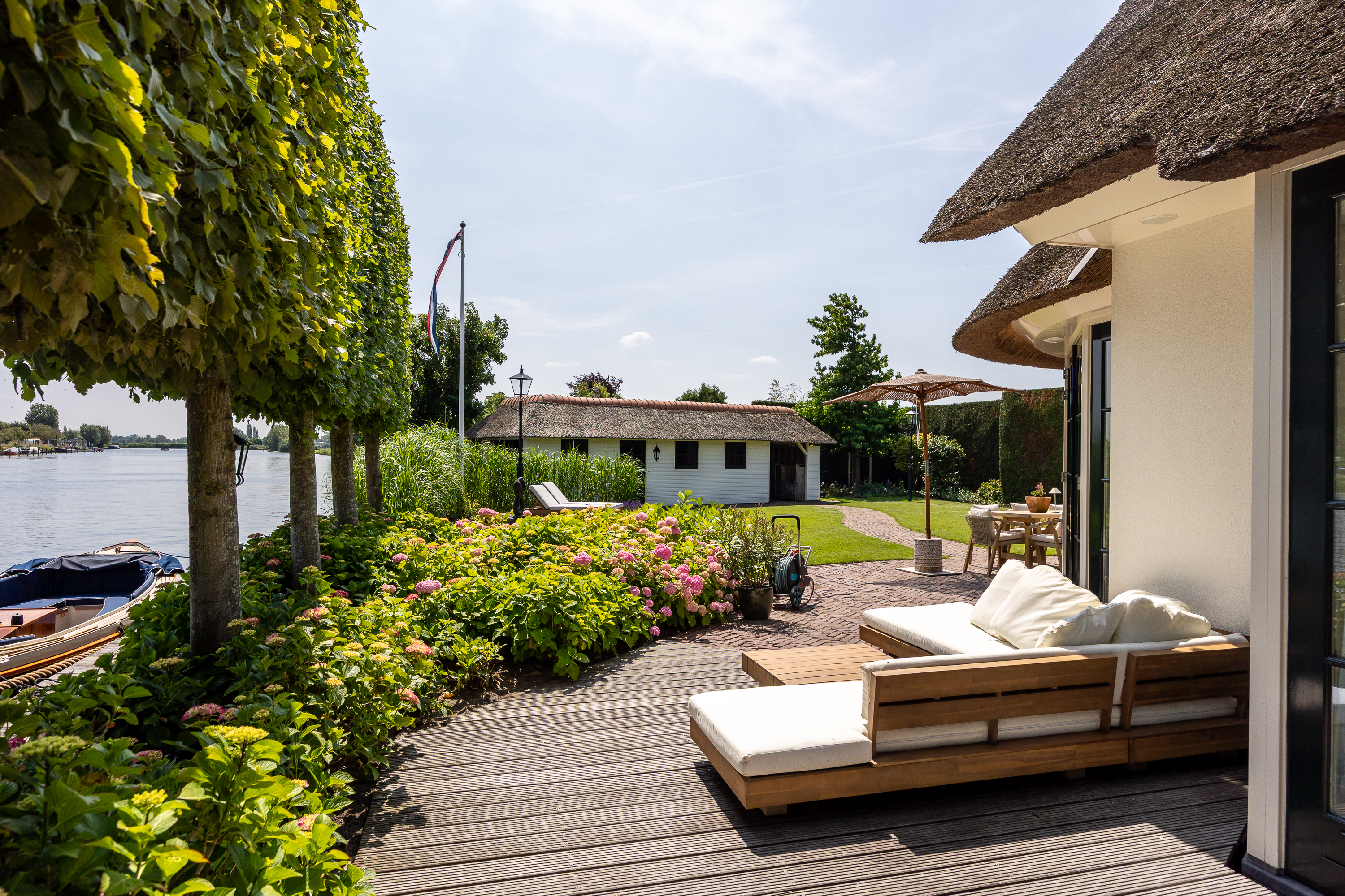 Achter in de tuin staat een fraaie botenhuis (ook rietgedekt en voorzien van zonnepannelen) welke voor uw boot ter beschikking staat!