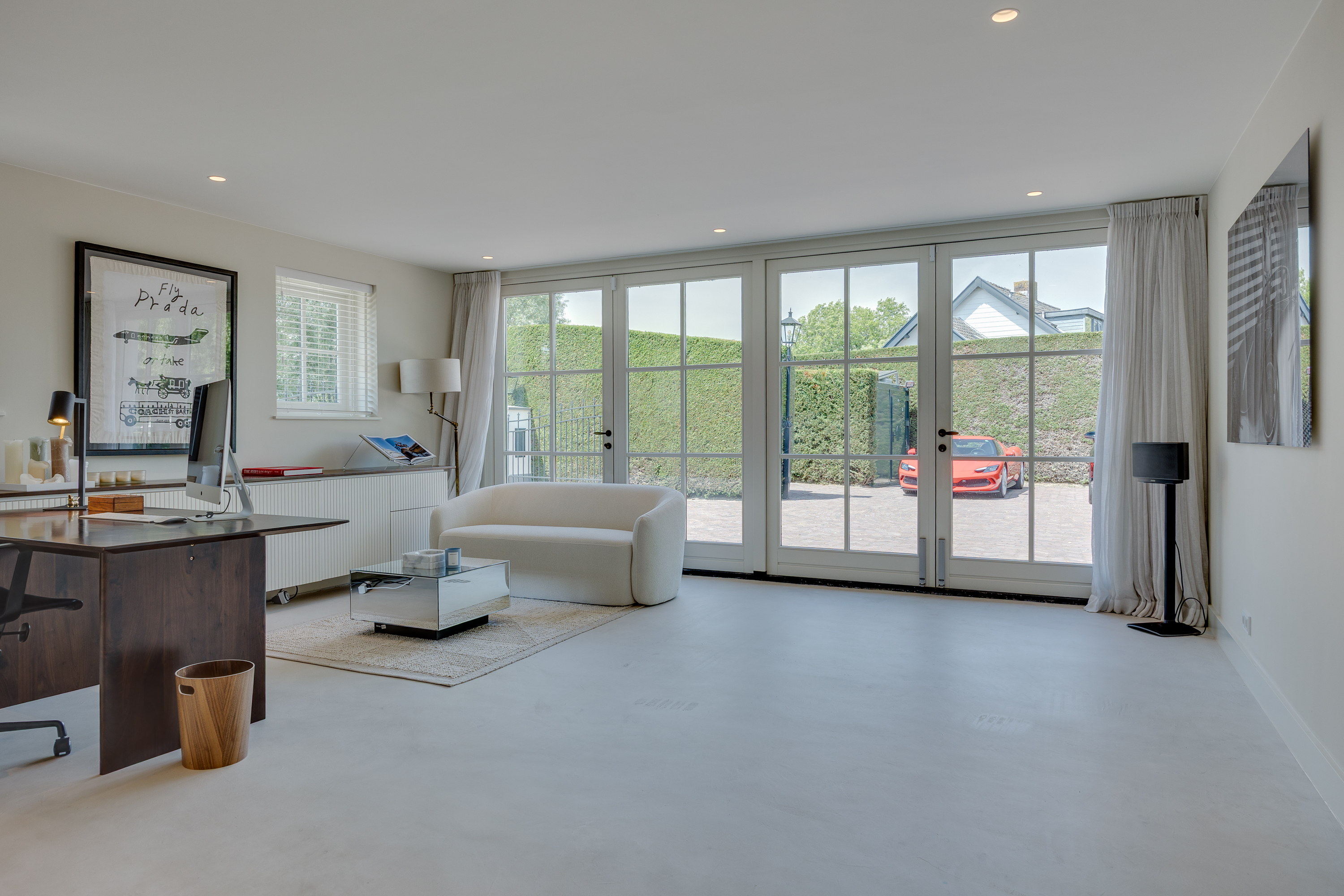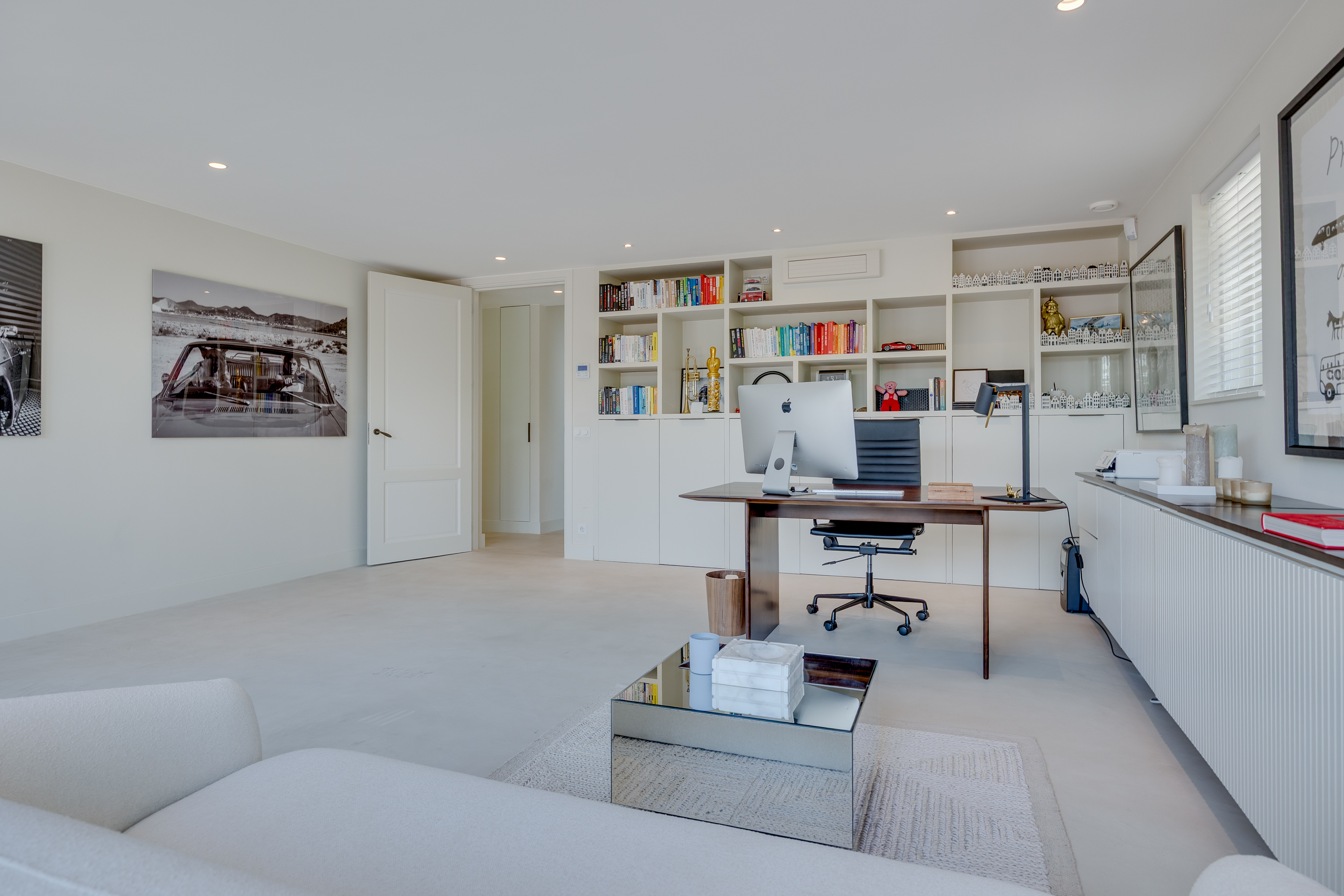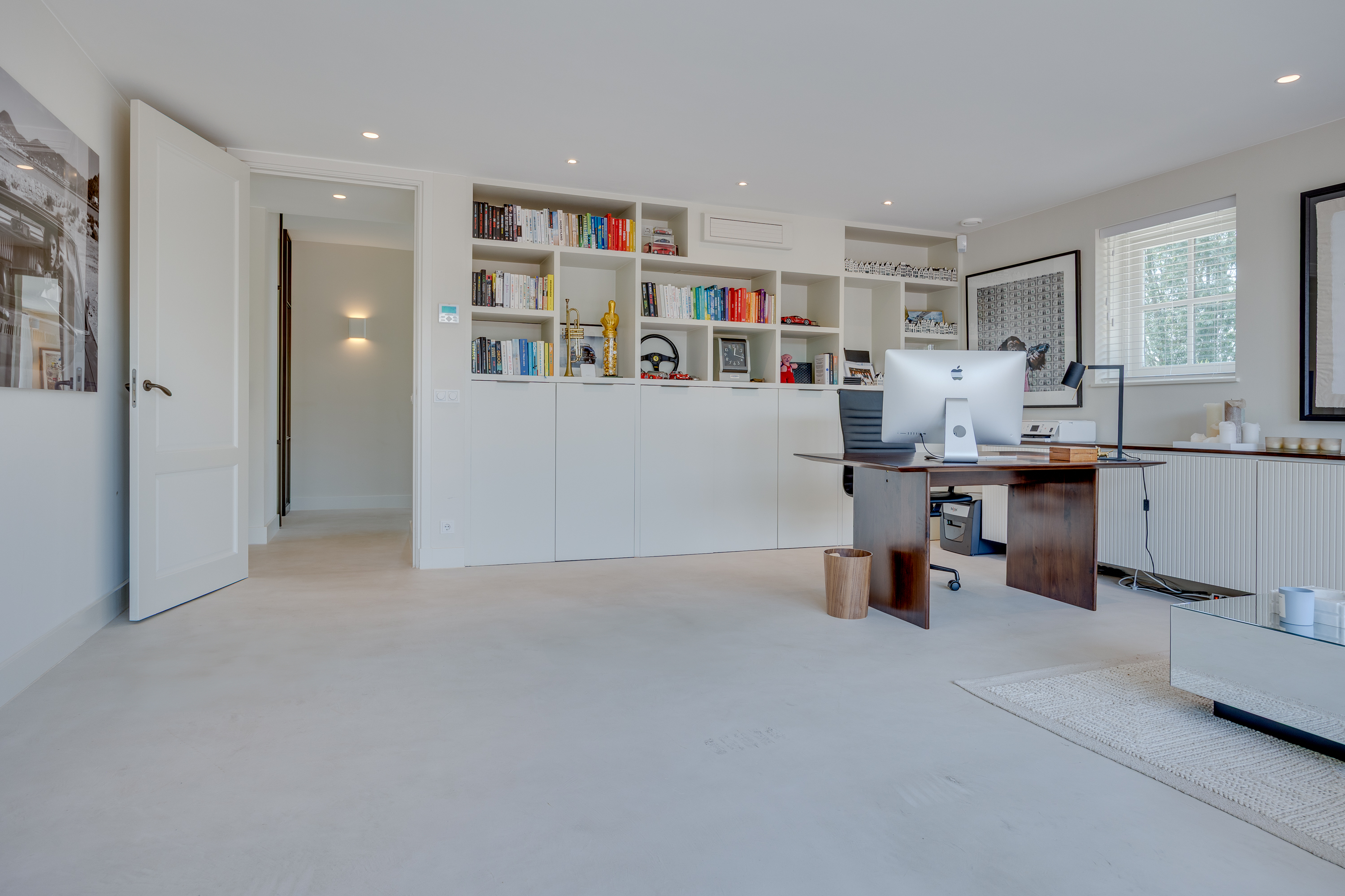 De heerlijke, ruime werkkamer waar werk en ontspanning elkaar moeiteloos de hand schudden. Hier kun je geconcentreerd werken, om daarna net zo makkelijk een paar squats te doen in de naastgelegen gym. De werkkamer is voorzien van maatwerk kasten en vooral veel licht. Door de grote dubbele openslaande deuren kan zelf je auto als kunstobject binnen staan! Indien de wens bestaat om levensloop bestendig te (gaan)wonen kan de werkkamer met enige aanpassing makkelijk omgetoverd worden naar een extra slaapkamer met ensuite badkamer.