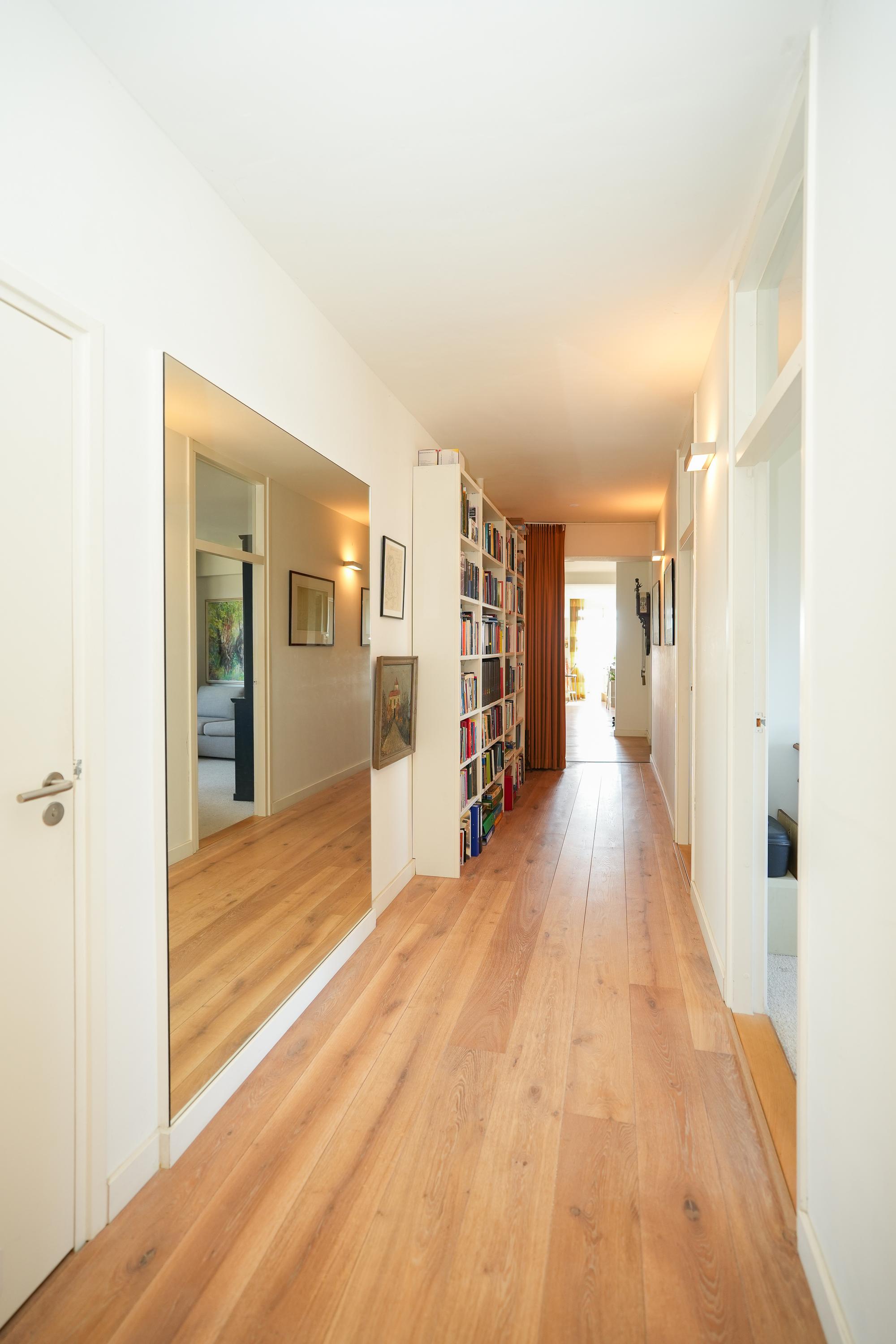 Entree appartement met een beveiligde toegangsdeur. Het appartement is zeer licht door rondom ramen. Het beschikt over een lange, brede hal die als centrale verbinding dient. Bij binnenkomst bevinden zich de garderobe, het gastentoilet, een wasruimte en de open keuken. De keuken en woonkamer zijn beide direct bereikbaar vanuit de hal, wat zorgt voor een loftachtige sfeer en mooie, logische doorloop. De keuken is voorzien van diverse inbouwapparatuur en biedt toegang tot het eerste balkon welke op het zuiden gericht is. Aangrenzend aan de keuken bevindt zich een inpandige bijkeuken met extra opberg- en werkruimte. Vanaf de woonkamer en het balkon is er een prachtig uitzicht over de stad Nijmegen en de Radboud Universiteit. Een gashaard zorgt voor een scheiding tussen de eetkamer en de televisiehoek aan de zuidwest kant. Het westelijk gelegen balkon biedt een fraai uitzicht richting de Waal en de iconische Waalbrug.