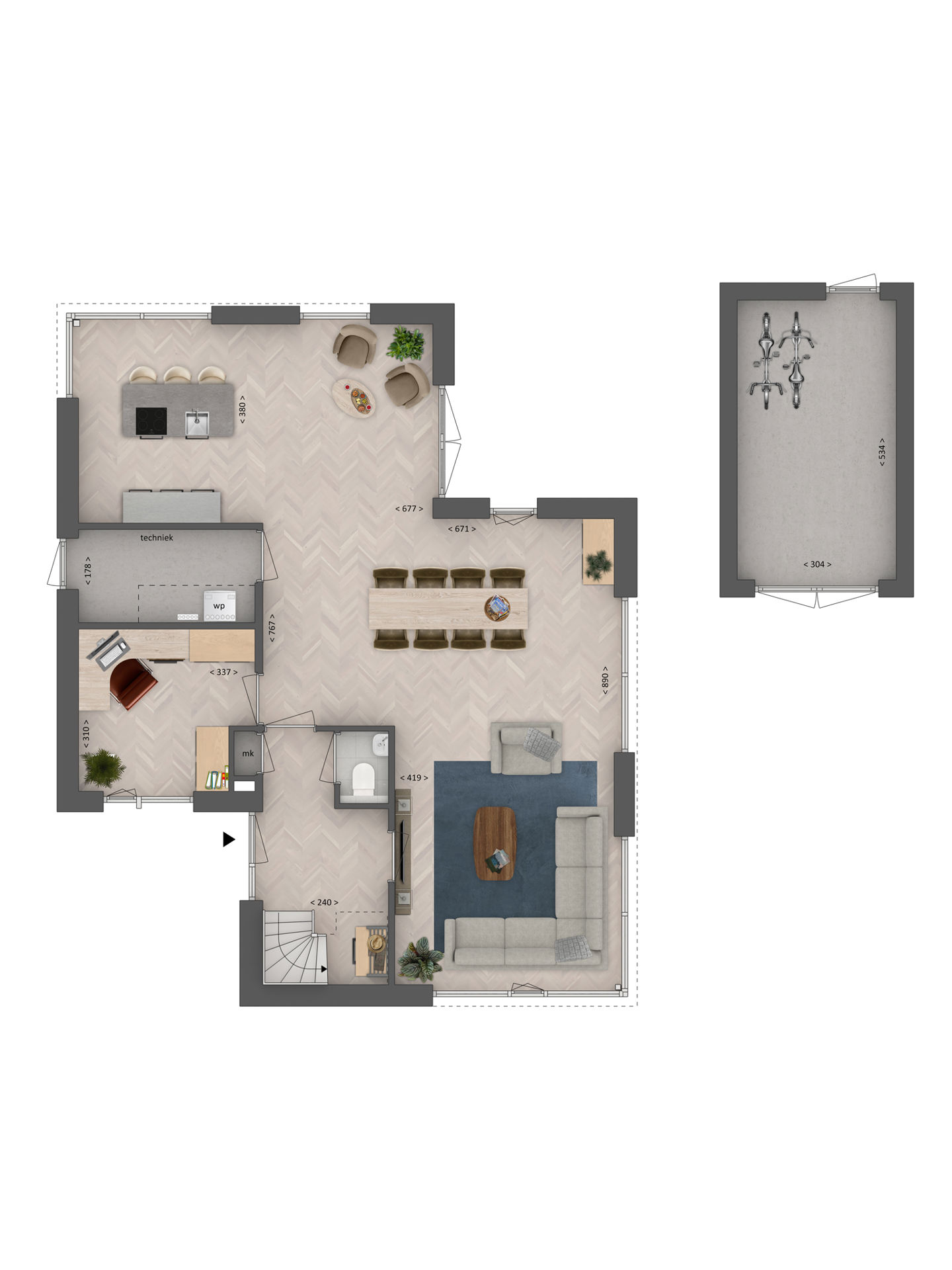 Een karakteristieke woning met houten accenten en opvallend veel raampartijen. Landelijk en toch modern. Even binnenkijken? Via de voordeur stap je de hal binnen die de begane grond als vanzelf verdeelt. In het open woongedeelte staan koken, eten en wonen gezellig met elkaar in verbinding. Vanuit de keuken heb je toegang tot de ruime tuin op het zuid-oosten en alle extra voorraad sla je gemakkelijk op in de bijkeuken. Zet een lekkere grote eettafel neer voor het hele gezin om lang aan te tafelen. In de woonkamer is genoeg plek voor een ruime zithoek. Hadden we de extra werkkamer al benoemd? Deze is te bereiken vanuit de woonkamer of gang en is ook om te toveren tot een fijne speelkamer voor de kinderen. De keuze is aan jou!