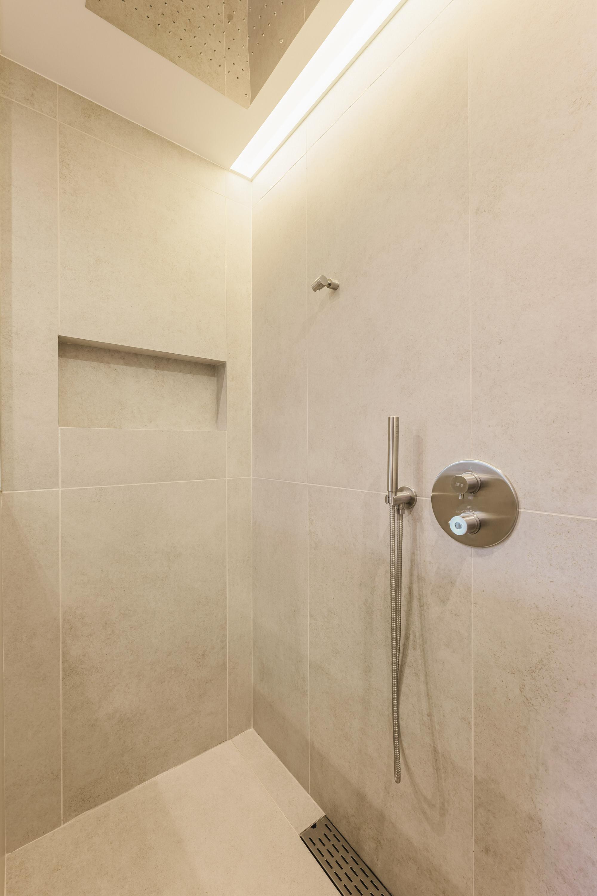 Met glazen hoek en uitzicht op tuin en zee. Badkamer met dubbele wastafel, regendouche, bidet, toilet en natuursteen.