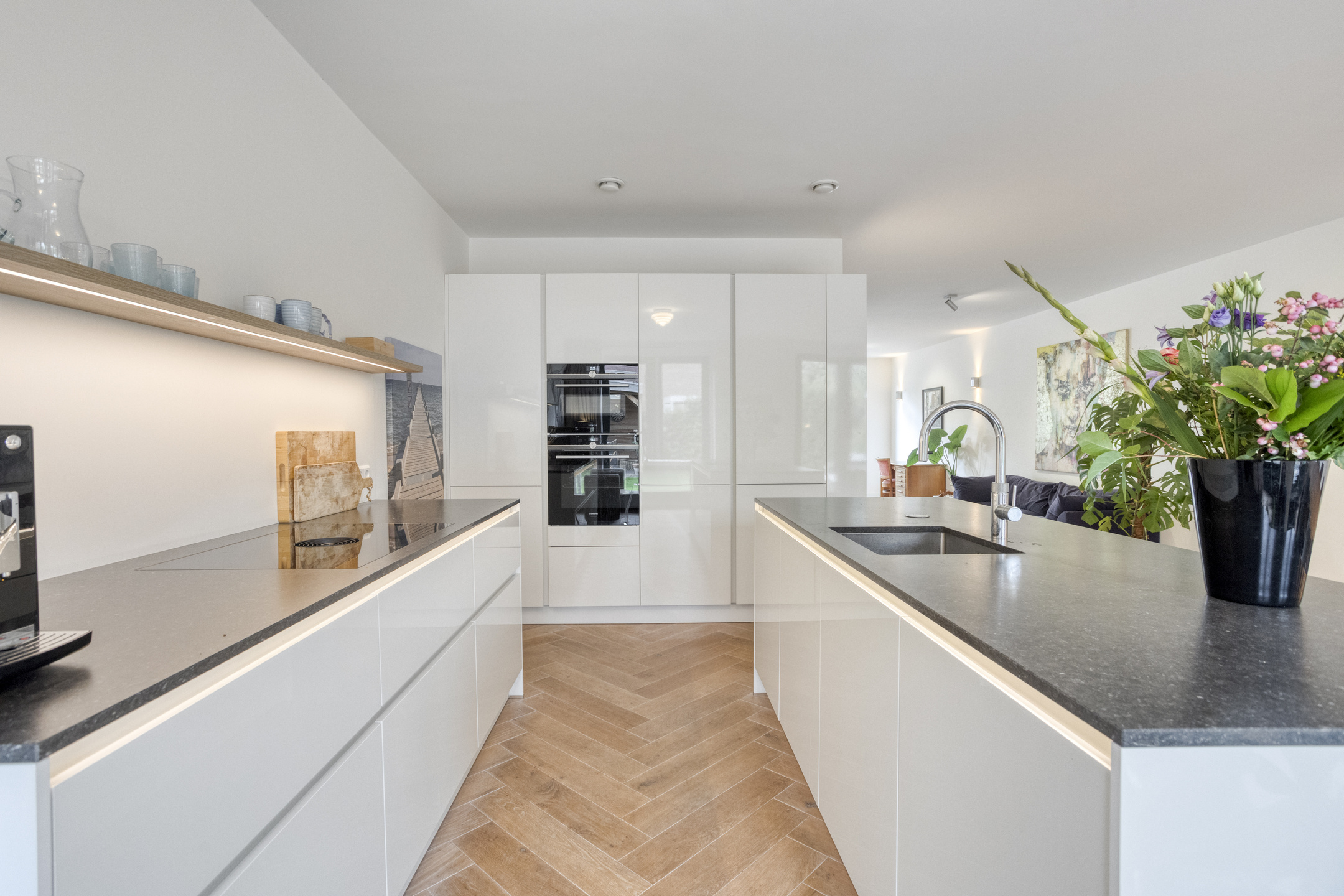 • Begane grond: entree, ruime hal met modern toilet en garderobekast onder de trap. Aan de voorzijde de lichte en ruime L-vormige woonkamer. Aan de achterzijde de riante woonkeuken met kookeiland en luxe inbouwapparatuur (dubbele oven, wijnklimaatkast, fornuis met Bora-afzuigsysteem, Quooker) met twee keer openslaande deuren naar de tuin.