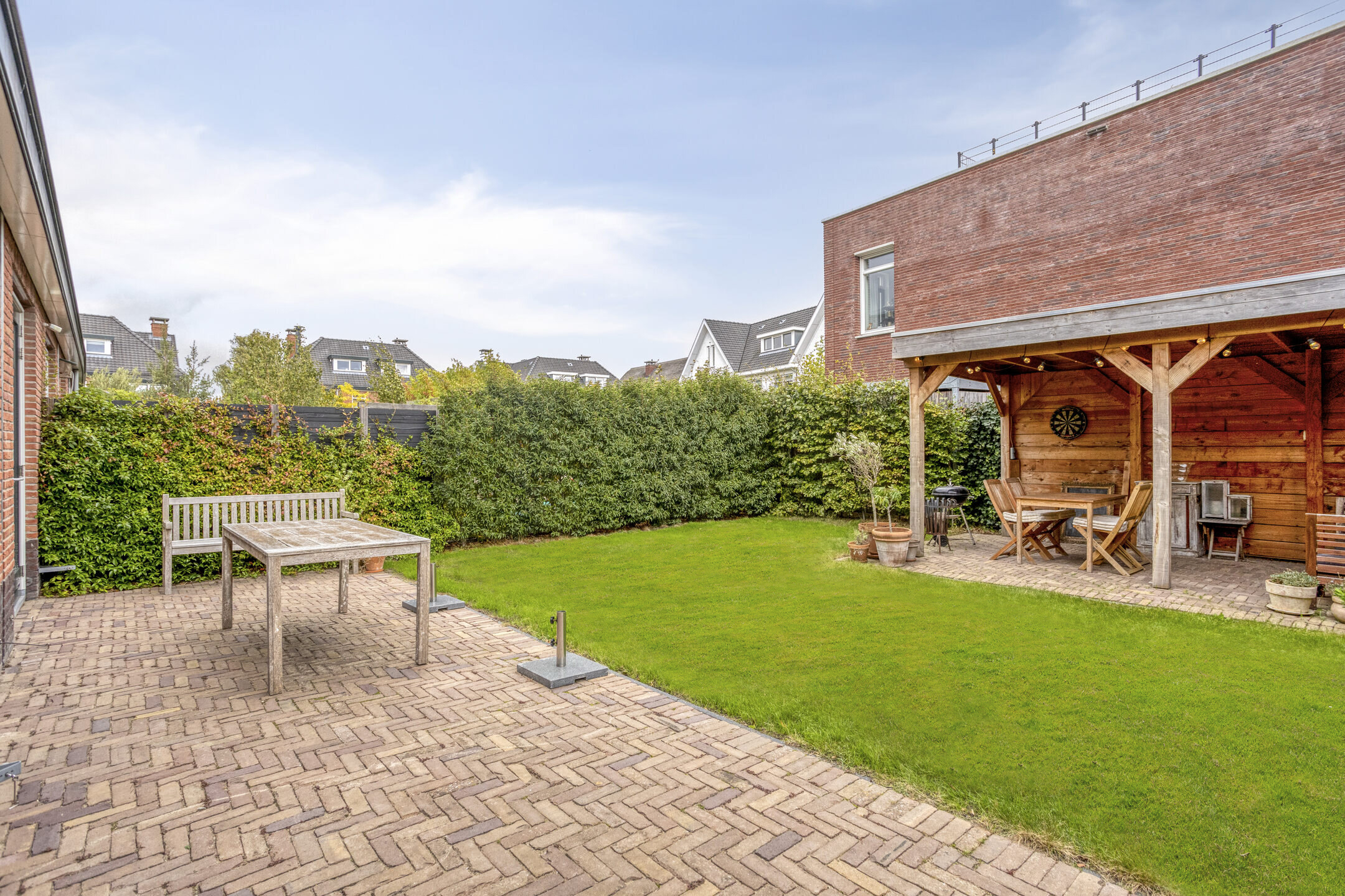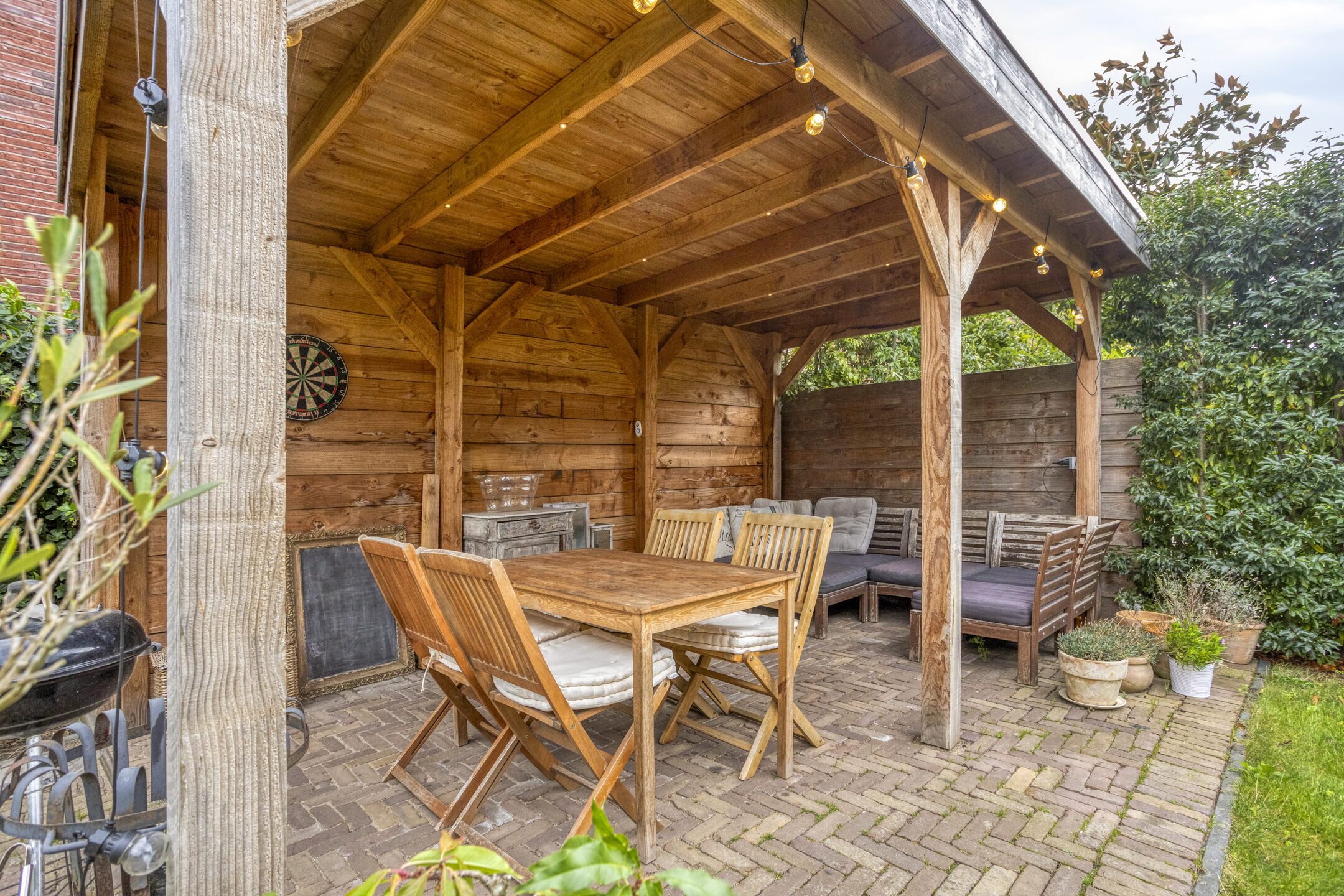 De zonnige achtertuin beschikt over een gezellig tuinhuis, ideaal voor lange zomeravonden.