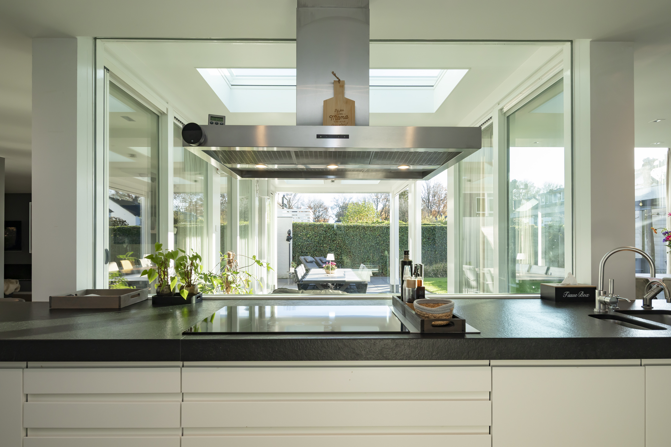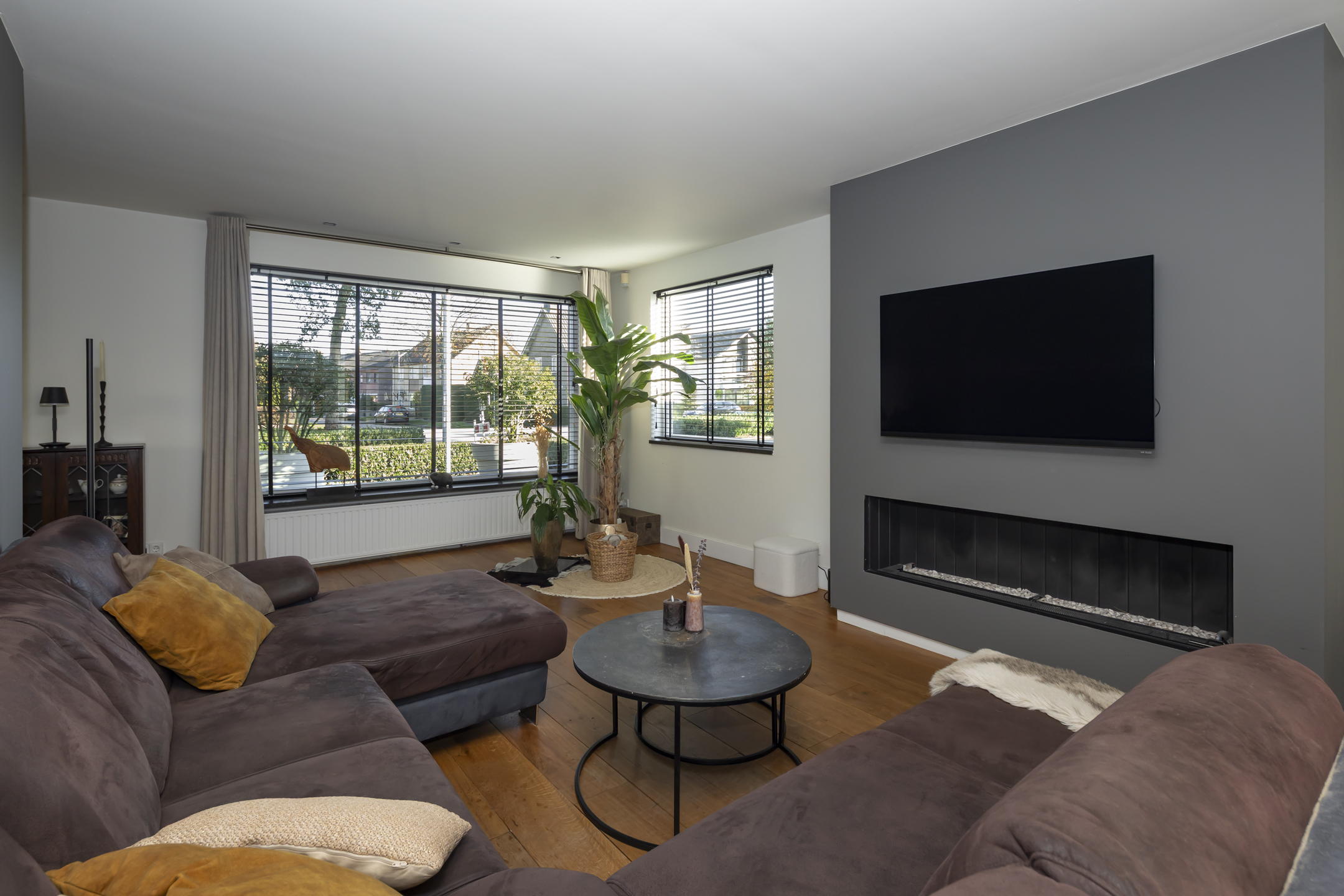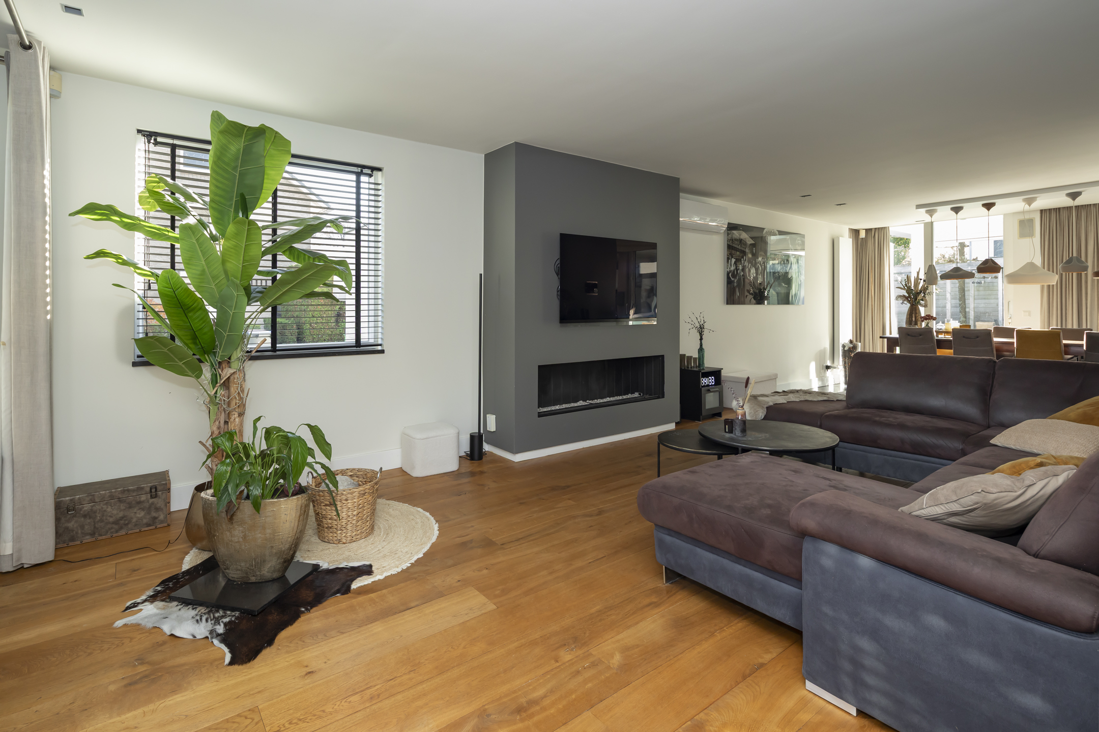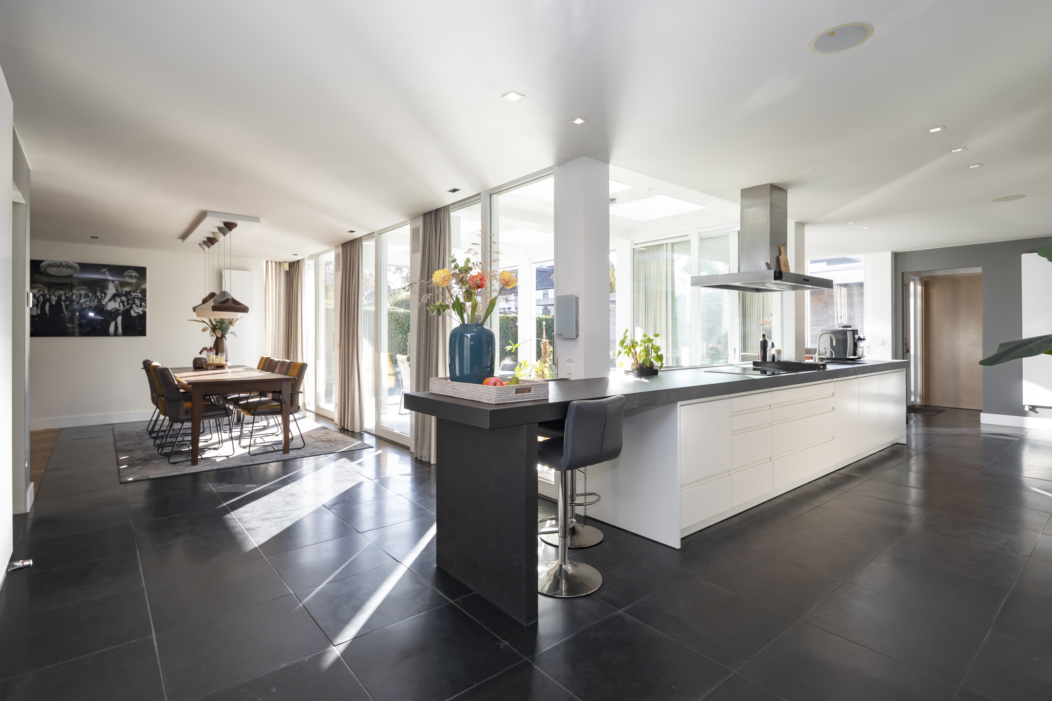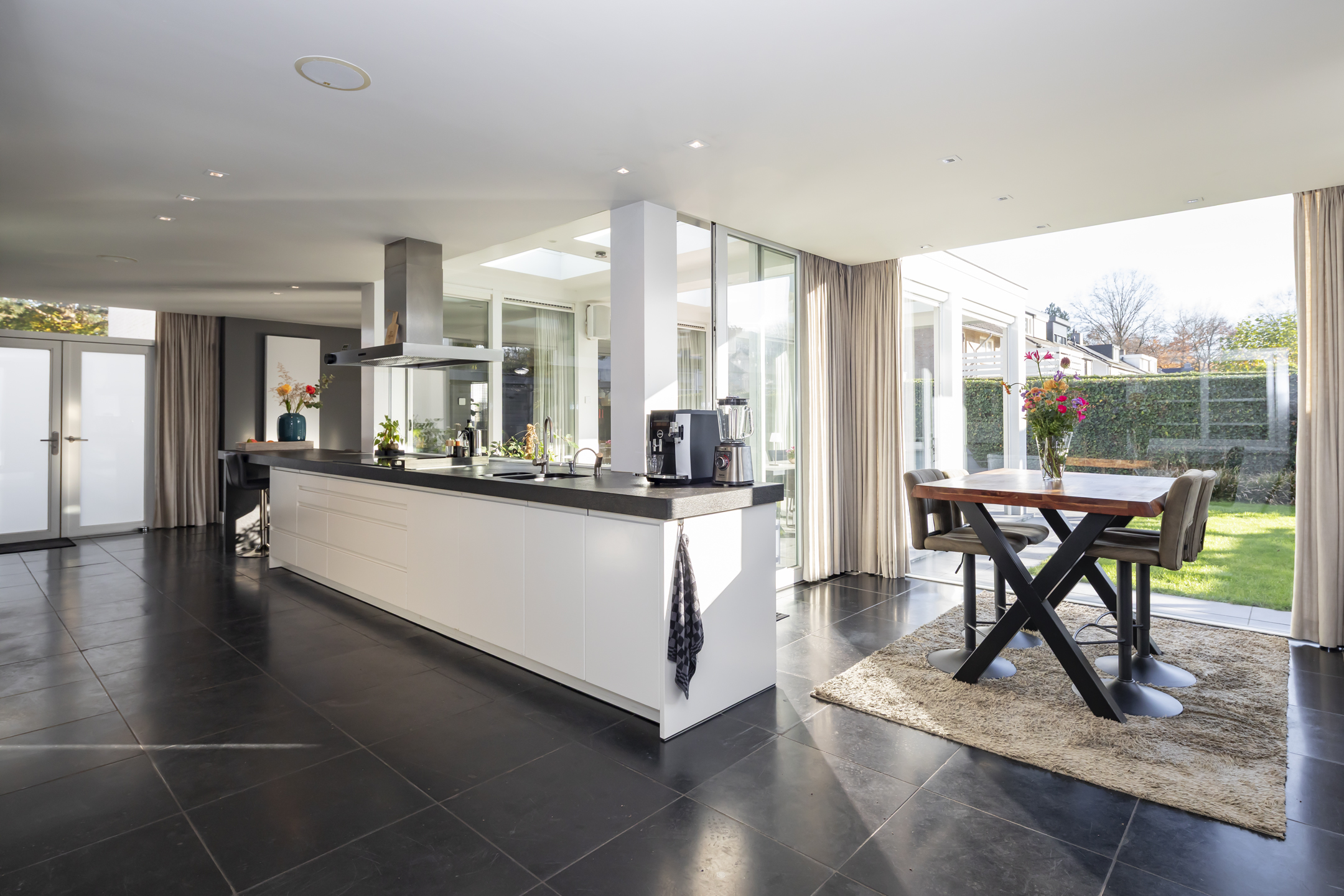Dankzij de grote raampartijen rondom is het een heerlijk licht en zonnig huis. De woonkamer staat in open verbinding met de eetkamer en de langgerekte, moderne keuken. Aan de voorzijde is een fijne plek om rustig te werken, of juist voor de kids om er heerlijk te spelen. De woonkamer is voorzien van inbouwspeakers.
