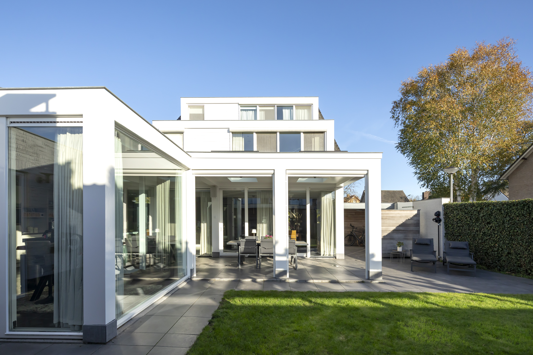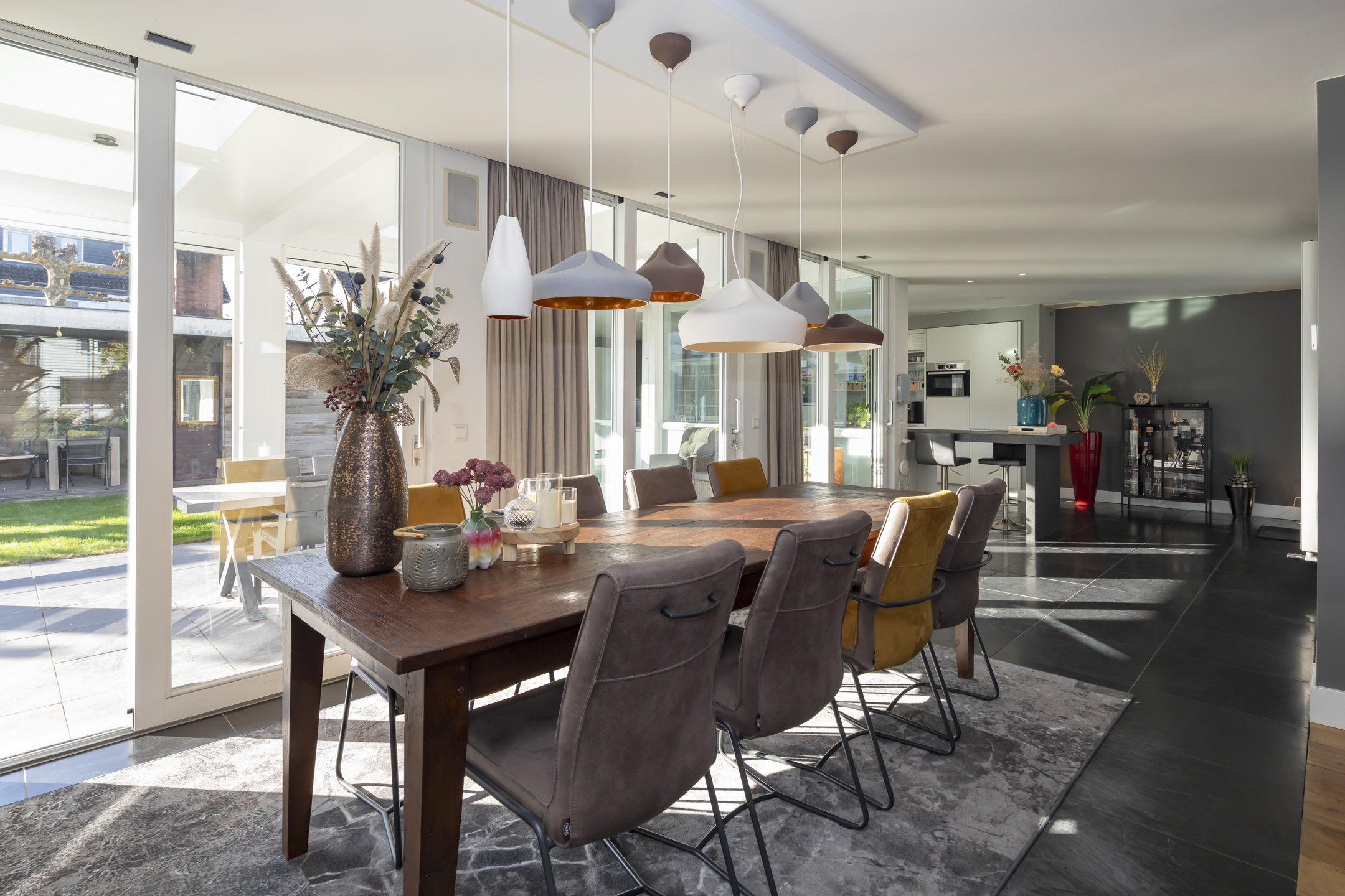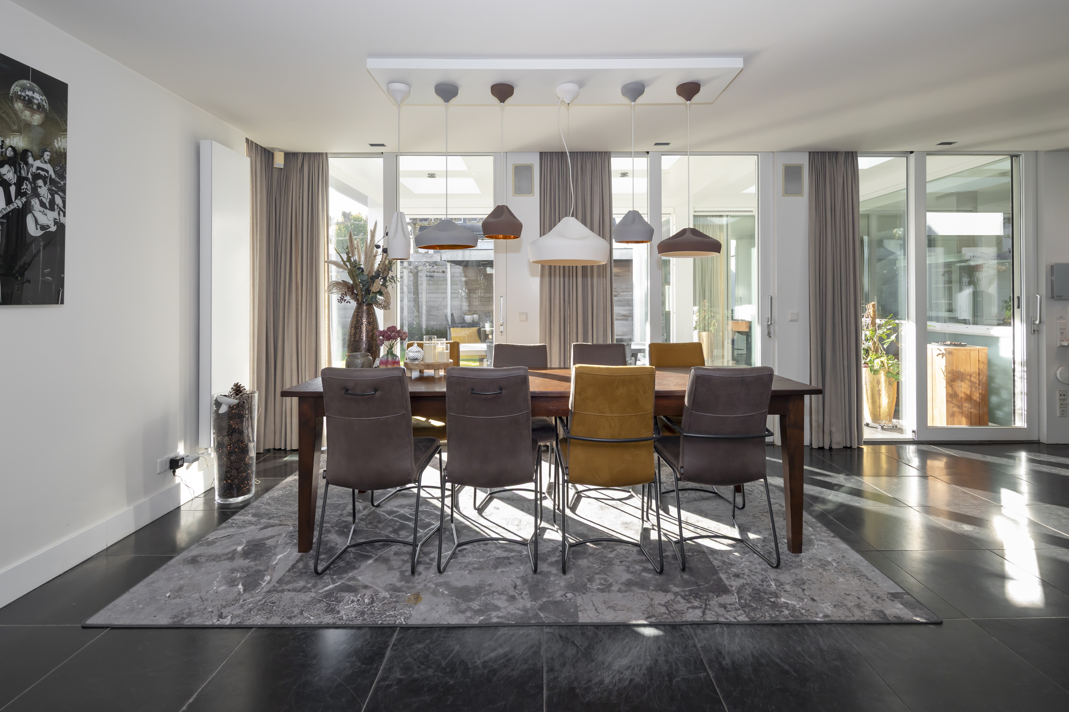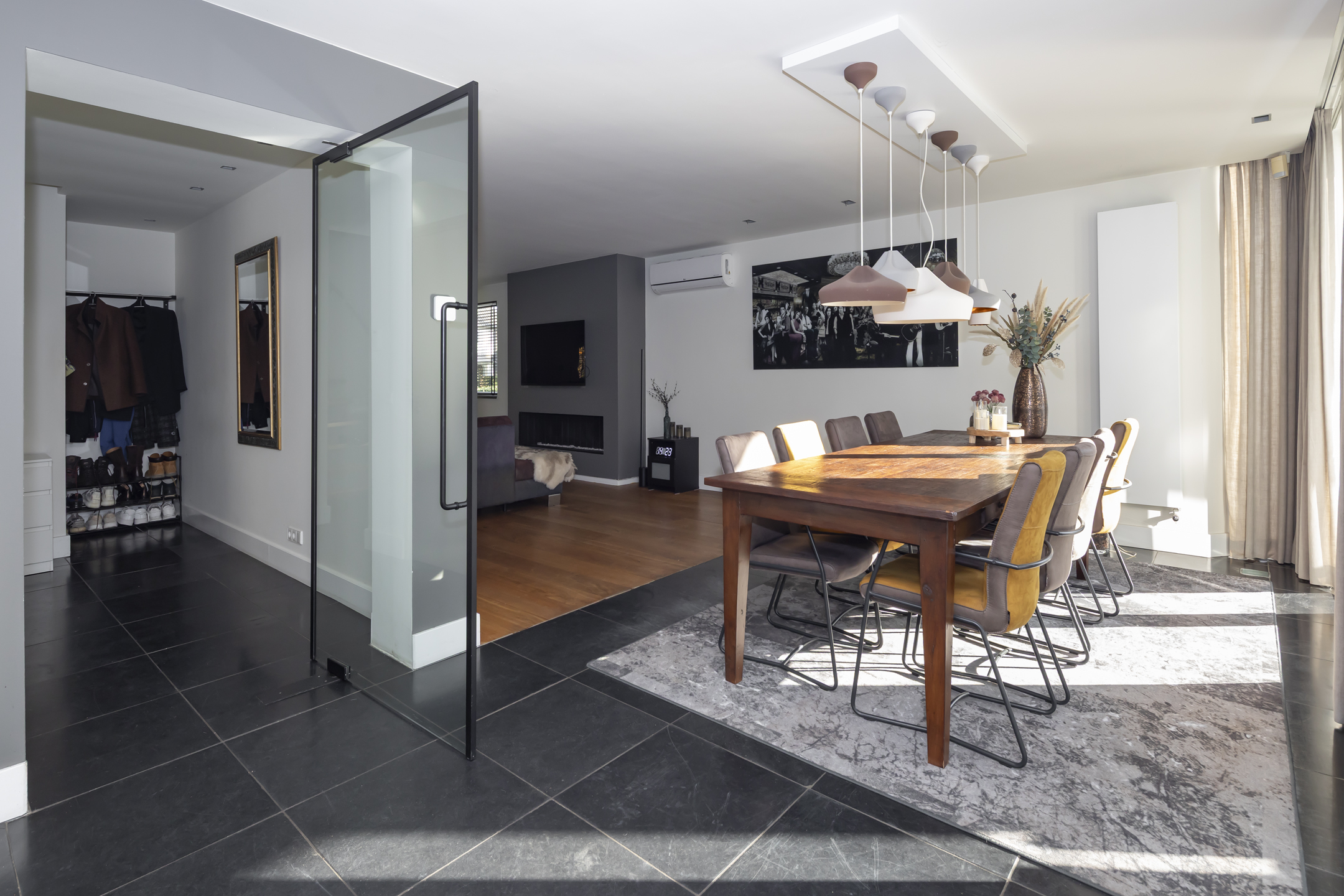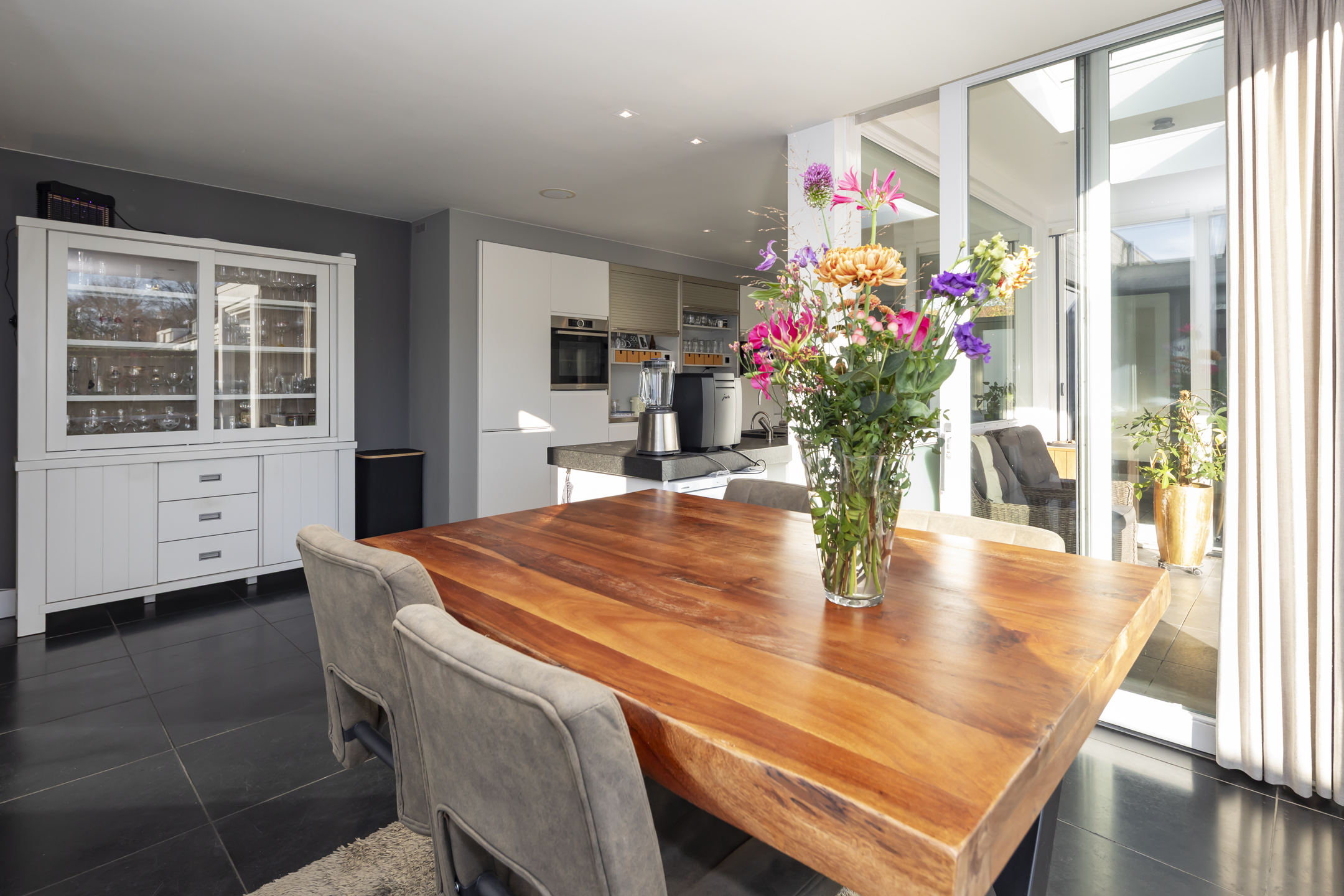 Ook direct naast de keuken, waar nu een hoge eettafel staat, is een fijne ruimte waar je heerlijk kunt zitten. Volledig door een glazen pui omsloten, dus een optimale lichtinval en zicht op de tuin.