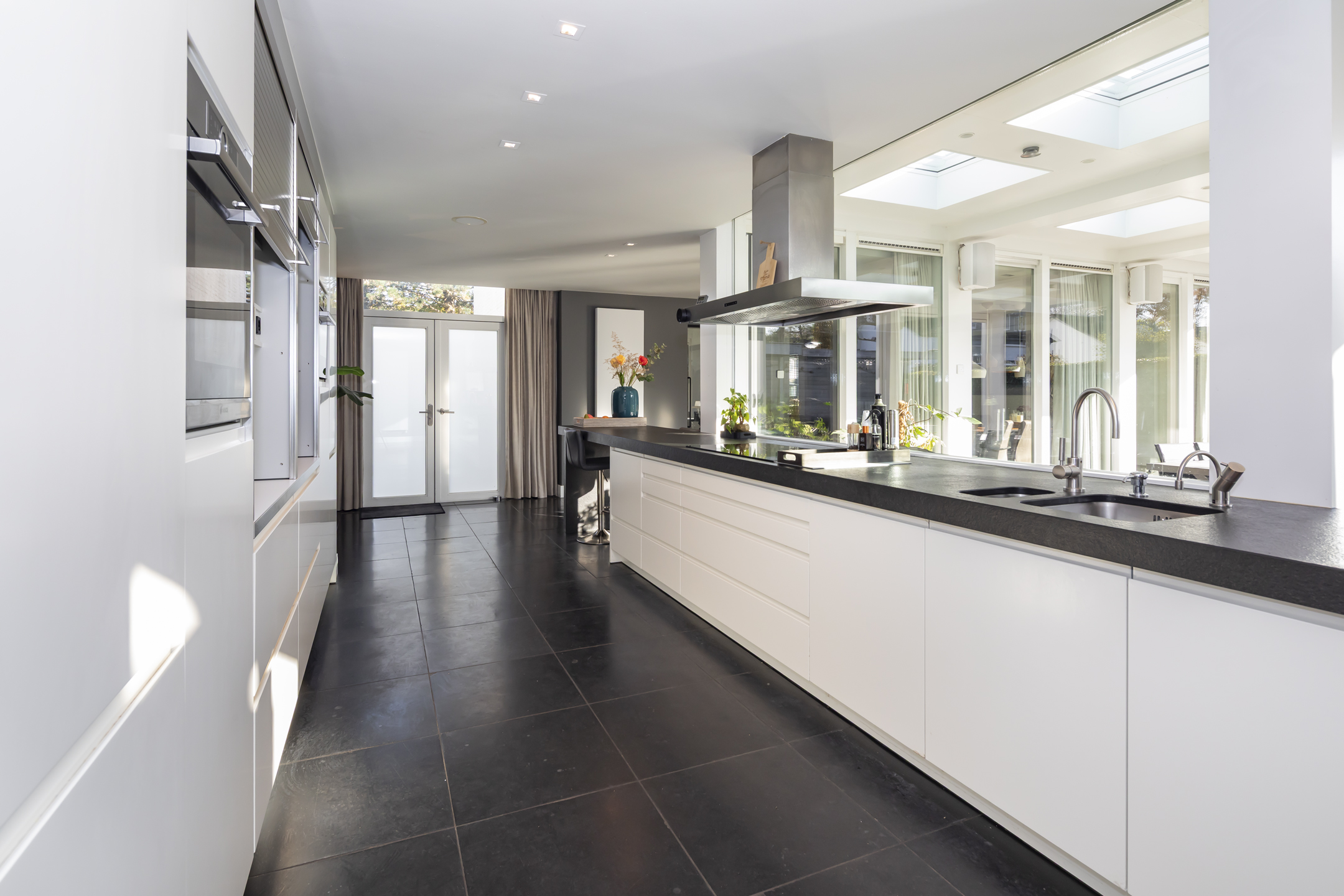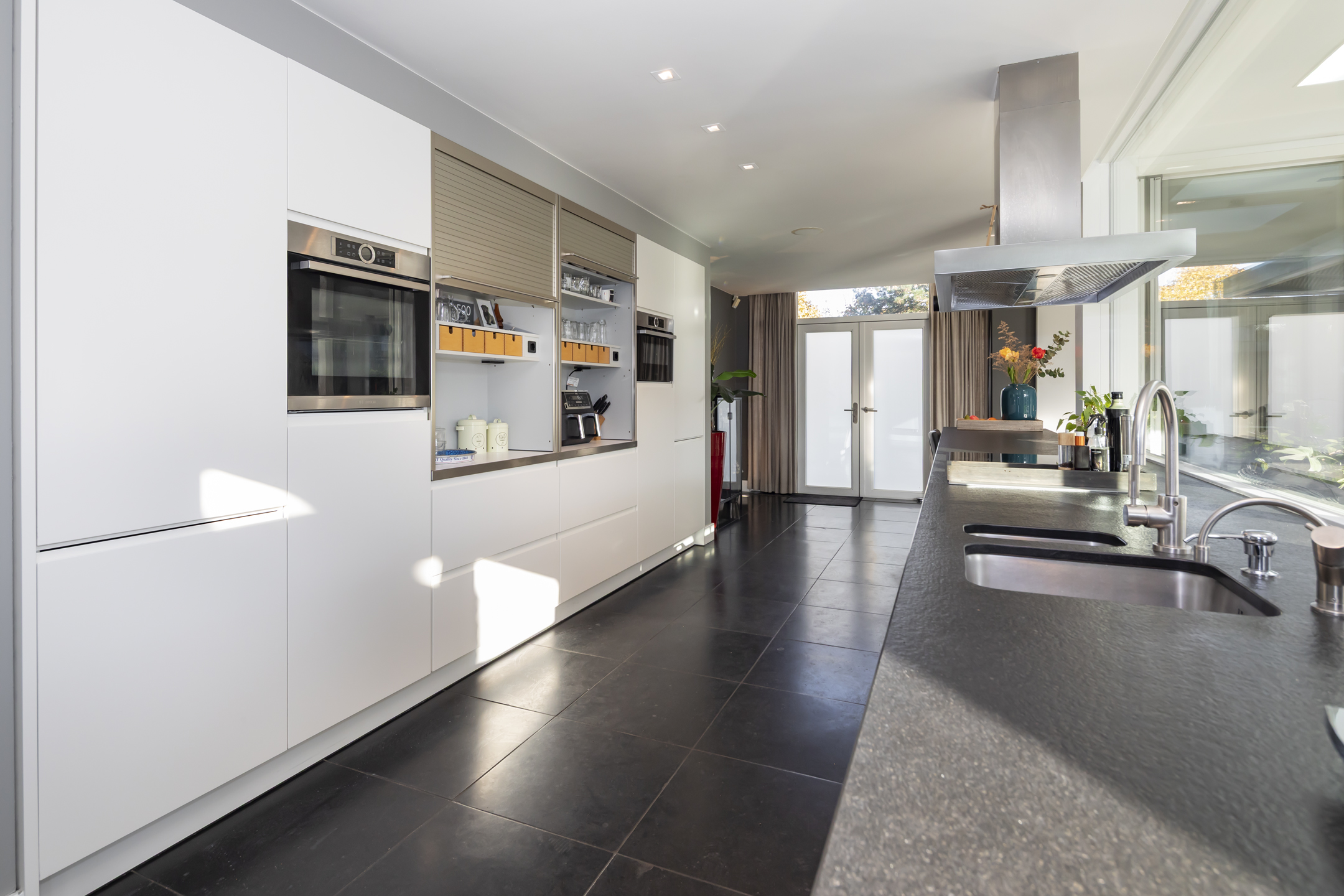 Kookliefhebbers halen hier hun hart op! Wat ’n ruimte, ruimte om te koken, meters aan werkblad, voldoende kastruimte, diverse laden, kortom hieraan geen gebrek. Ook de keuken is voorzien van inbouwspeakers in het plafond.