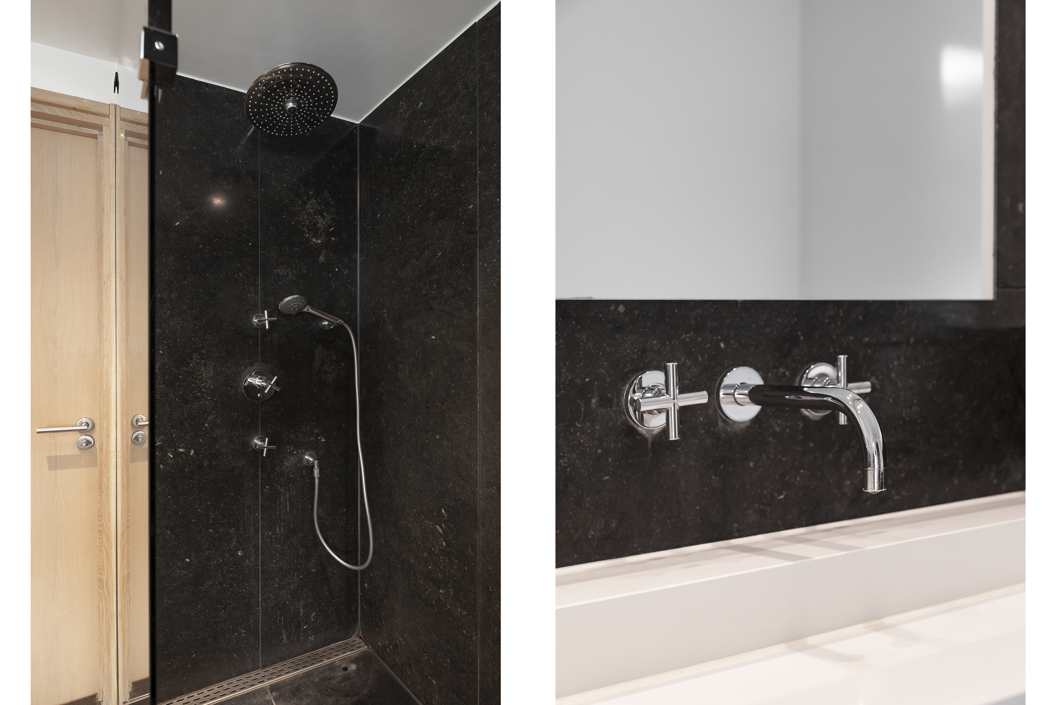 De moderne badkamer (voorzien van inbouwspeakers in het plafond) is van alle gemakken voorzien, is netjes betegeld, heeft natuurlijk daglicht en heeft vloerverwarming. Er is een dubbele wastafel, een comfortabel ligbad en een royale inloopdouche. De separate toiletruimte is via de overloop bereikbaar.