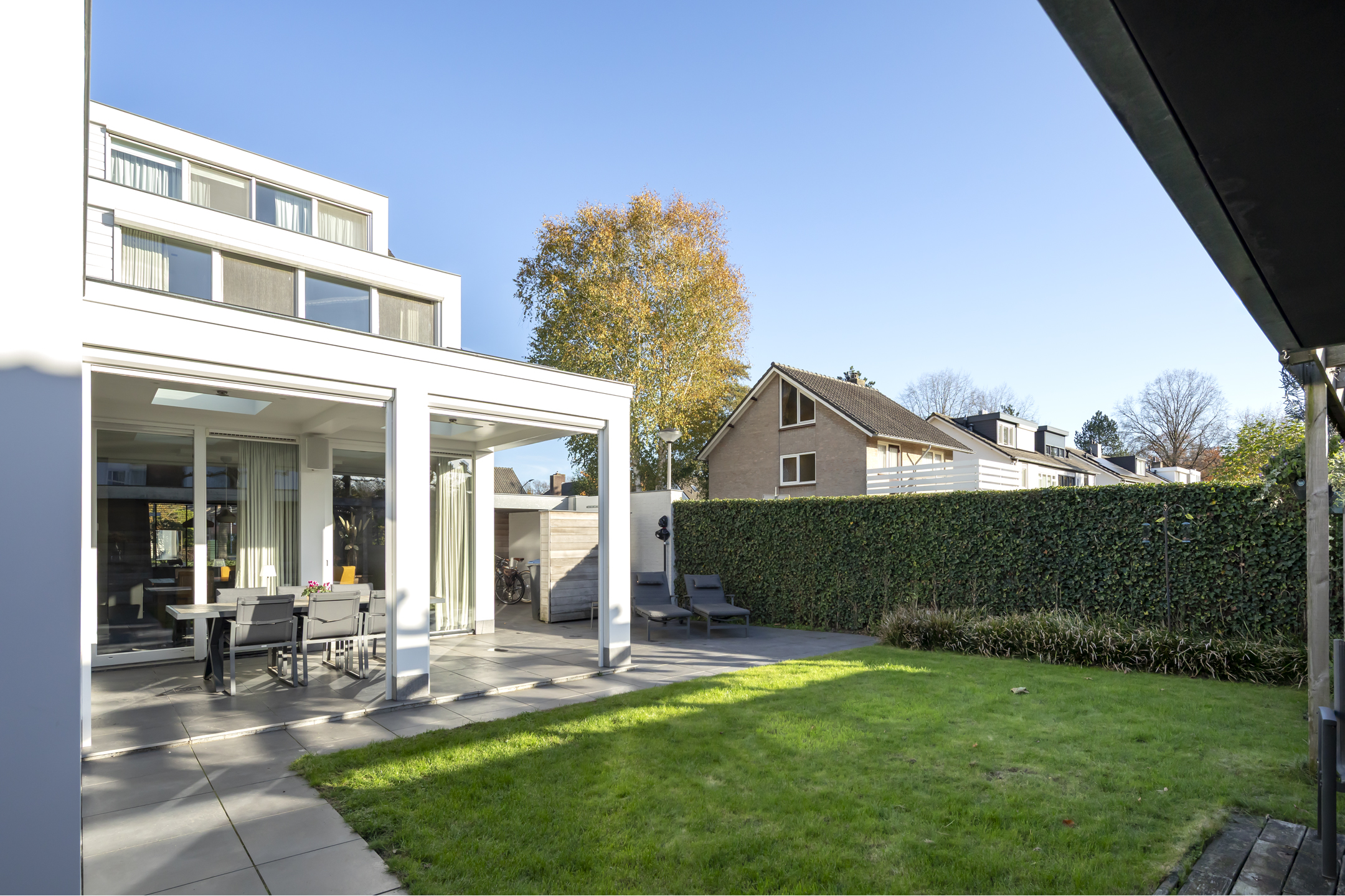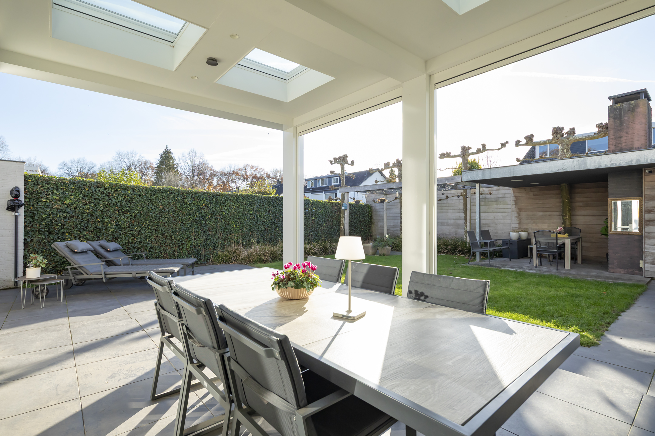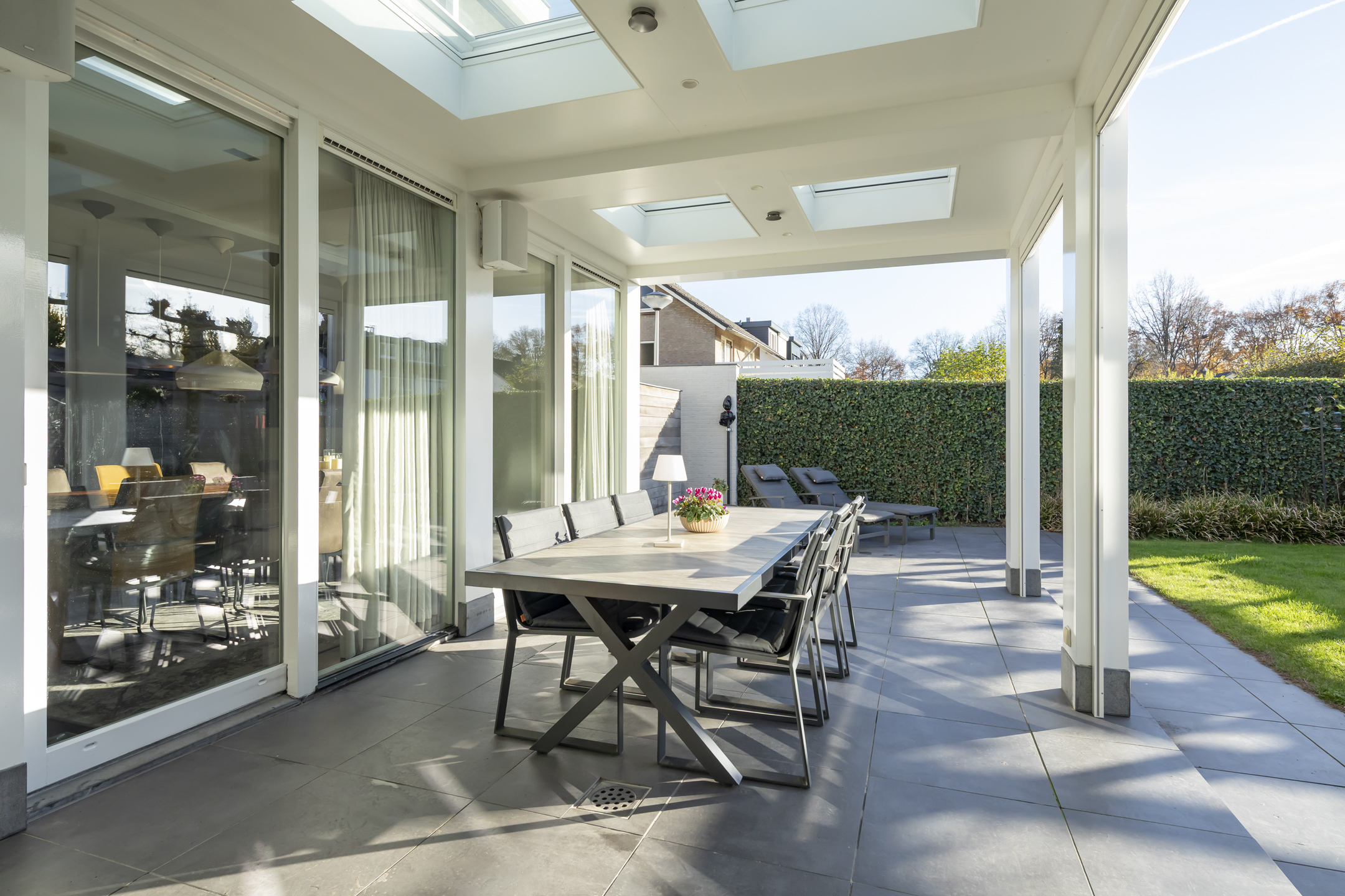 Een heerlijke tuin, gelegen op het zonnige zuidwesten. U kunt hier het hele jaar door genieten van het zonnetje, zowel onder het royale overdekte terras als in de fijne tuin. Het overdekte terras is in feite een extra tuinkamer, voorzien van 8 elektrisch bedienbare Velux vlakglaskoepels, ingebouwde geluidsspeakers en elektrisch bedienbare screens waardoor u helemaal windvrij, beschut zit. De overkapping grenzend aan het huis is ca. 25 m2 groot.