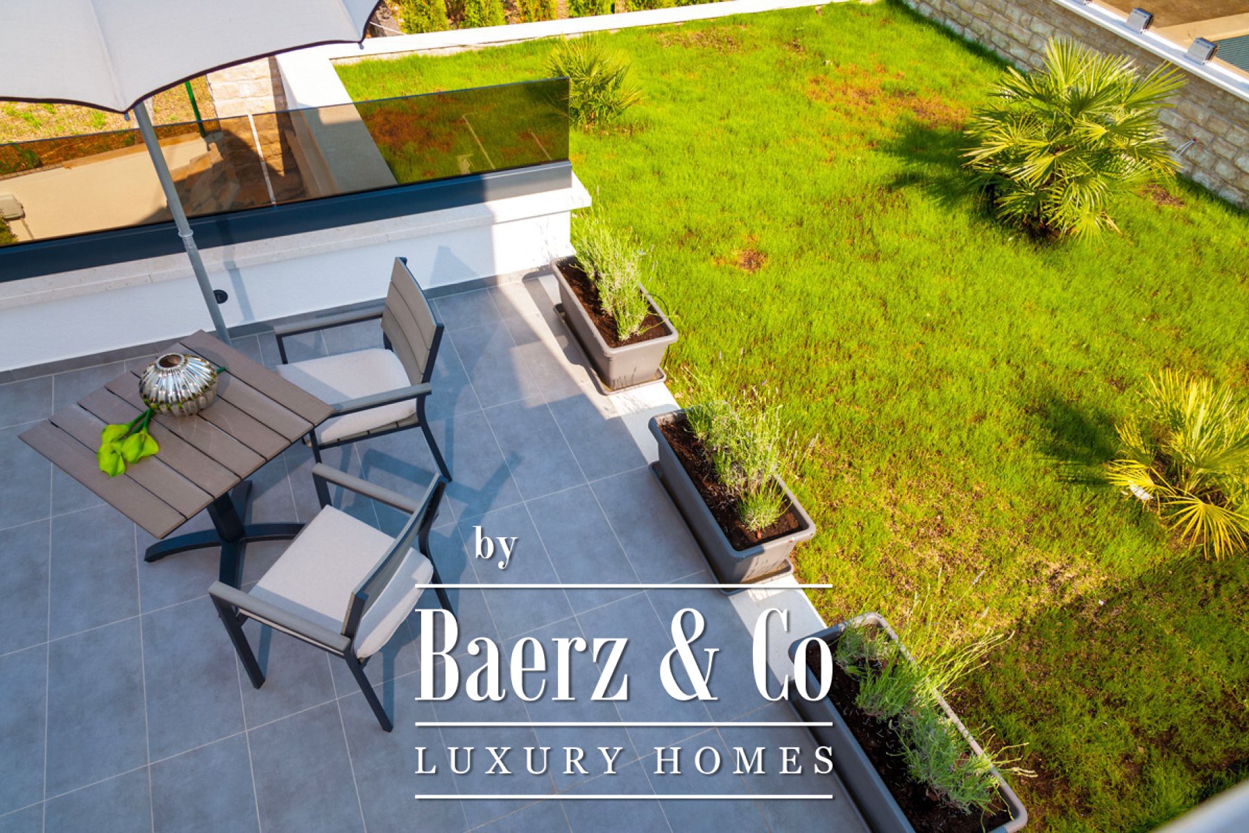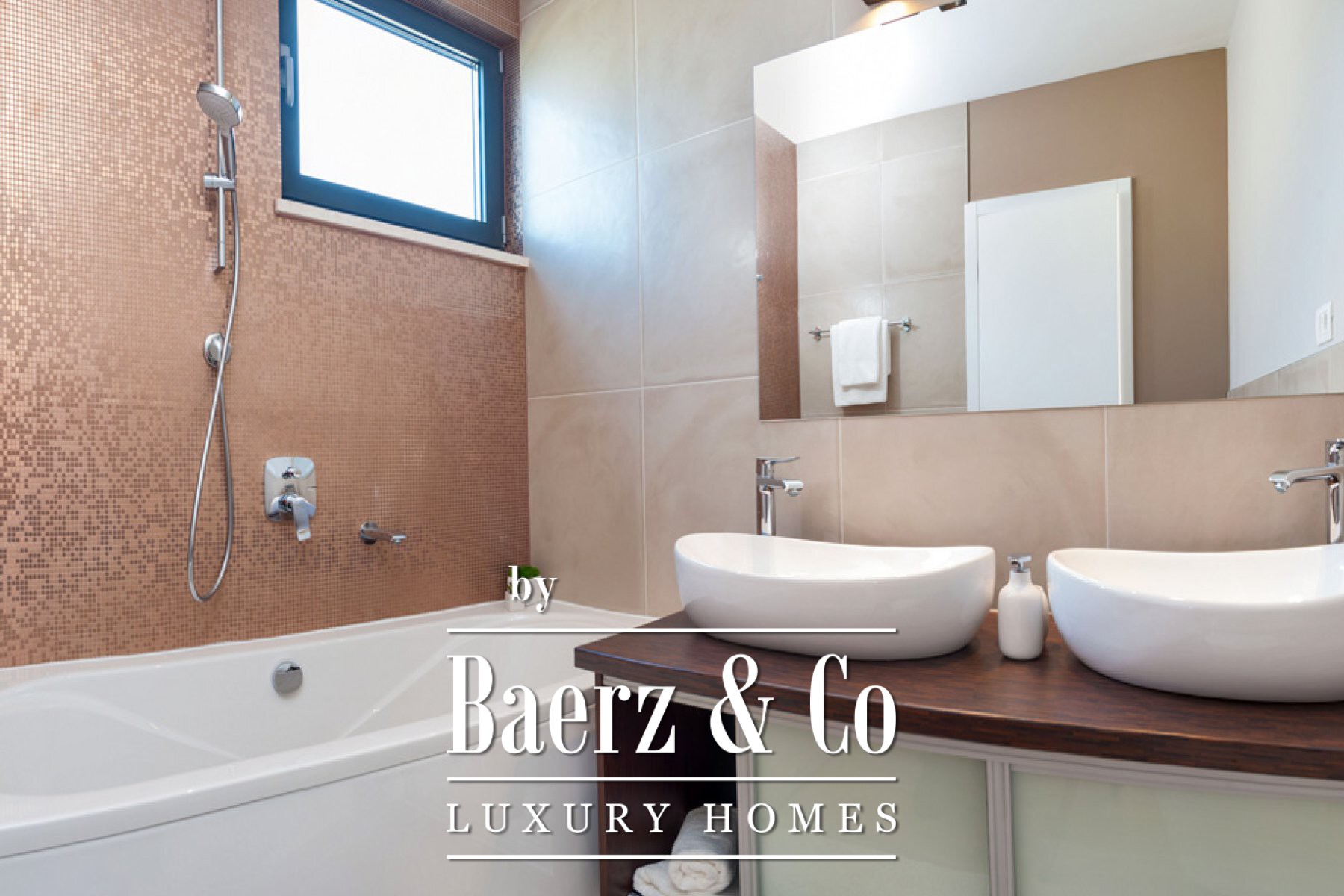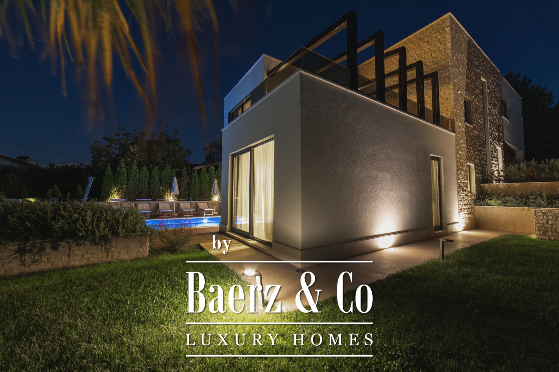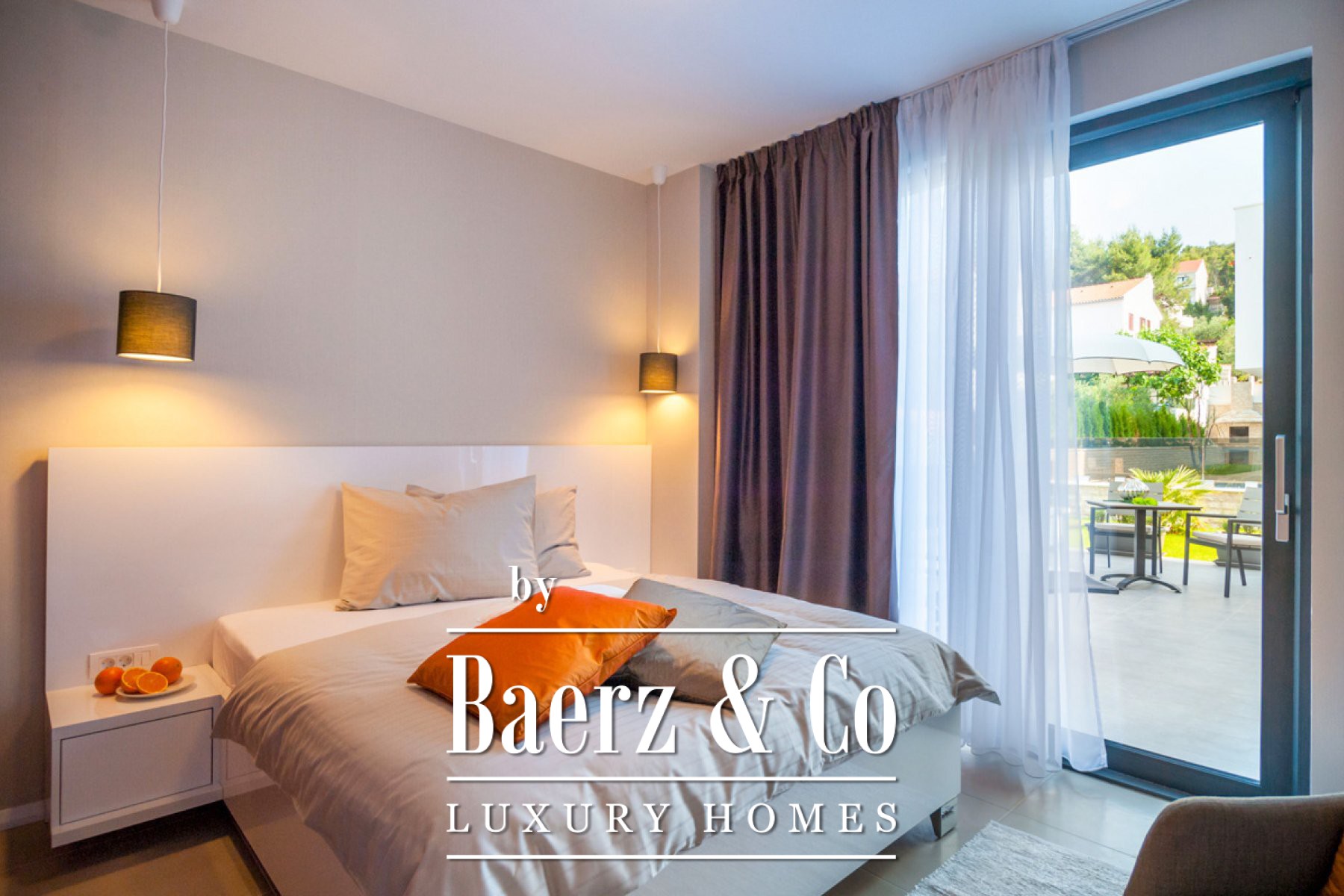 De begane grond en eerste verdieping zijn naadloos verbonden via een moderne keuken, eetkamer en een royale woonkamer. Zes slaapkamers en zeven badkamers bieden ruime accommodatie; elke ruimte is zo gepositioneerd dat het panoramische uitzichten op zee, de historische skyline van Trogir en de verre bergen optimaal omlijst. Een zonnig terras nodigt uit tot buitenleven, de besloten patio beschikt over een buitenzwembad, zonneterras en een stijlvolle barbecueplek.