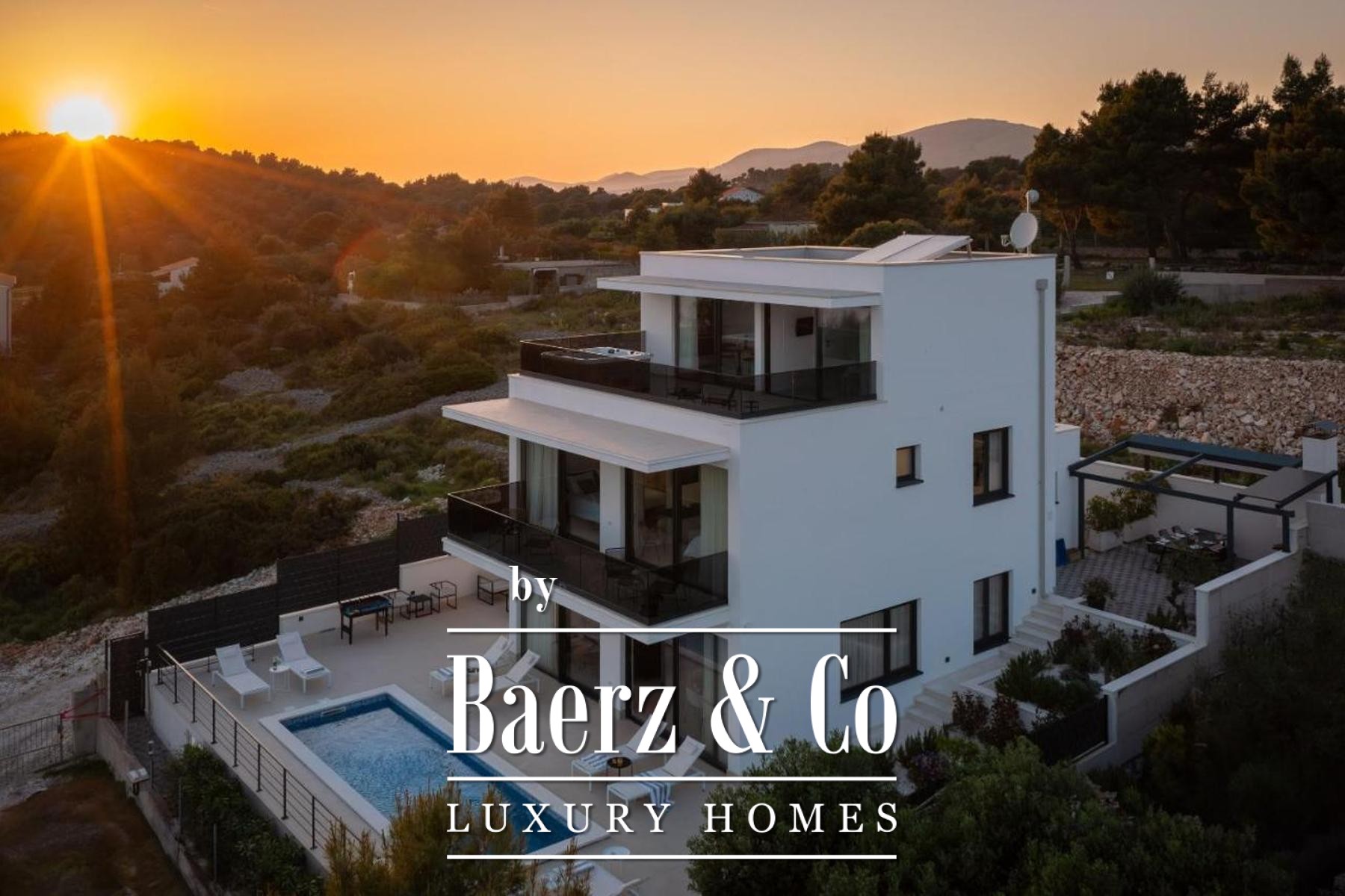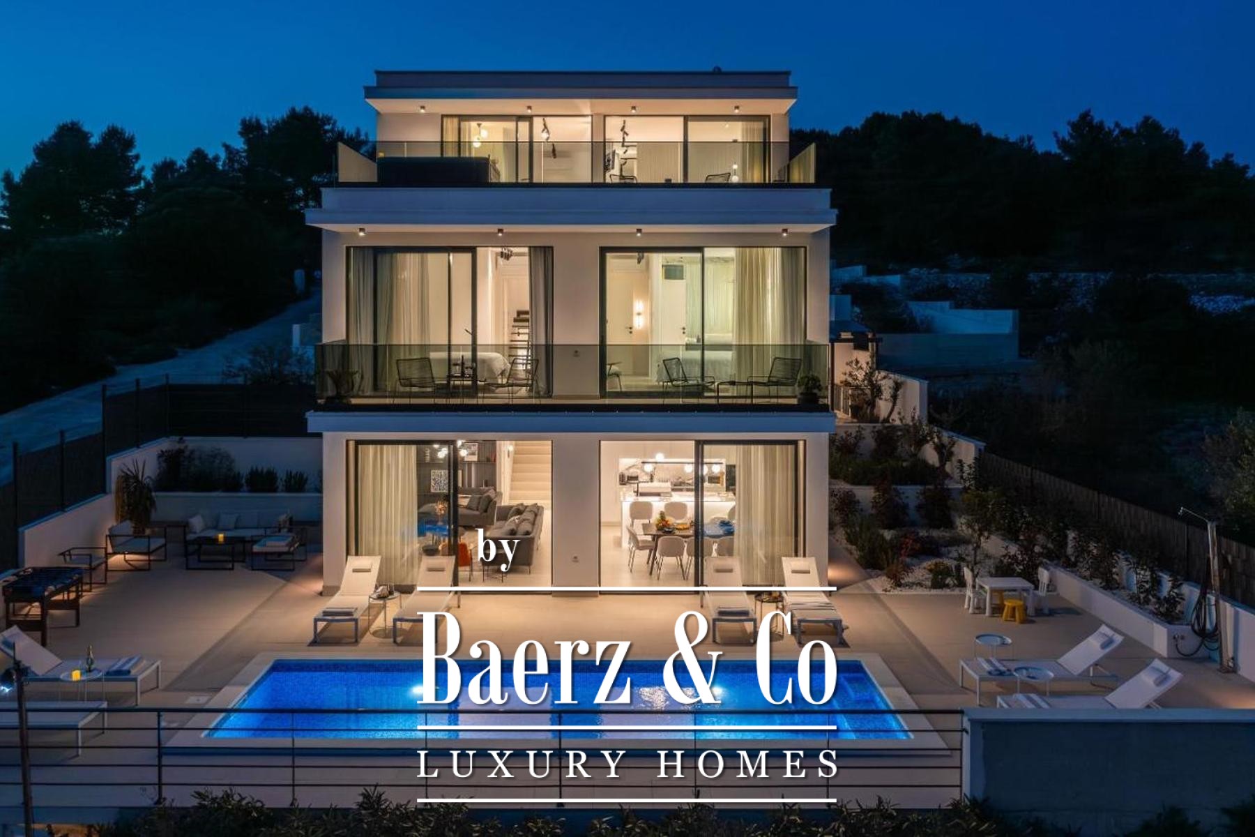 Op de verdieping zijn meerdere slaapkamers met en suite badkamers direct verbonden met de terrassen, waardoor binnencomfort naadloos overgaat in het buitenzicht. De bovenste etage biedt een ruim slaapvertrek, dressing, lounge en een terras met jacuzzi, waar u geniet van panoramisch uitzicht over de Adriatische archipel.
