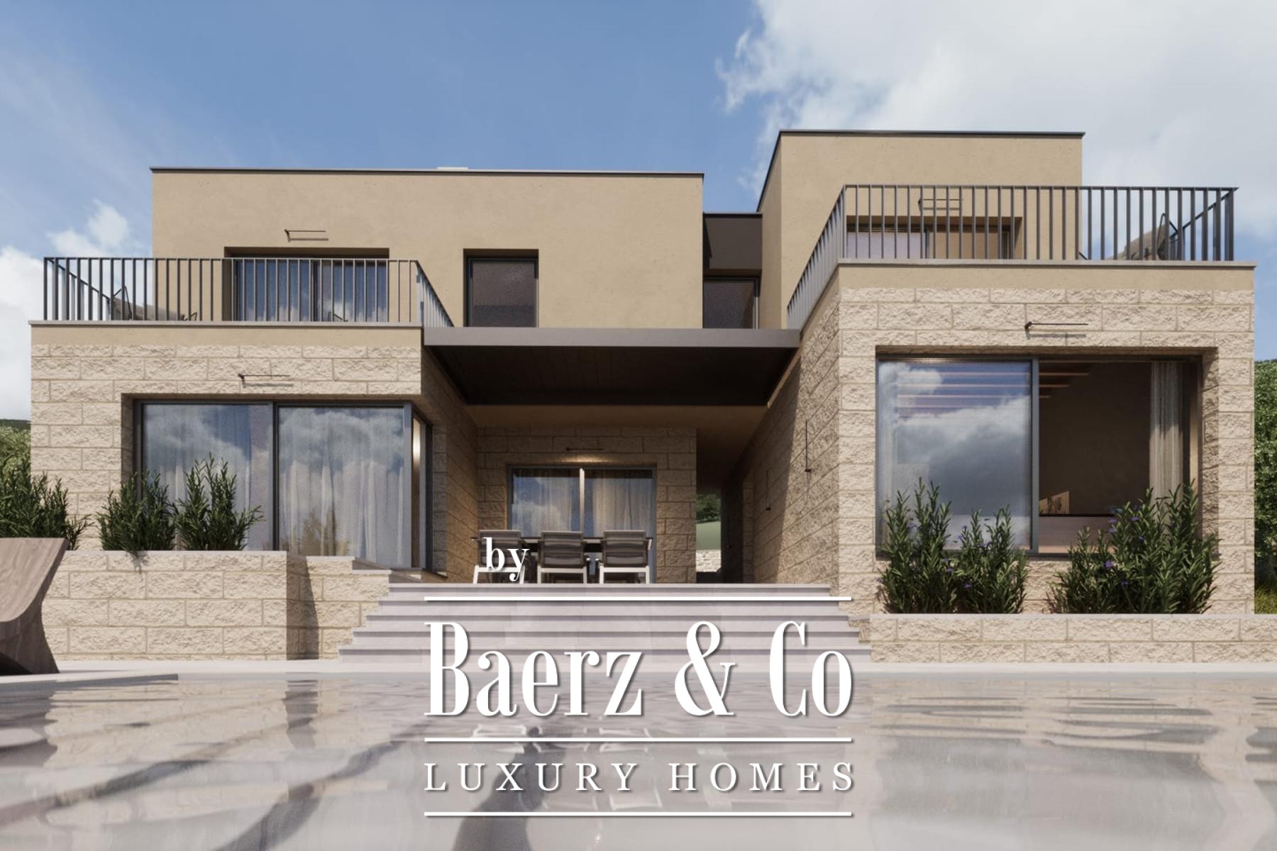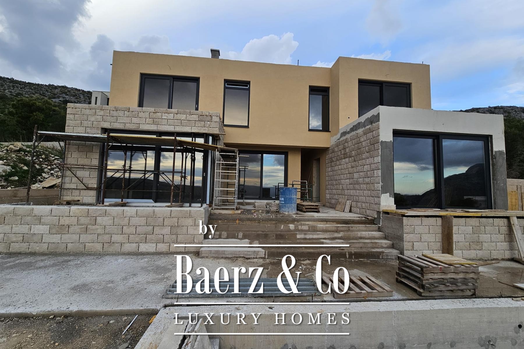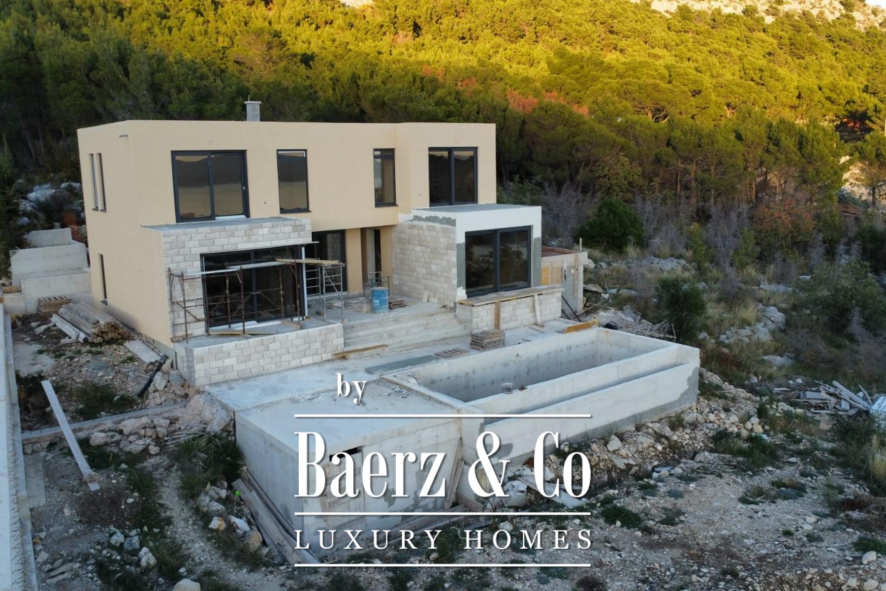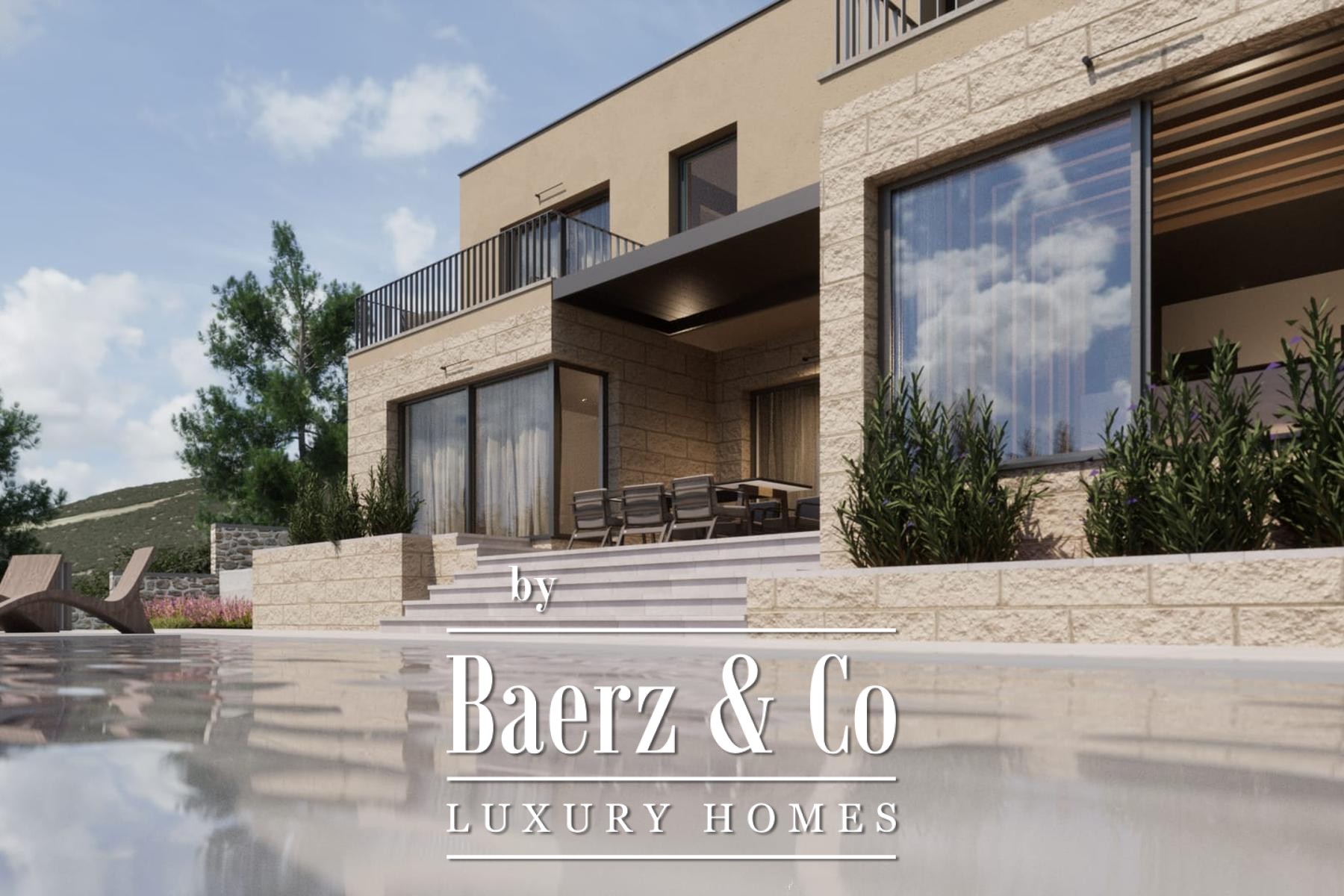 De buitenzijde combineert hedendaagse lijnen met lokale materialen zoals Brač-steen en royale glazen wanden. Buiten versterken een zonneterras, een terras met eet- en barbecuefaciliteiten, een zwembad van 32 m² en vier parkeergelegenheden het gevoel van vrijheid en ontsnapping.