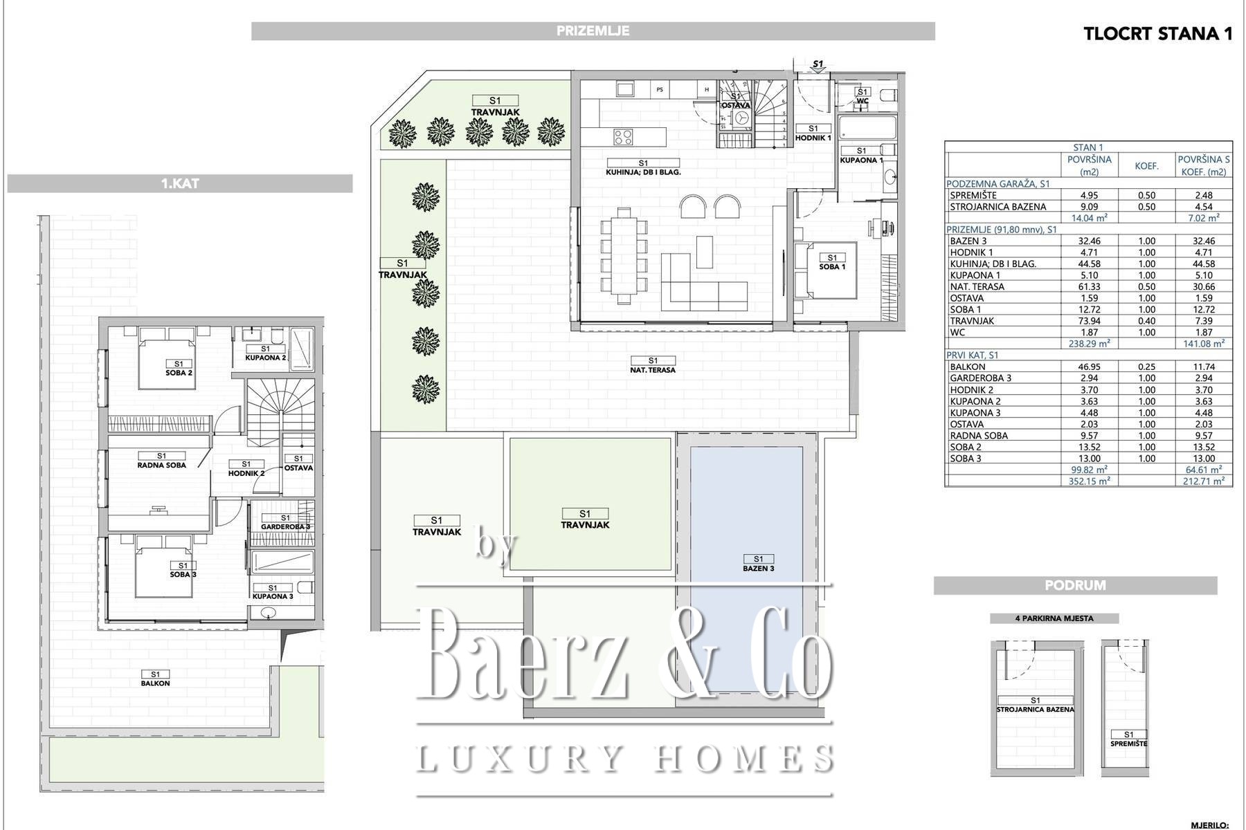 Drie slaapkamers, drie badkamers, een aparte studeerkamer en een dressing zijn aanwezig, wat een compleet geheel biedt. Afwerkingen omvatten vloerverwarming, airconditioning, elektrische zonwering, beveiligde deuren en camerabewaking. Vier parkeerplaatsen in de garage en een berging waarborgen praktisch wooncomfort. Gelegen boven het mondaine Opatija, bekend om zijn Habsburgse villa’s en levendige boulevard, biedt dit appartement een zeldzame combinatie van architecturale klasse en directe toegang tot de kust.