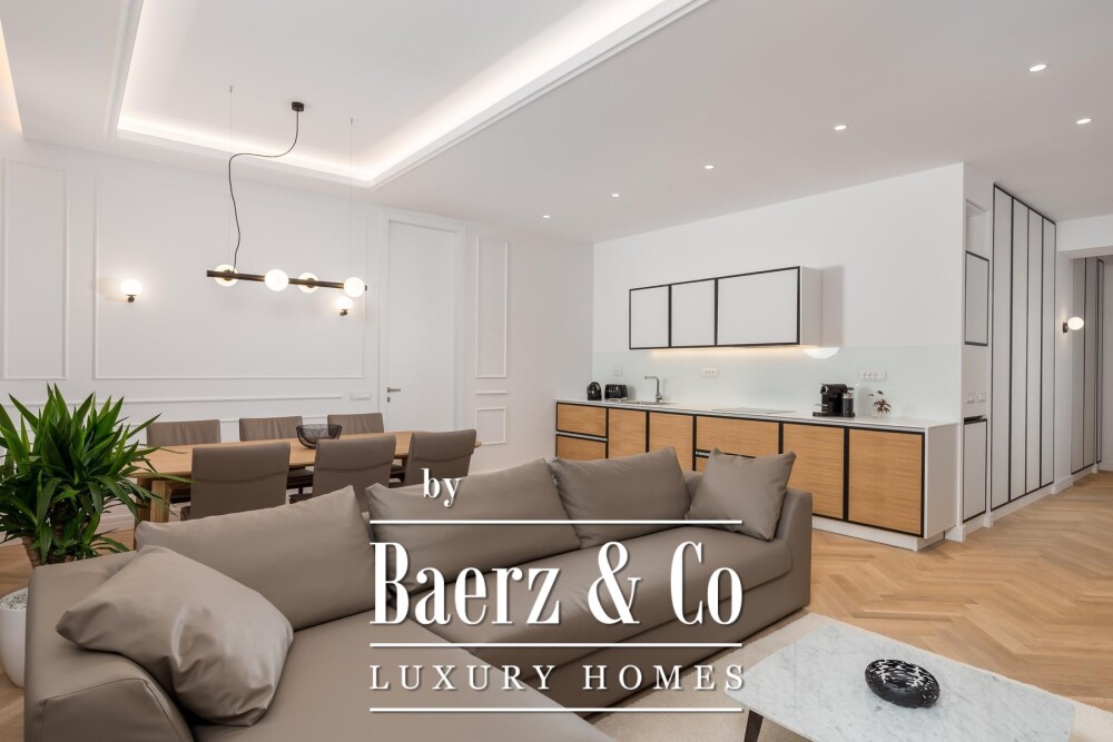 Appartement Opatija belichaamt verfijnd stedelijk wonen en biedt een zeldzaam uitzicht midden in het centrum van de stad. Deze recent gerenoveerde beganegrondwoning van 91,67 m² is met uiterste zorg voor kwaliteit en verhouding afgewerkt. Bij binnenkomst ontvouwt zich een royale hal die leidt naar de woonkamer; keuken en eetruimte zijn hier naadloos geïntegreerd, badend in natuurlijk licht en omkaderd door panoramische vergezichten over stad en zee.