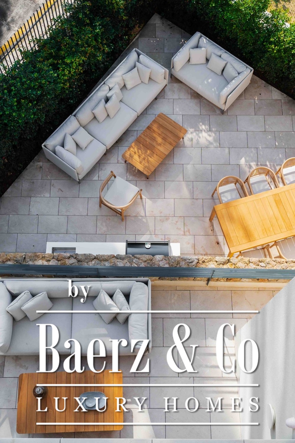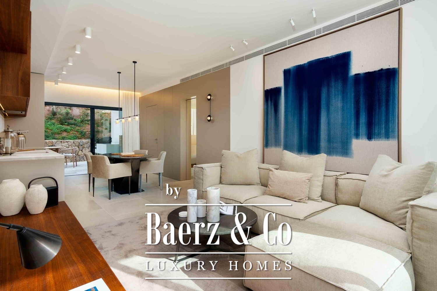 Twee smaakvol ingerichte slaapkamers en twee moderne badkamers zijn voorzien van maatwerk timmerwerk in combinatie met Italiaans meubilair van Barzaghi Salotti en Ethimo. De open woonkamer en eetgedeelte worden geankerd door een praktische keuken met Miele-apparatuur, ideaal voor dagelijkse routines en voor het ontvangen van gasten. Het privébalkon aan de voorzijde verwelkomt het ochtendlicht, terwijl het achterterras beschikt over een privézwembad en ruimte voor dineren en ontspanning, omringd door een groene, stille privétuin.