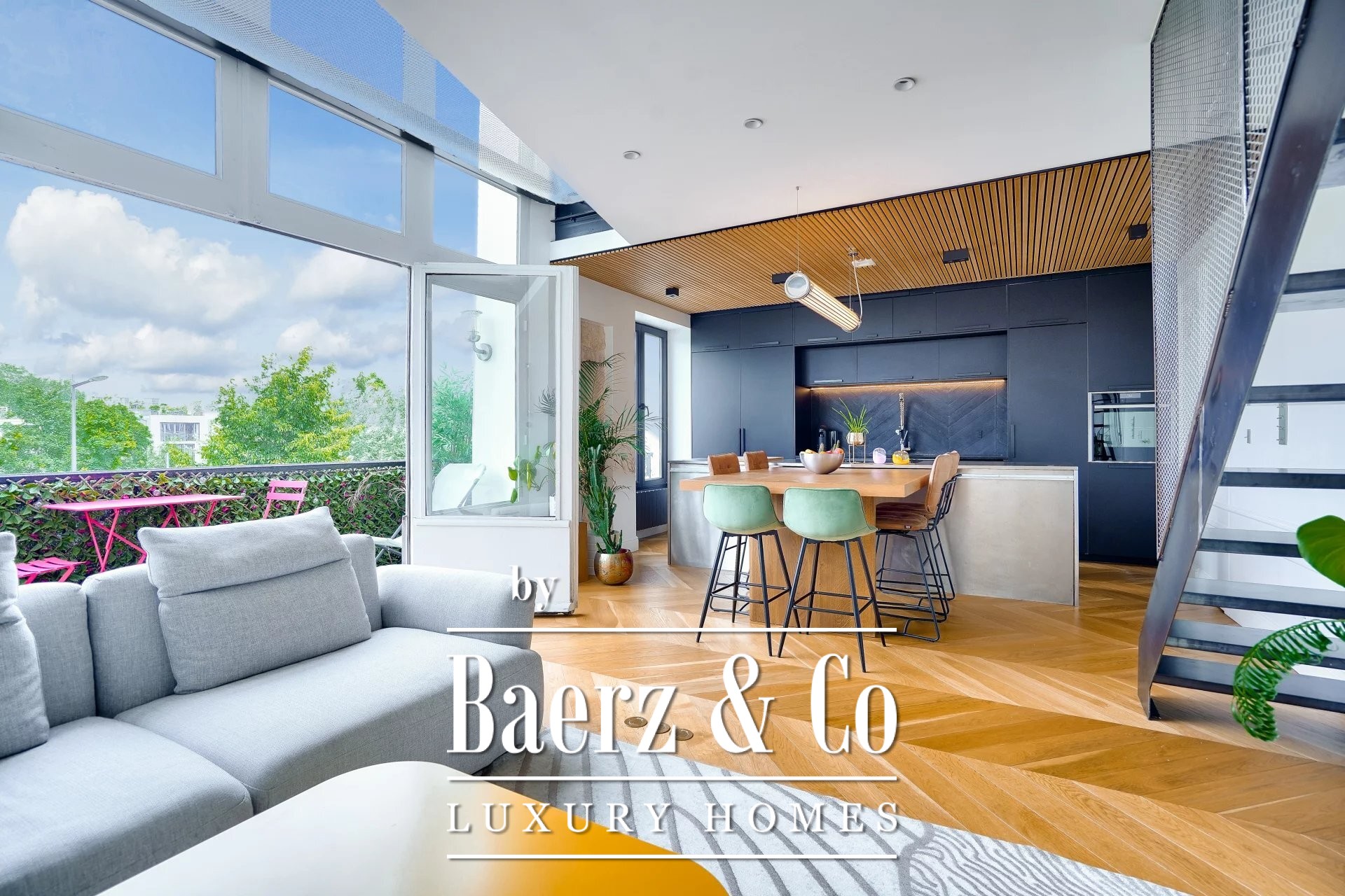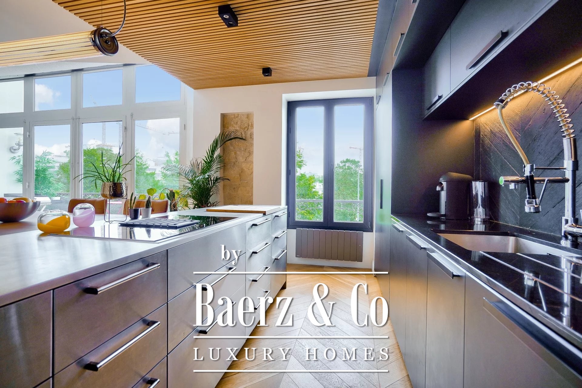 Appartement Paris 15ème biedt een uitzonderlijke woonbeleving bovenin een zorgvuldig gerenoveerd herenhuis uit 1860. Dit voormalige kunstenaarsatelier is nu een duplex van 99,59 m²—84 m² volgens Carrez—en vormt een stille verbinding tussen Parijse traditie en hedendaagse energie. Vanaf het balkon ontvouwen zich vergezichten over Île Seguin, waar zowel het stadsritme als de kalmte van de rivier zichtbaar zijn.