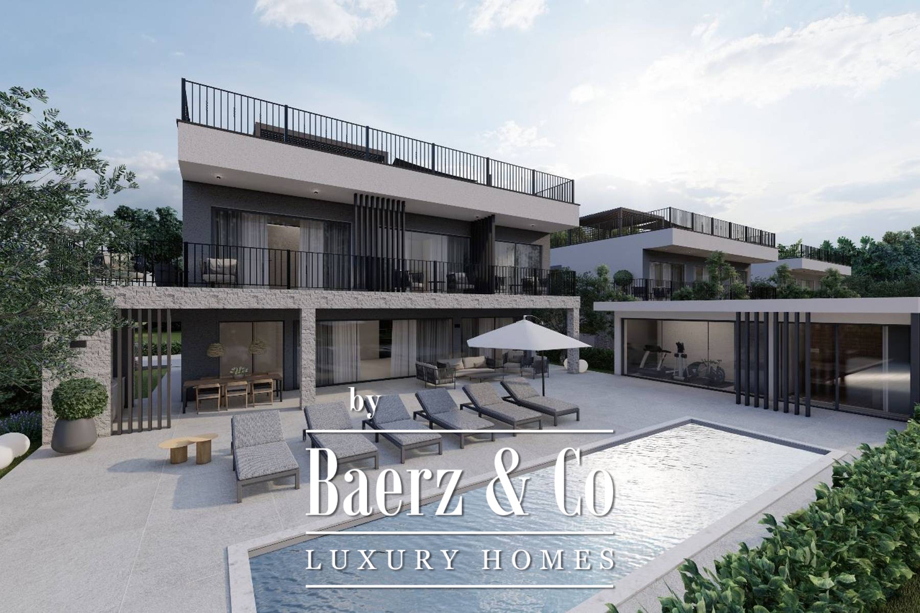 Op de eerste verdieping bieden drie slaapkamers elk een ensuite badkamer en direct toegang tot de overdekte terras. Via een buitentrap bereikt u het privé dakterras met jacuzzi en een royaal zonnegedeelte, met panoramisch uitzicht over de omgeving. Deze luxe townhouse in Poreč maakt deel uit van een exclusief ensemble van drie villa’s, waar privacy en nabijheid tot de zee samenkomen. De oplevering staat gepland voor 2024.