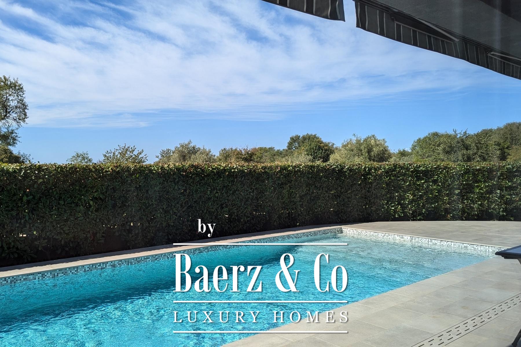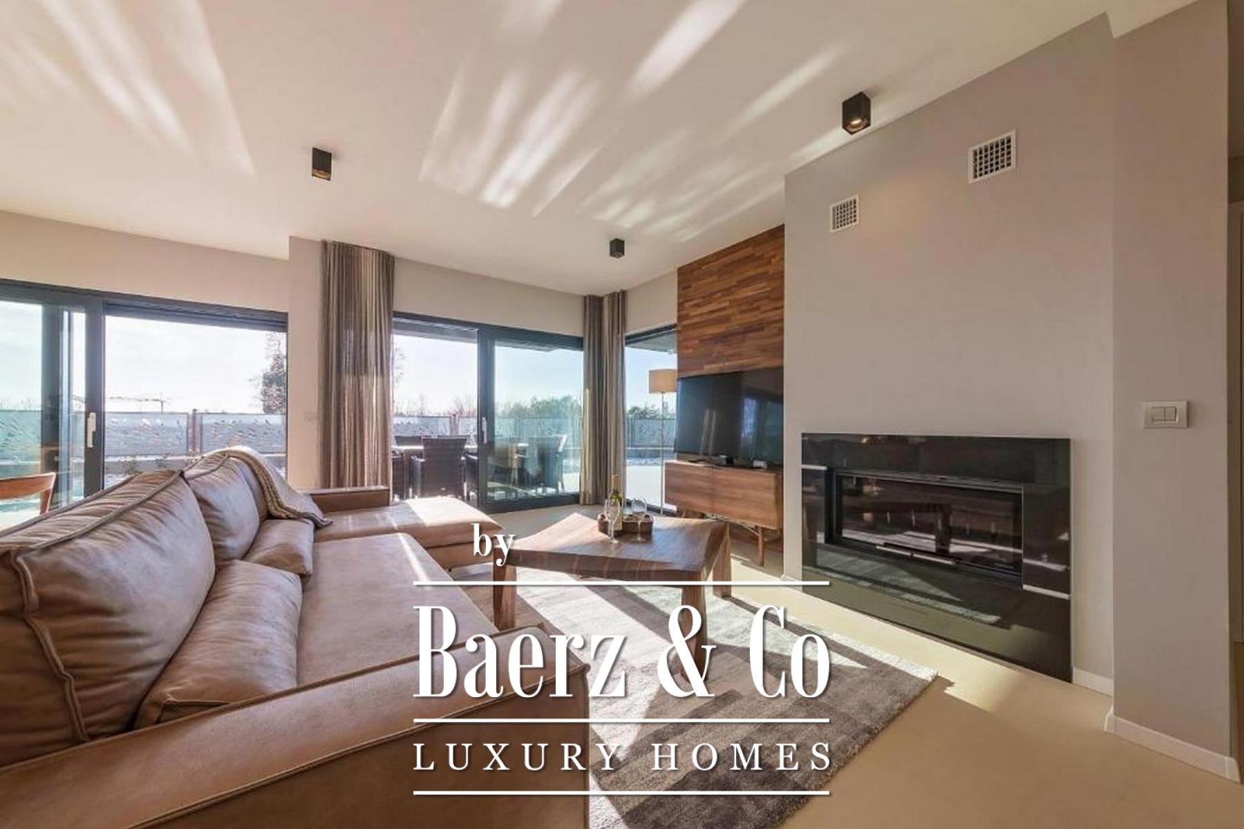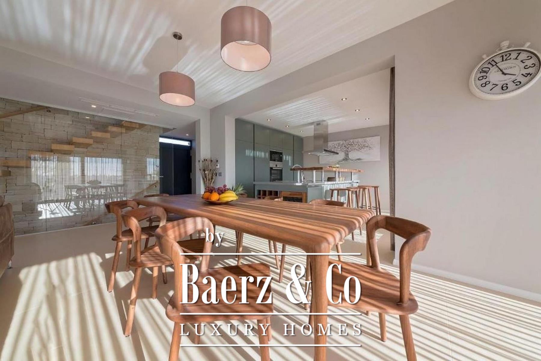 Het ontwerp, verspreid over twee verdiepingen, haalt veel licht binnen en zorgt voor een ontspannen sfeer in elke leefruimte. De begane grond beschikt over een open woonkamer en keuken, afgewerkt met designmeubilair en voorzien van de modernste apparatuur. Grote glazen schuifdeuren verbinden het interieur met een besloten terras, waar een privézwembad, barbecue en zonneterras een ingetogen, luxueuze sfeer creëren.