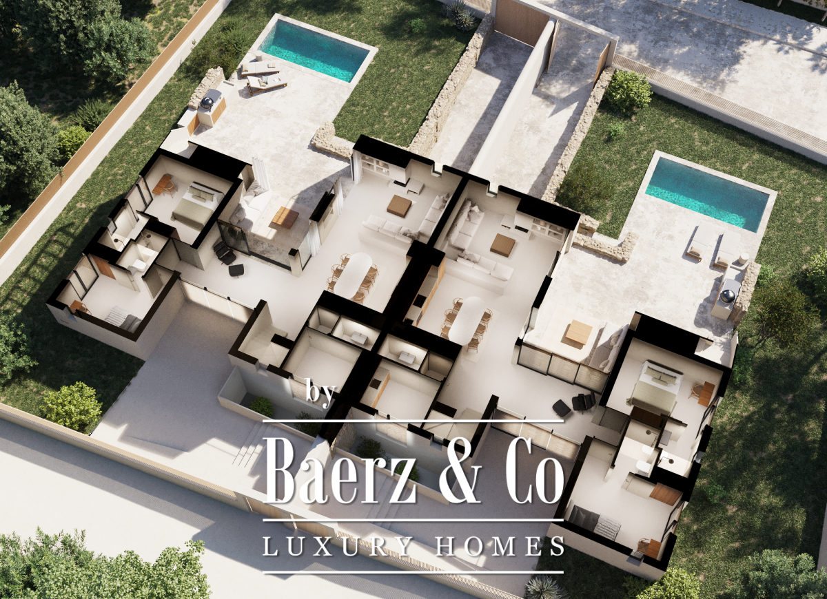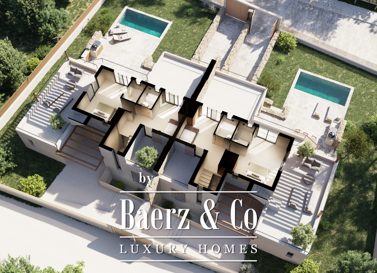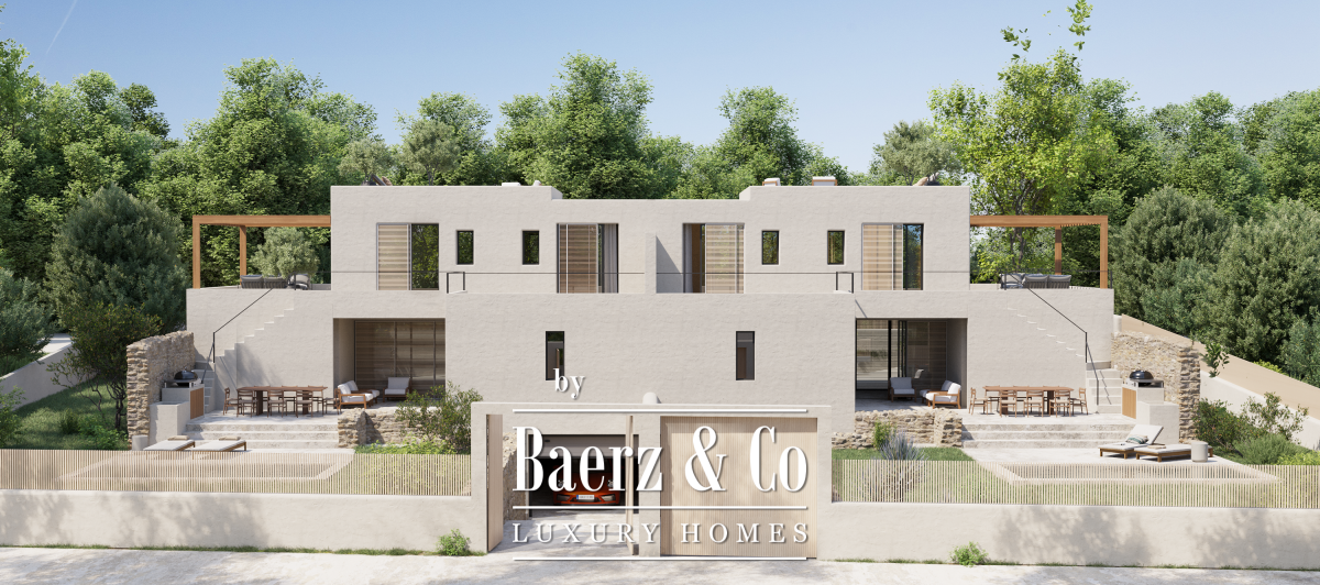 De omgevingGelegen in de rustige woonwijk van Port d’Es Torrent bieden deze woningen een moderne en luxe lifestyle aan de kust. Strandliefhebbers kunnen hier hun hart ophalen, want het dichtstbijzijnde strand ligt op slechts 400 meter afstand. Port d’Es Torrent staat bekend om zijn vredige sfeer en schilderachtige kustlijn, en is een verborgen parel aan de westkust van Ibiza. Dagelijkse voorzieningen zoals supermarkten, lokale winkels, bars en restaurants liggen op enkele minuten afstand. Naast de nabijheid van het strand zijn deze woningen ook ideaal gelegen op slechts 10 minuten rijden van enkele van de meest iconische stranden van het eiland, zoals Cala Bassa en Cala Conta, beroemd om hun kristalheldere water en adembenemende zonsondergangen. Ibiza-stad, met zijn levendige sfeer, uitgebreid aanbod aan eetgelegenheden en bruisend nachtleven, ligt op slechts 20 minuten rijden. De luchthaven is ongeveer 25 minuten rijden, waardoor u gemakkelijk toegang heeft tot de rest van het eiland en daarbuiten. Deze woningen bieden de ideale gelegenheid om de bohemian-chique Ibiza levensstijl te ervaren, gecombineerd met mediterrane luxe in een rustige buurt.De villa’sDeze twee halfvrijstaande villa’s bevinden zich op een perceel van 1.000m2 en combineren een modern design met de traditionele Balearische charme. Elke villa heeft een royaal bebouwde oppervlakte van 240m2, beschikt over 4 slaapkamers, 4 badkamers, en een high-end interieur. De architectuur vormt een harmonieuze fusie van eigentijdse elegantie en natuurlijke elementen, wat een verfijnde maar uitnodigende ambiance creëert. De open plattegrond verbindt de woon-, eet- en keukenruimtes, allemaal voorzien van grote ramen die de ruimte vullen met natuurlijk licht en uitzicht bieden op de weelderige tuin. De moderne L-vormige keuken is volledig uitgerust en voorzien van houten accenten, die warmte toevoegen aan het strakke ontwerp. De 4 en-suite slaapkamers zijn verdeeld over beide verdiepingen, met 2 en-suite slaapkamers op elke verdieping, wat zowel privacy als comfort biedt voor familie en gasten. De combinatie van eigentijdse architectuur en natuurlijke materialen creëren een warme en huiselijke sfeer, terwijl de strakke, moderne esthetiek perfect aansluit bij de ontspannen, stijlvolle Ibiza levensstijl.De buitenruimtesElke villa beschikt over een eigen zwembad, ideaal om af te koelen op warme zomerdagen, terwijl de aangelegde tuin voldoende ruimte biedt voor kinderen en huisdieren om te spelen. Na een verfrissende duik of een speels moment op het gazon kunt u genieten van een heerlijke maaltijd. De villa beschikt over een buitenkeuken met barbecue en voldoende ruimte voor een grote eettafel, perfect voor diners in de buitenlucht met familie en vrienden. Extra ontspanningsruimtes in de buitenlucht bevinden zich op de bovenverdieping. Elke slaapkamer biedt directe toegang tot een ruim terras op de eerste verdieping, met een mix van zonnige en schaduwrijke plekken. Het hoogtepunt van de buitenruimtes is het indrukwekkende dakterras met adembenemend uitzicht op zee, een ideale plek voor ochtendmeditatie of yogasessies, of om gasten te ontvangen voor borrels onder een sterrenhemel. Een automatische poort biedt toegang tot de oprit, die leidt naar een ruime privé-garage met een bijkeuken. Elke woning is volledig omheind, wat zorgt voor uw privacy en gemoedsrust. Deze opmerkelijke villa’s bieden de ultieme luxe voor een gezinswoning of een vakantie retreat dicht bij het strand in een van de meest gewilde gebieden van het eiland.