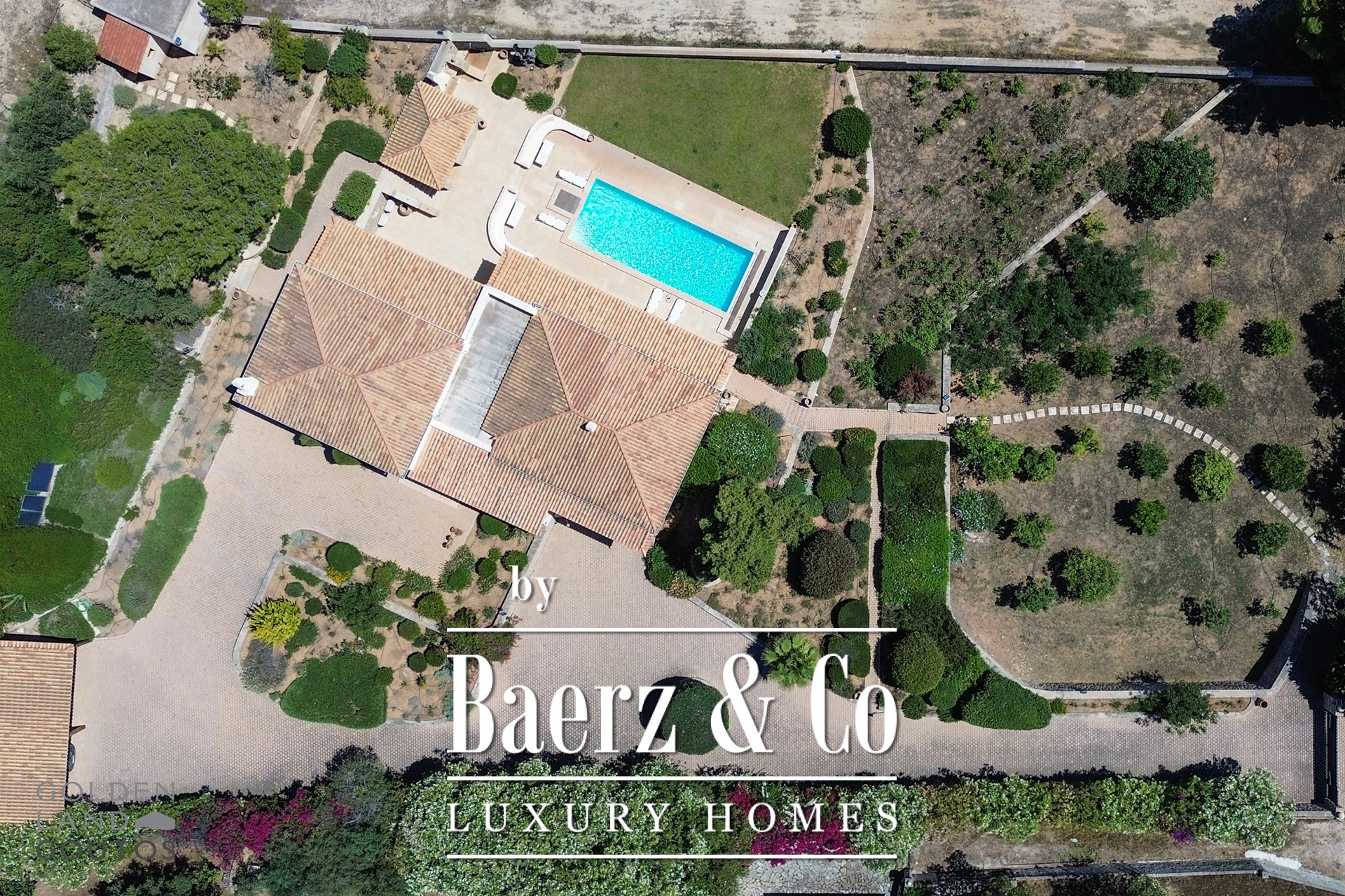 Op de benedenverdieping van de villa bevindt zich een mastersuite met sauna en leefgedeelte, voor ontspannen avonden. De tegenoverliggende vleugel beschikt over een gastenappartement met twee slaapkamers, gedeelde badkamer, woonkamer en kitchenette — met eigen toegang voor moeiteloos gastheerschap of zelfstandig wonen. Elke zone sluit naadloos aan op buiten, waar het zwembad, de beschaduwde pergola’s en de tuinen het mediterrane levenstempo onderstrepen.