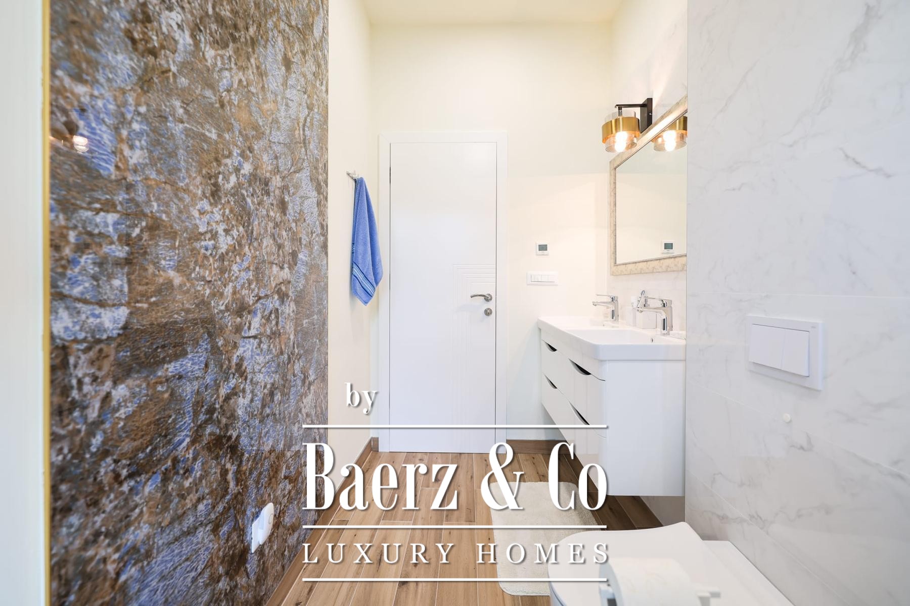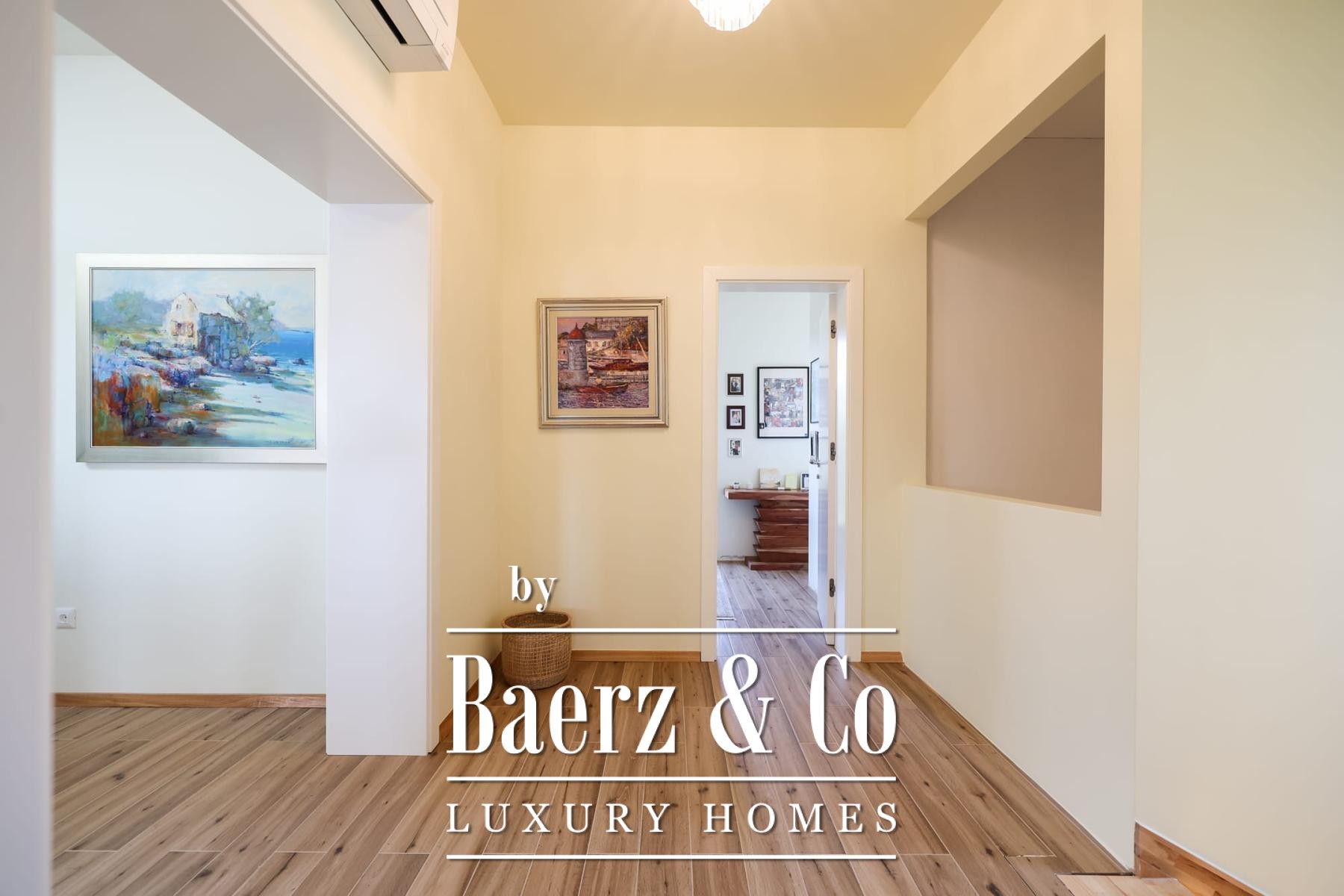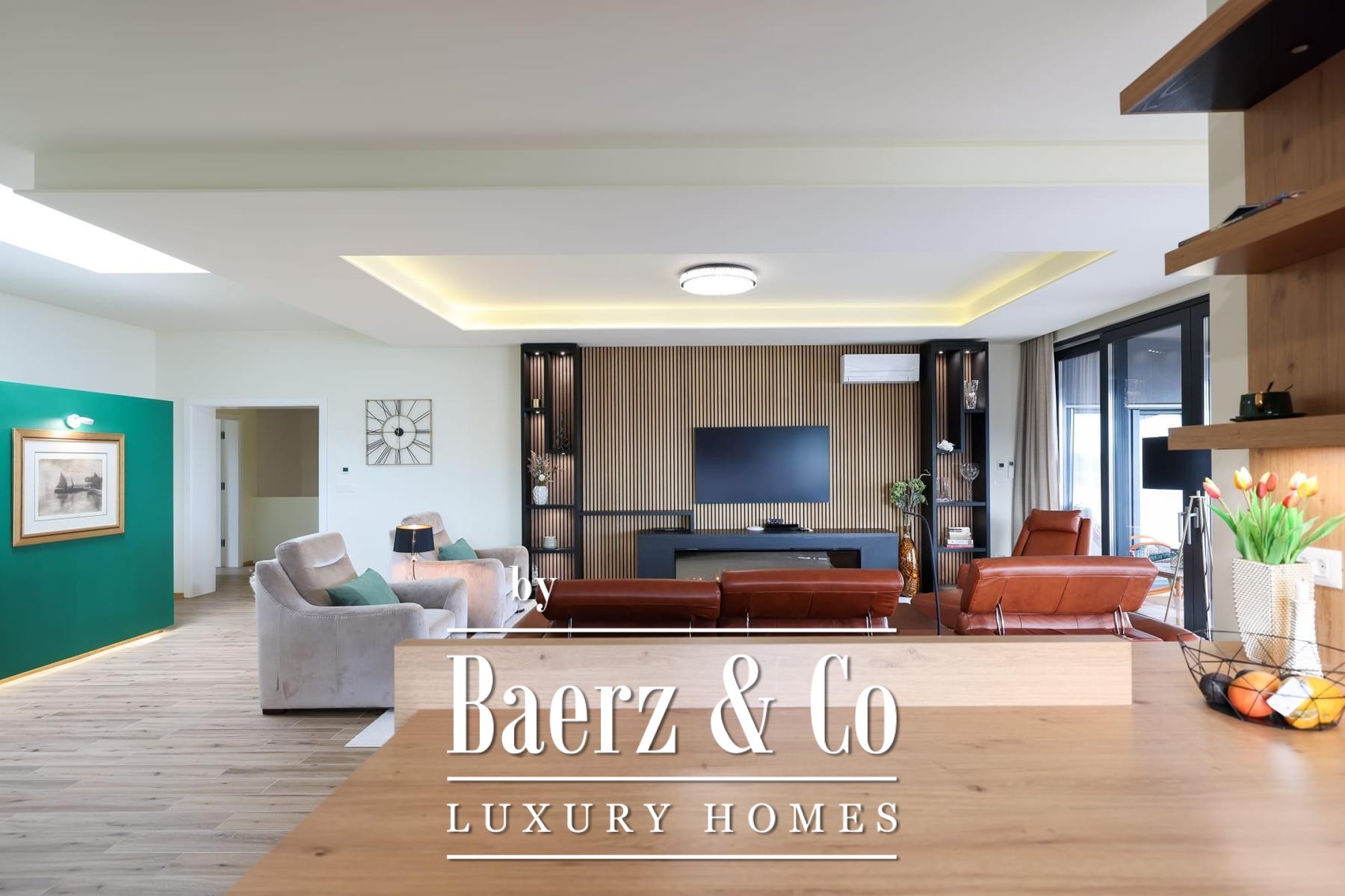 Via de lift bereikt u de eerste verdieping, waar een master suite met eigen badkamer, inloopkast en toegang tot het terras centraal staat, direct verbonden met een royale woon- en eetkamer. De indeling biedt verder ruimte aan een werkkamer, een extra slaapkamer met badkamer, een berging en een wasruimte, allemaal zo gepositioneerd dat ze profiteren van het zachte licht en het rustgevende uitzicht op zee. Het terras en de woonkamer delen panoramische vergezichten over zee en Zadar, terwijl het zwembad en de aangelegde tuin de verbondenheid van de villa met haar omgeving versterken.