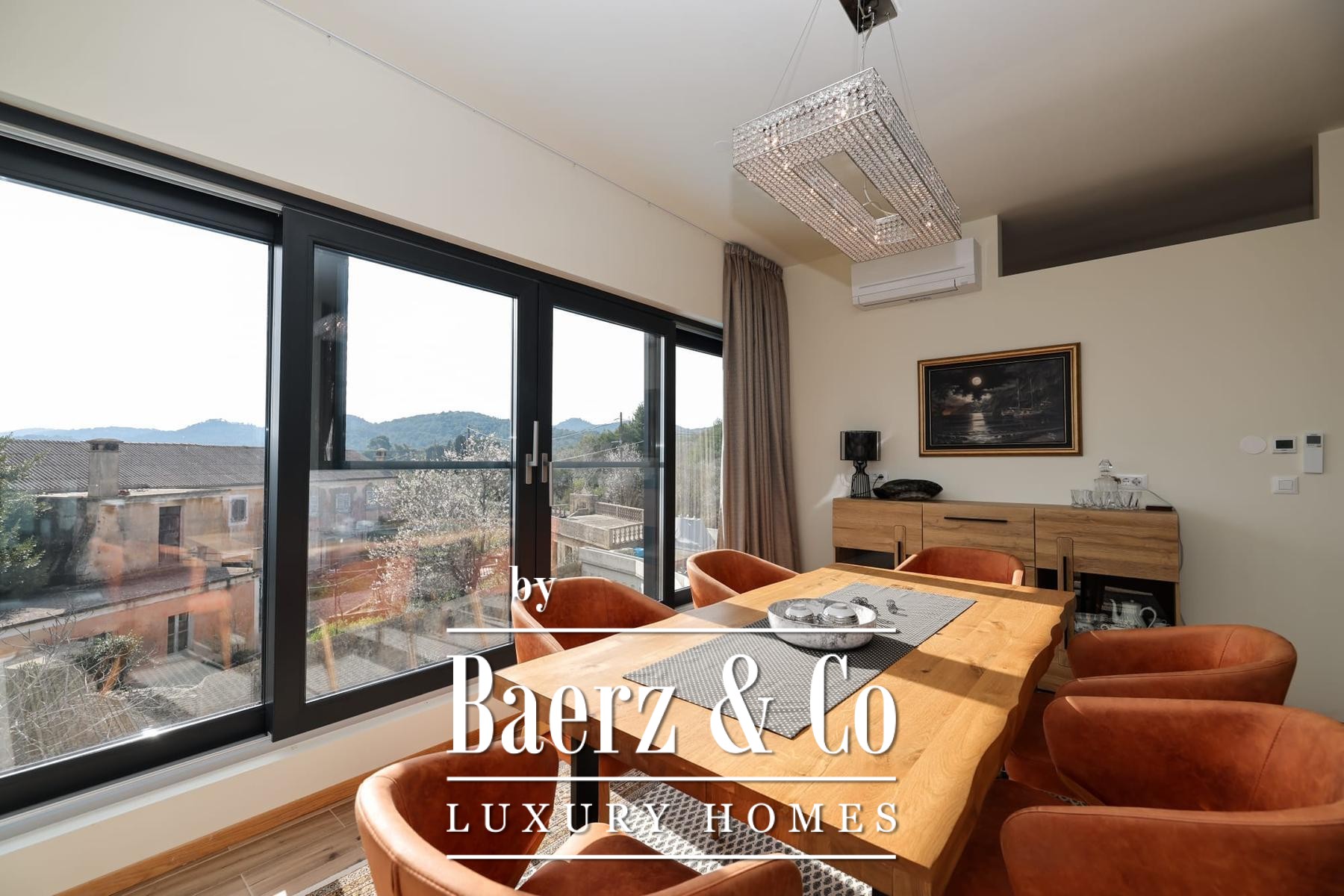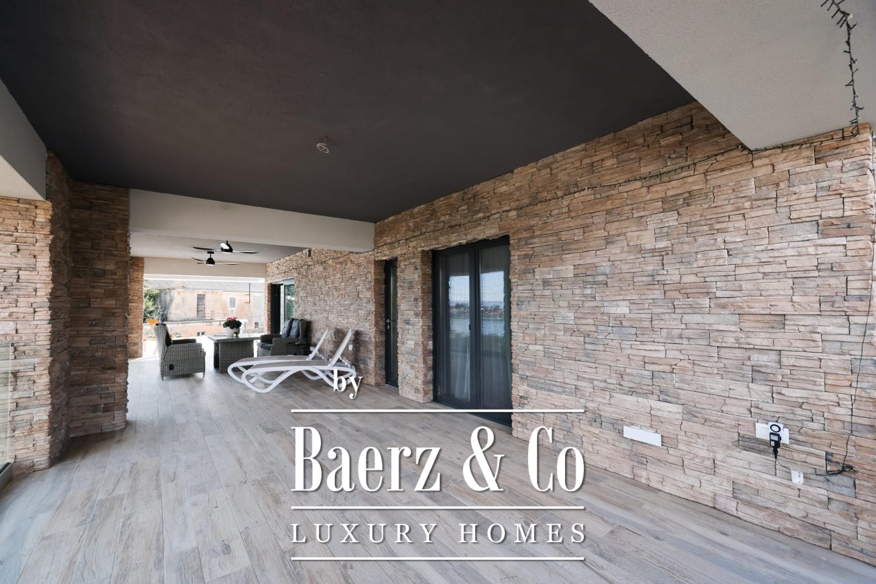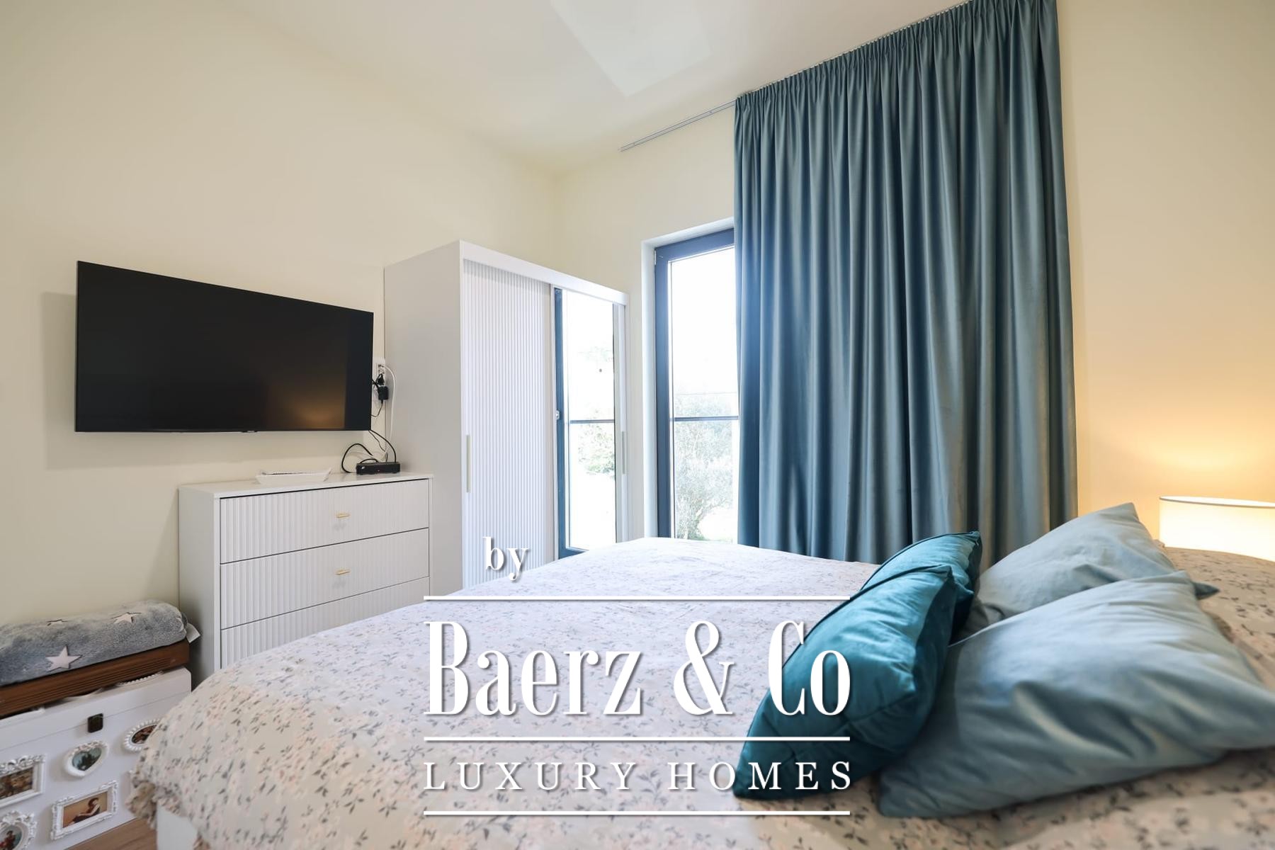 Via de lift bereikt u de eerste verdieping, waar een master suite met eigen badkamer, inloopkast en toegang tot het terras centraal staat, direct verbonden met een royale woon- en eetkamer. De indeling biedt verder ruimte aan een werkkamer, een extra slaapkamer met badkamer, een berging en een wasruimte, allemaal zo gepositioneerd dat ze profiteren van het zachte licht en het rustgevende uitzicht op zee. Het terras en de woonkamer delen panoramische vergezichten over zee en Zadar, terwijl het zwembad en de aangelegde tuin de verbondenheid van de villa met haar omgeving versterken.
