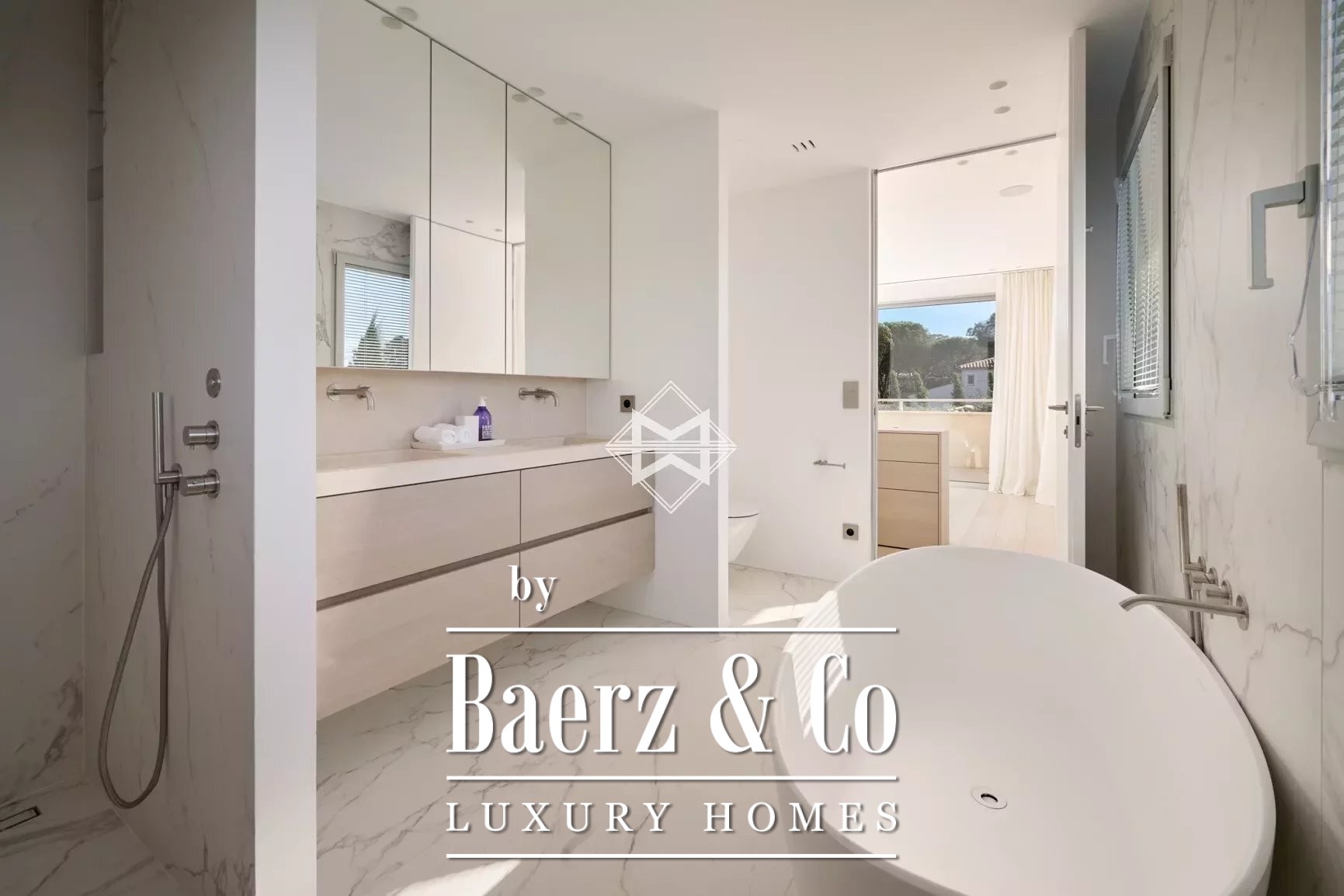 De villa is verdeeld over twee verdiepingen en een lichte souterrain en beschikt over acht slaapkamers, waaronder een master suite met privéterras, royale kleedruimte, badkamer en aparte douche. De leefruimtes op de begane grond lopen naadloos over van een salon met haard en een eetkamer naar een volledig uitgeruste keuken met bijkeuken. Ruime overdekte en open terrassen omlijsten het uitzicht op de tuin en zorgen voor een vloeiende overgang tussen binnen en zorgvuldig aangelegde buitenruimtes.