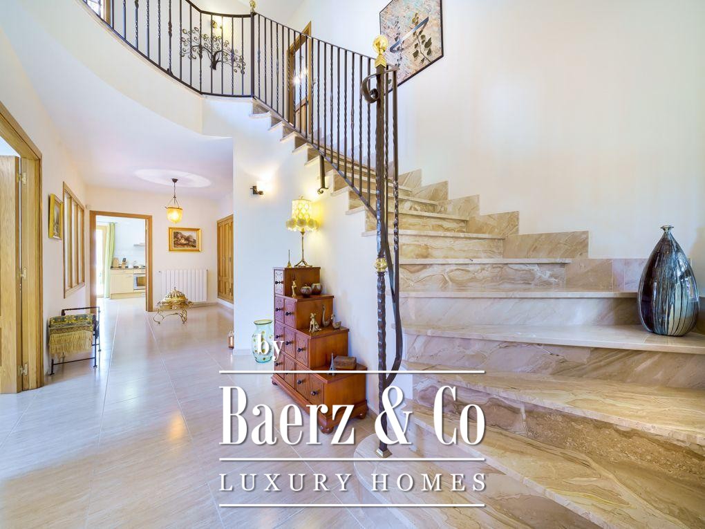 Gebouwd in 2005, staat de villa op een perceel van 990 m² en beschikt over een totale woonoppervlakte van 469 m², verdeeld over twee verdiepingen. Het ontwerp bevordert zowel privacy als samen leven, met zes slaapkamers, drie badkamers waarvan twee en suite, en twee inloopkasten. De begane grond loopt naadloos over van een royale woonkeuken naar een lichte woonkamer, grenzend aan een overdekt terras met uitzicht op de bergen en een glimp van de baai van Santa Ponsa in de verte.