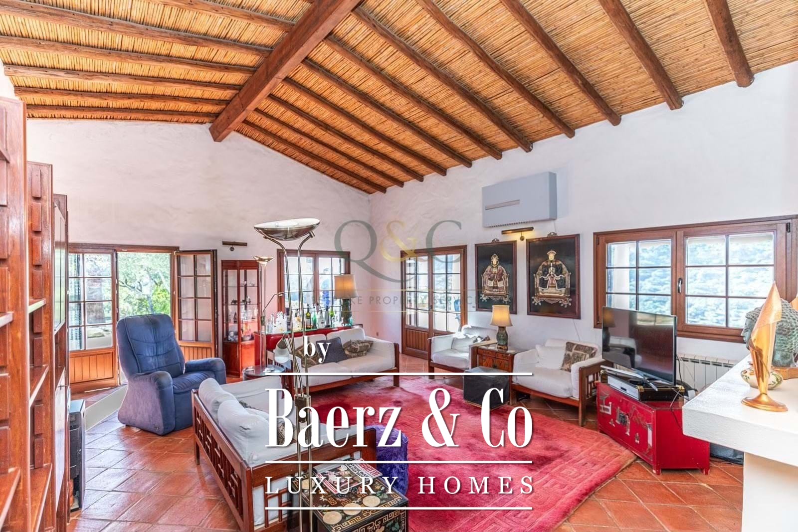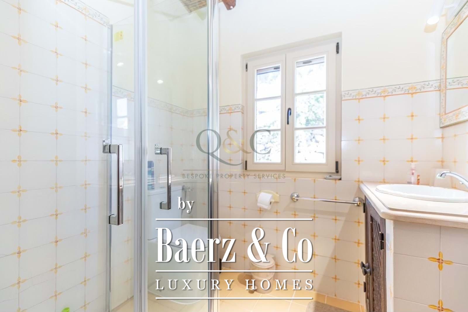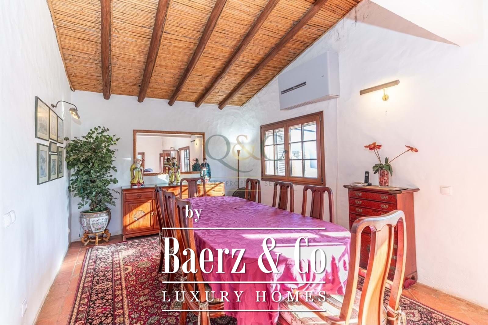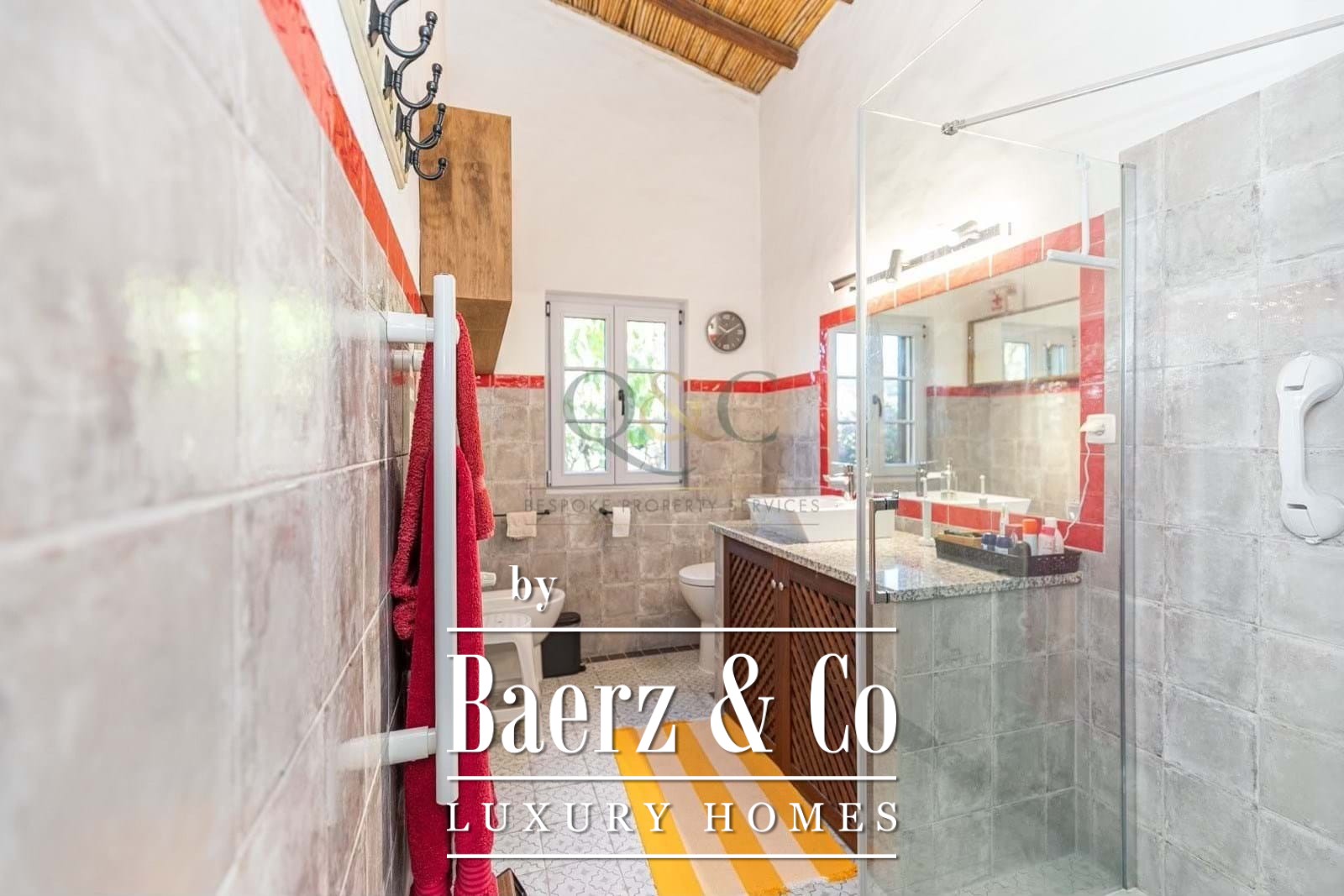 Op de hoofdverdieping bevinden zich drie tweepersoonsslaapkamers, vier badkamers en hoge plafonds met authentieke balken. De typische Santa Catarina vloertegels vormen de basis van het interieur en lopen door naar royale terrassen. De L-vormige woon- en eetkamer met houtkachel en dubbele deuren naar de veranda versterken het natuurlijke contact tussen binnen en buiten. Een volledig ingerichte keuken met granieten werkblad sluit harmonieus aan bij de uitnodigende, sociale ruimte. Door het hele huis waarborgen airconditioning, radiatoren op een ioniserende elektrische ketel en dubbele beglazing comfort, het hele jaar door.