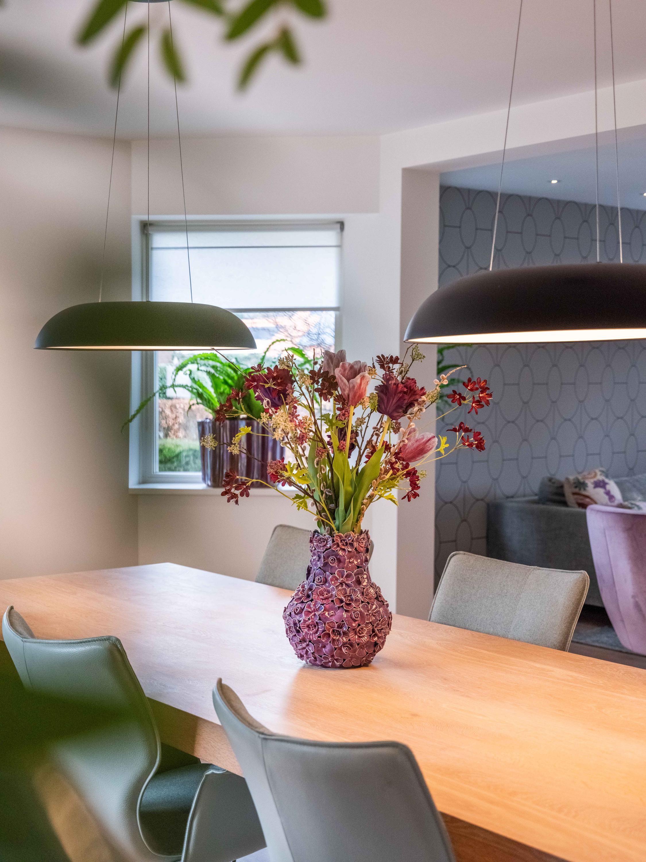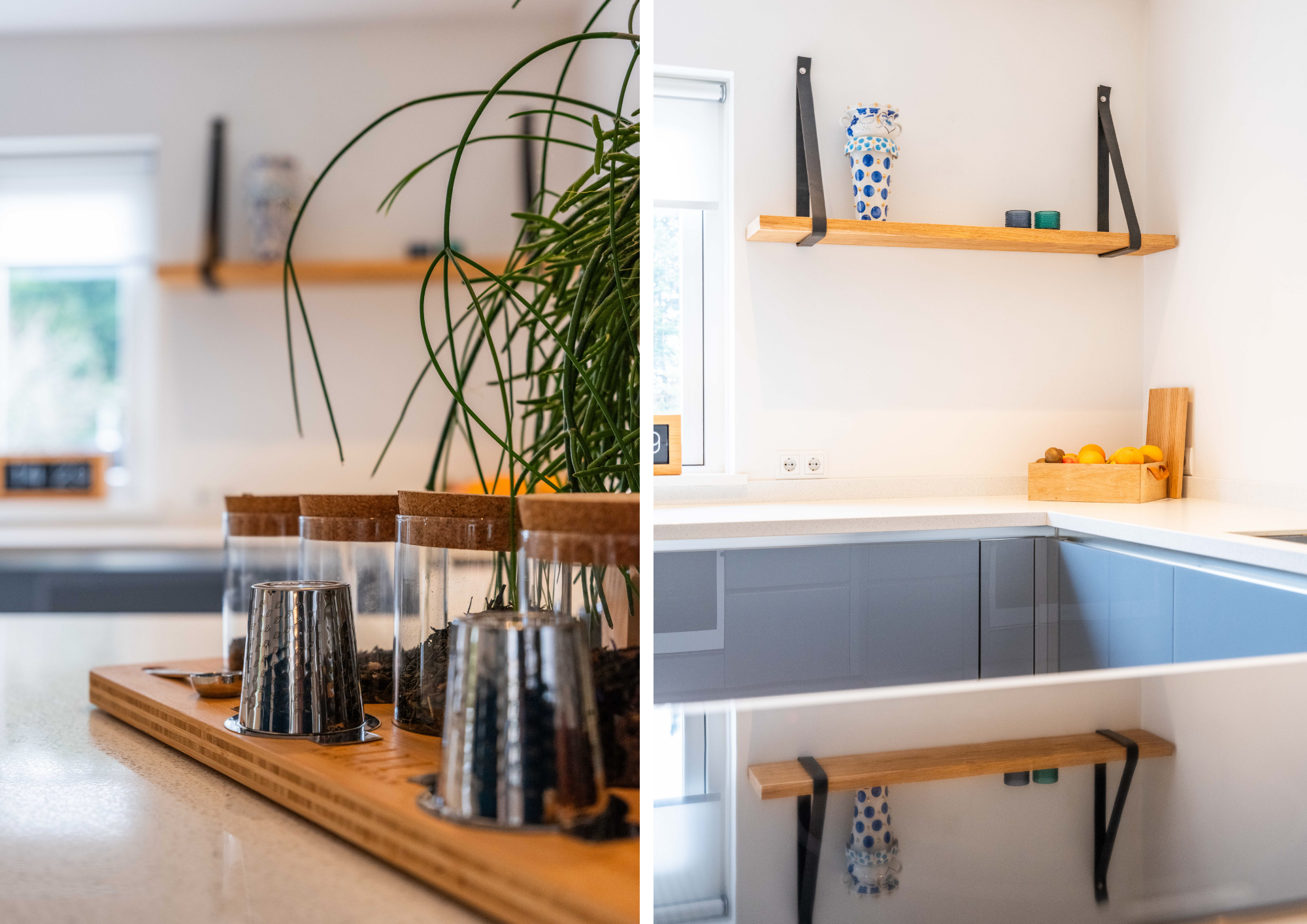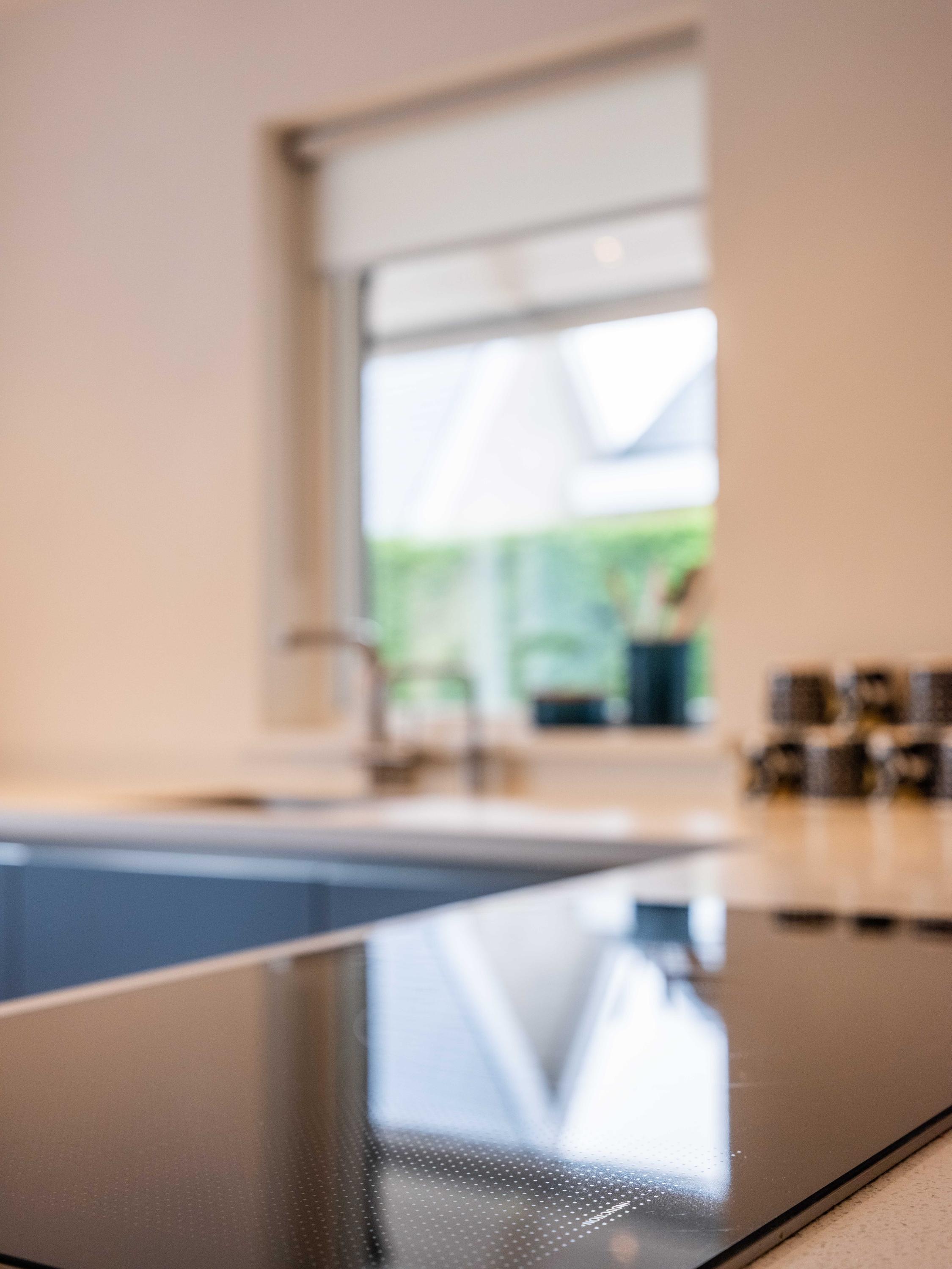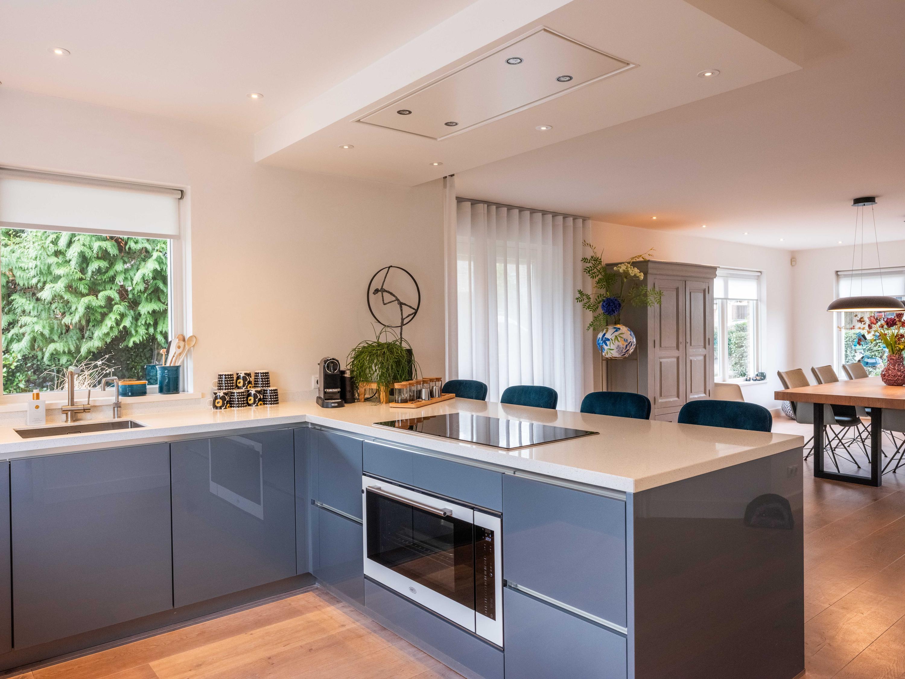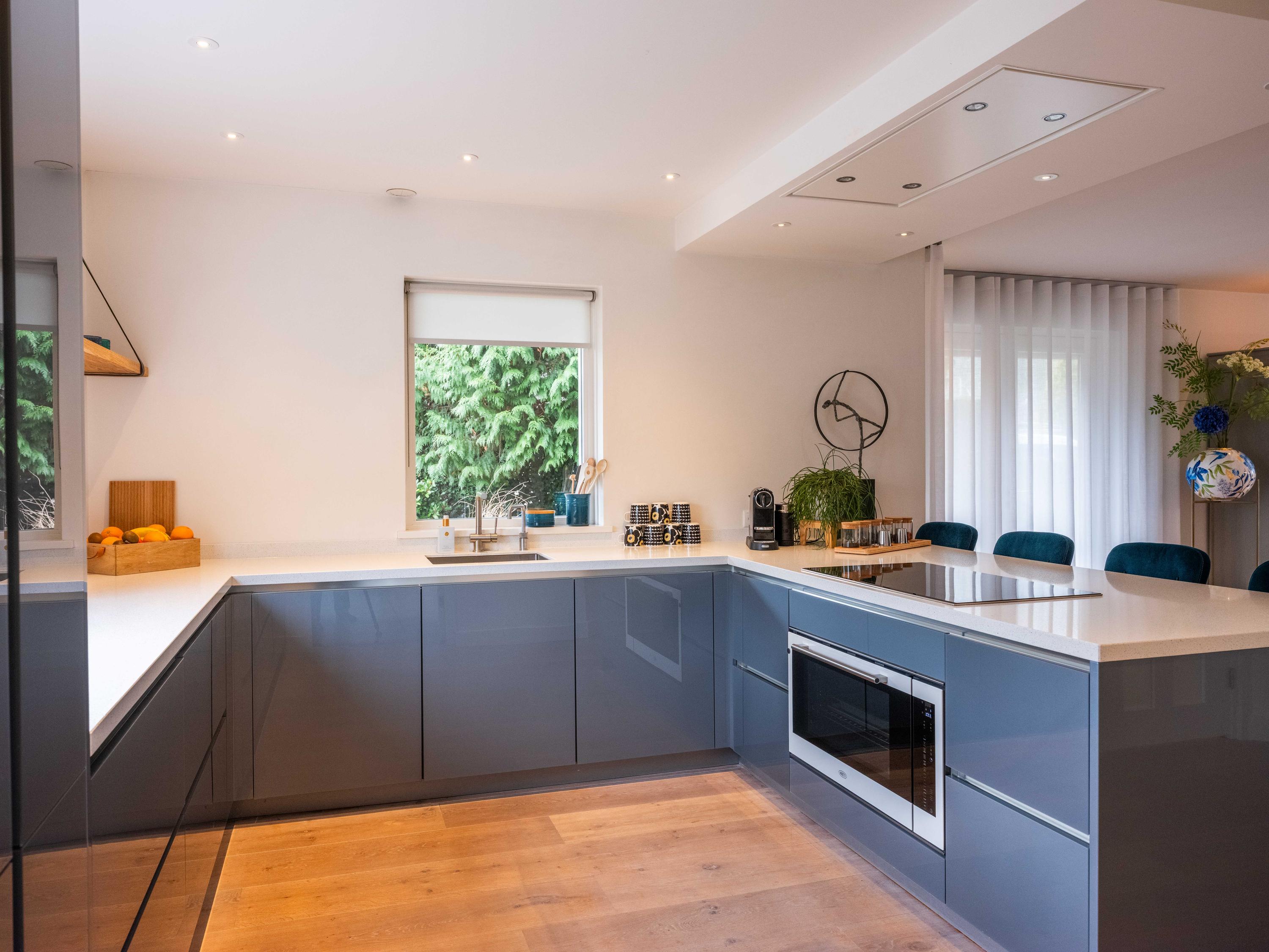 De open keuken is sfeervol ingericht en voorzien van een gezellige bar met zitplaatsen. Vanuit de keuken geniet je van een prachtig uitzicht over de tuin en is er directe verbinding met de woonkamer. Dankzij de open indeling en het overvloedige licht voelt alles ruim, fris en uitnodigend aan.