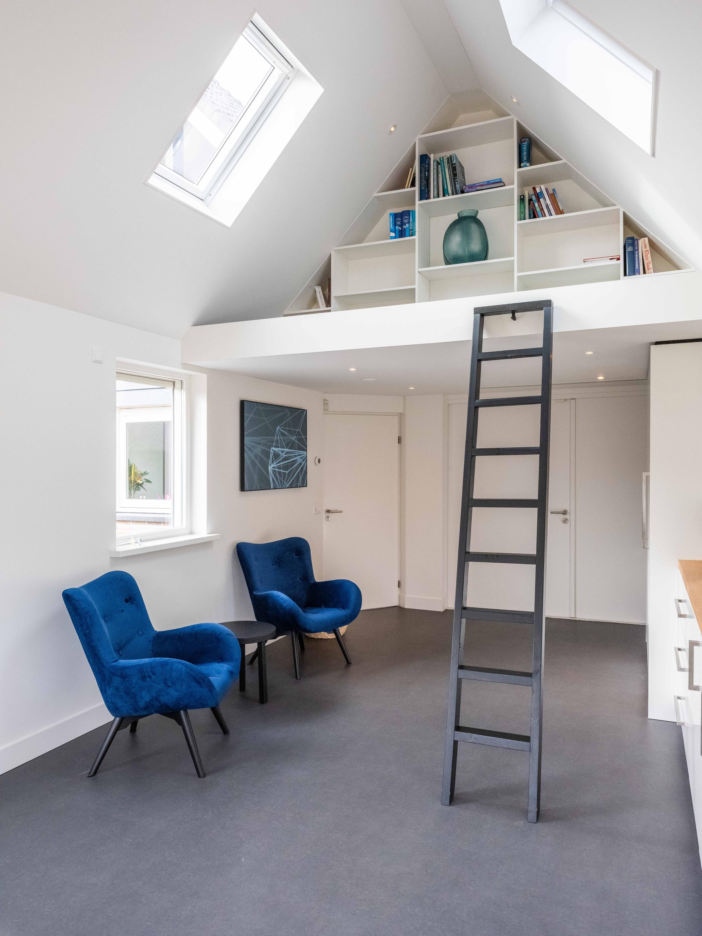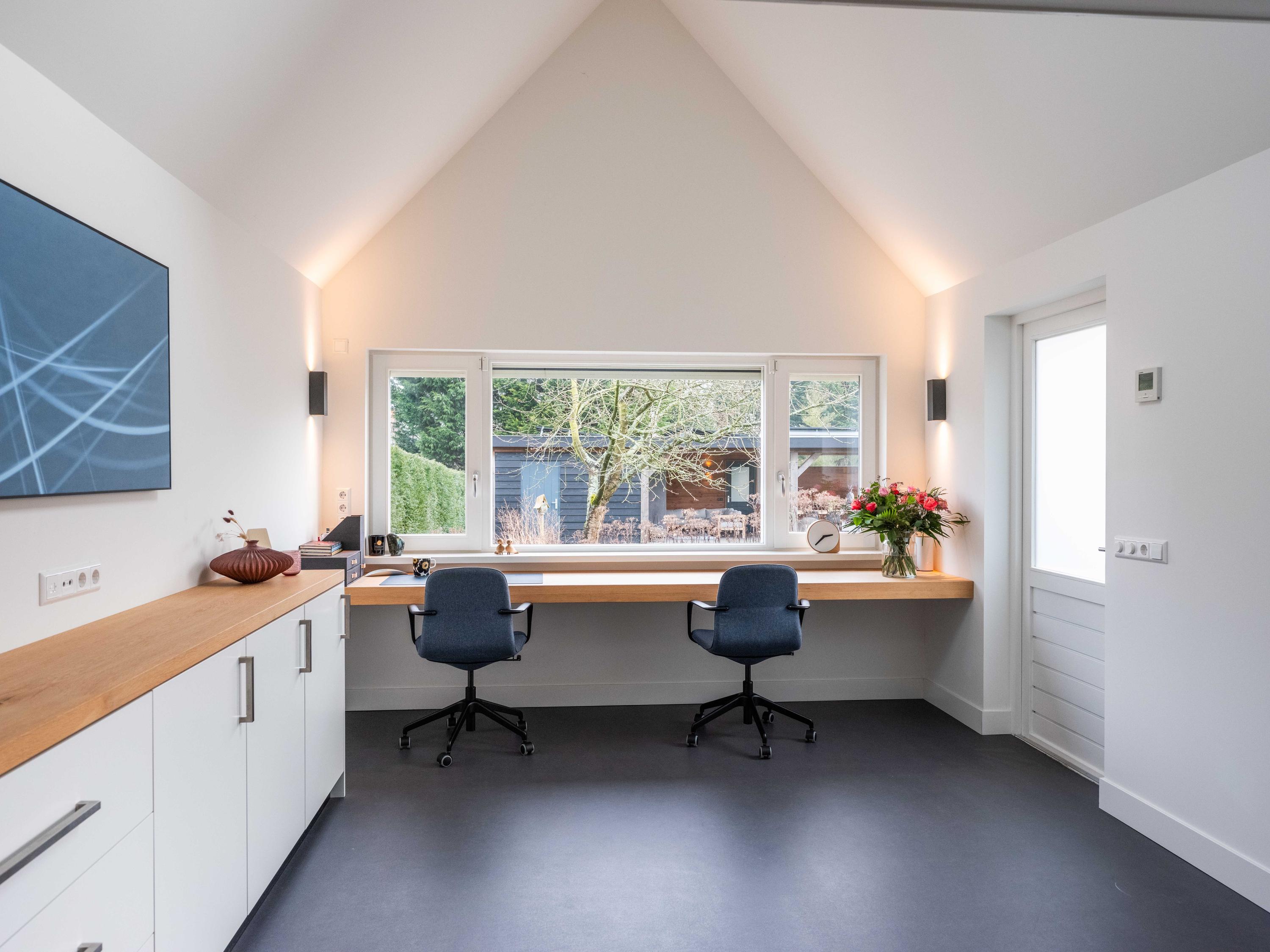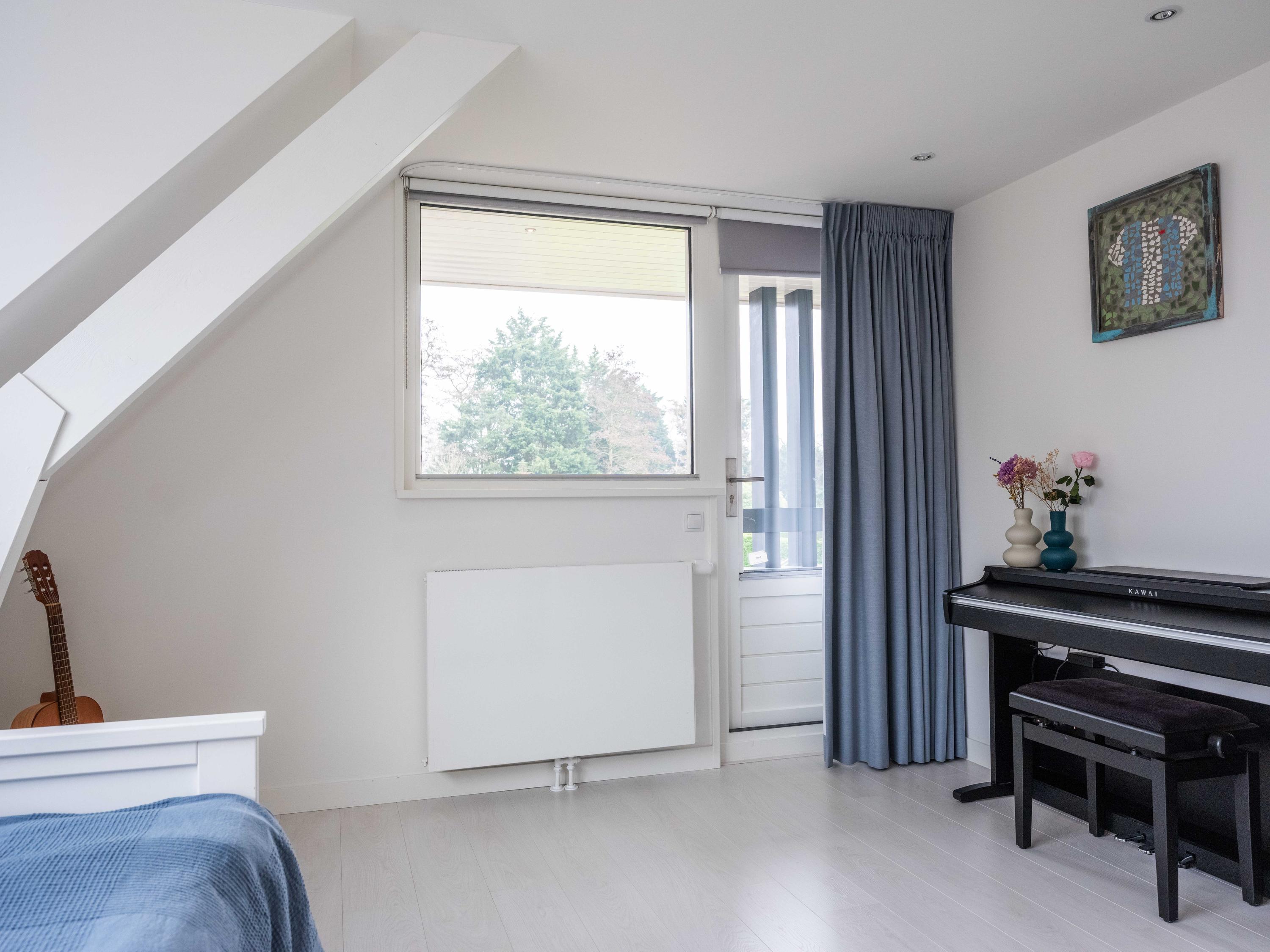 Vanuit de bijkeuken is er toegang tot nog een extra kamer, voorzien van airconditioning en een vliering. Deze kamer wordt nu gebruikt als kantoor, maar kan ook goed dienstdoen als slaapkamer of hobbyruimte. Op de vliering is extra bergruimte aanwezig. Ook hier geniet u van een prachtig uitzicht over de diepe tuin.