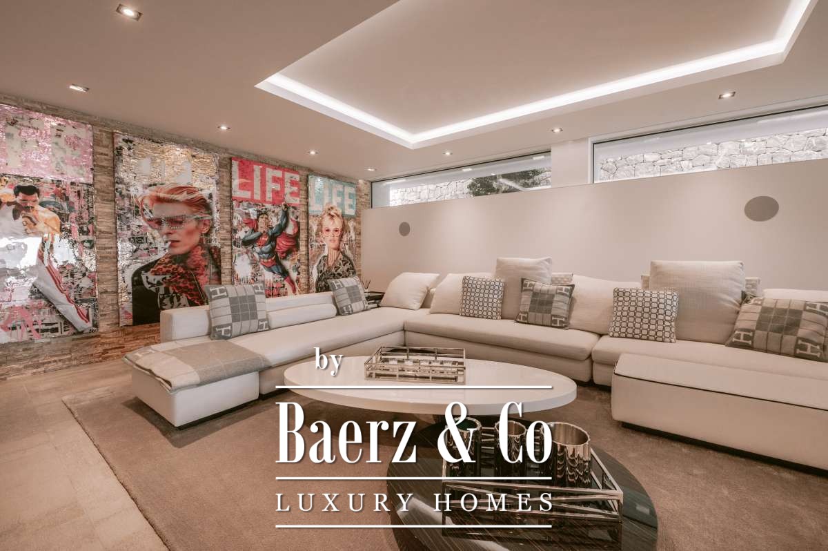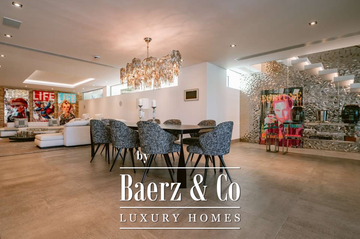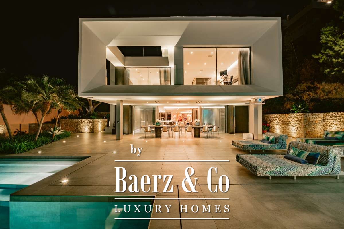 De omgevingIn Siesta, een rustig dorpje in Santa Eulalia, ligt deze ultra moderne villa. In slechts vijftien minuten rijden bevindt u zich in Marina Botafoc en in vijfentwintig minuten bent u al op de luchthaven van Ibiza. De schitterende stranden Cala Olivera, Cala Nova en Cala LLenya zijn te bereiken binnen enkele minuten rijden waar u in alle rust kunt genieten van witte stranden en helder blauwe zeeën. Het fijne aan Santa Eulalia is dat het veel minder toeristisch is dan bijvoorbeeld Ibiza Stad. Deze plaats kenmerkt zich door de lange boulevard wederom vol met genoeg leuke barretjes en eetgelegenheden. Er zijn hier aan de Oostkant van het eiland tevens nog veel authentieke restaurantjes en winkeltjes te vinden.De villaIn 2020 is deze ultramoderne villa door een bekende Duitse architect gerealiseerd. In totaal telt het zes luxe slaapkamers en zeven schitterende badkamers verdeeld over vier verdiepingen. Een van de kamers zou naar wens kunnen worden gebuikt als personeelsverblijf. De badkamers zijn ieder voorzien van een dubbele wastafel, bidet, bad en/of ruime douche. Voor alle badkamermeubels is gekozen voor de tijdloze kleur ‘wit Corian’ geïnspireerd op het Wenge-Design. Daarnaast faciliteert deze villa een uitgebreide fitnessruimte met vrijstaand ligbad en telt het nog 3 extra gastentoiletten. Alle kamers bevatten hoogwaardige LED-verlichting en het gehele huis is voorzien van airconditioning. De property is op ongeveer 750 m² gebouwd op een ruim perceel van 1500 m².Via de bekende Thyssen glazen lift met RVS kozijnen zijn de verschillende slaapkamers en verdiepingen gemakkelijk te bereiken. Op de begane grond is de grote, VIP-suite te vinden. Één verdieping hoger is de master suite gepositioneerd die een schitterend uitzicht geeft over de kraakheldere, Mediterrane zee. Tevens bevinden de drie gastenverblijven zich op de bovenste verdieping van de residentie. Alle gastenverblijven beschikken over een eigen badkamer en zelfs keuken. Voor het sanitair in deze property is gebruik gemaakt van slechts hoogwaardige kwaliteit van het bekende merk Grohe's Allure-Collection. Om extra luxe te creëren zijn er een voortreffelijke stoomdouches geplaatst in zowel de master- en VIP-badkamers. Tot slot zijn er in de suites evenzeer als badkamers een Ultra HD-flatscreen geplaatst. Naast de geweldig luxe slaapkamers is er een andere, werkelijke eye catcher: de enorme, open woonkeuken. Wederom hier is gekozen voor slechts de beste kwaliteit inbouw apparatuur. De magnifieke Miele keuken is uitgerust in de kleur hoogglans wit. De keuken beschikt over een ruim kookeiland, drie klimaatkasten en (ontbijt)bar met een stijlvol LED-verlicht, marmeren aanrecht. Sjouwen met flessen water hoeft hier niet, er is namelijk door het gehele huis een centrale osmosemachine die zorgt voor subliem drinkwater. Als klap op de vuurpijl is er in het verblijf een thuisbioscoop met een 85’’ 4K Ultra HD-TV. Het smart home-systeem wordt geleverd door Gira en uiteraard kunnen alle functies gemakkelijk via iPhone of iPad worden bestuurd. Het Sonos-muziekdistributiesysteem wordt standaard meegeleverd en zorgt voor een volledige bioscoop ervaring. Door het ‘Daikin’ airconditioningsysteem is het de hele zomer aangenaam koel in het huis, inclusief de garage. Voor de winterperiode is er door de gehele villa vloerverwarming.De buitenruimtesWanneer u zich naar buiten begeeft valt de infinity pool van 90 m² direct op. Ook in de avond is dit een werkelijk pronkstuk, het bassin is namelijk geheel verlicht met waterbestendig LED-verlichting. Aan het zwembad bevindt zich een voortreffelijke fitnessruimte, een bar, compleet uitgeruste badkamer en een barbecue waar verrukkelijke maaltijden kunnen worden bereid. Last but not least is er ook buiten de mogelijkheid om een bioscoop ervaring te creëren. Door een 4K ultra HD-projector aan de muur kunt u onder de sterrenhemel genieten van uw favoriete films. Rondom het zwembad zijn er heerlijke buitenmeubels geplaatst van het merk Missoni waar optimaal genoten kan worden in alle rust. De residentie heeft verschillende terrassen van in totaal 600 m² met een verbluffend uitzicht van 270° over de haven van Santa Eulalia en de diepblauwe zeeën die Ibiza te bieden heeft. Het paradepaardje van deze property is bij uitstek het schitterende dakterras met eigen jacuzzi en comfortabele lounge set welke kan worden overdekt door middel van een high-tec zonnewering systeem die wederom bediend kan worden met een Iphone of Ipad. Er is een grote, overdekte garage waar met gemak vier auto’s kunnen worden gestald. Tot slot is er een zogeheten ‘State-of-the-art’ alarmsysteem met GSM-aansluiting en brandalarm, 13 bewakingscamera's van Mobotix en binnenin een Ritto-Intercommunicatiesysteem. Het moge duidelijk zijn dat bij deze zeer luxe en moderne residentie, het niks te wensen over laat.