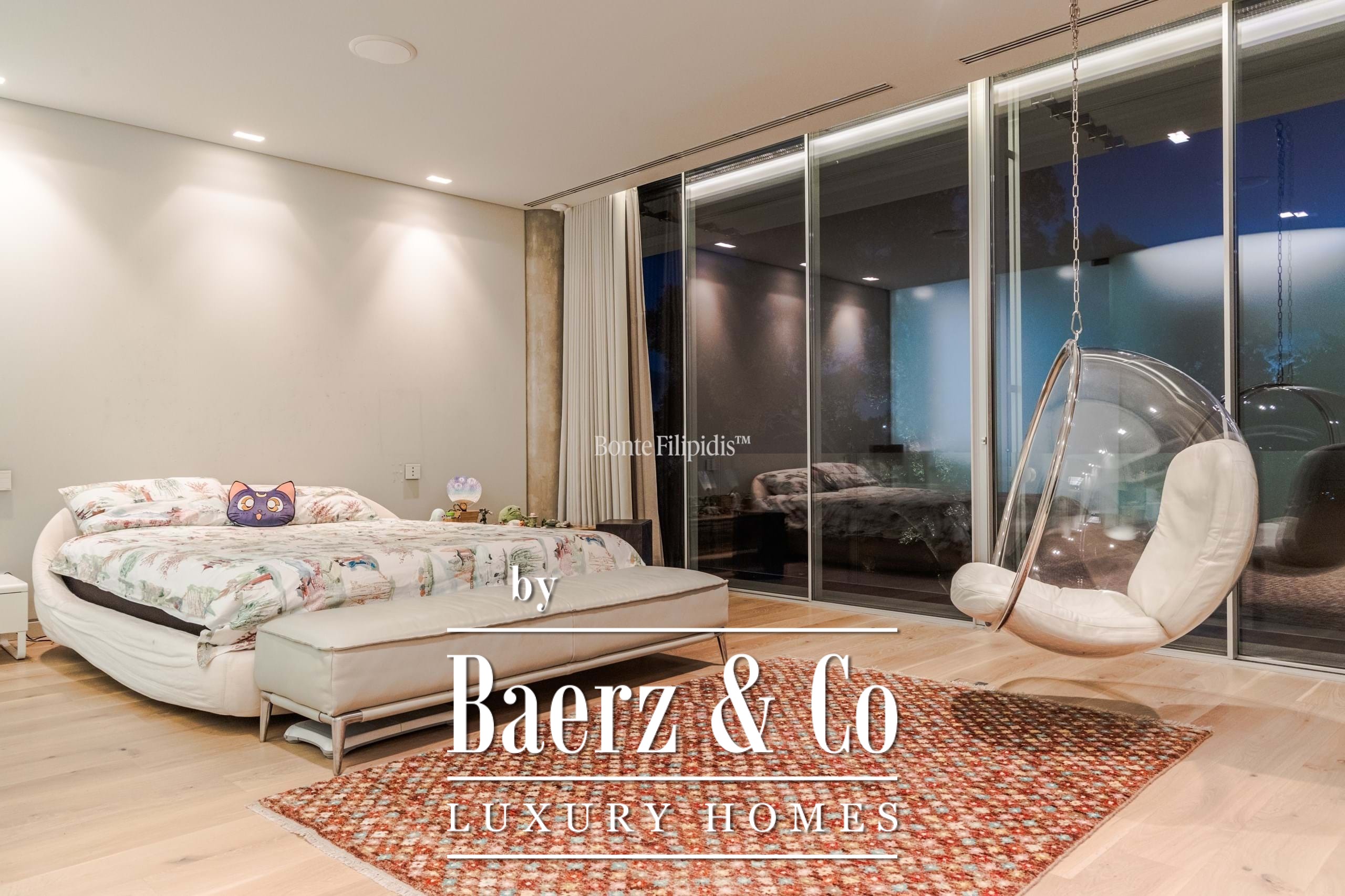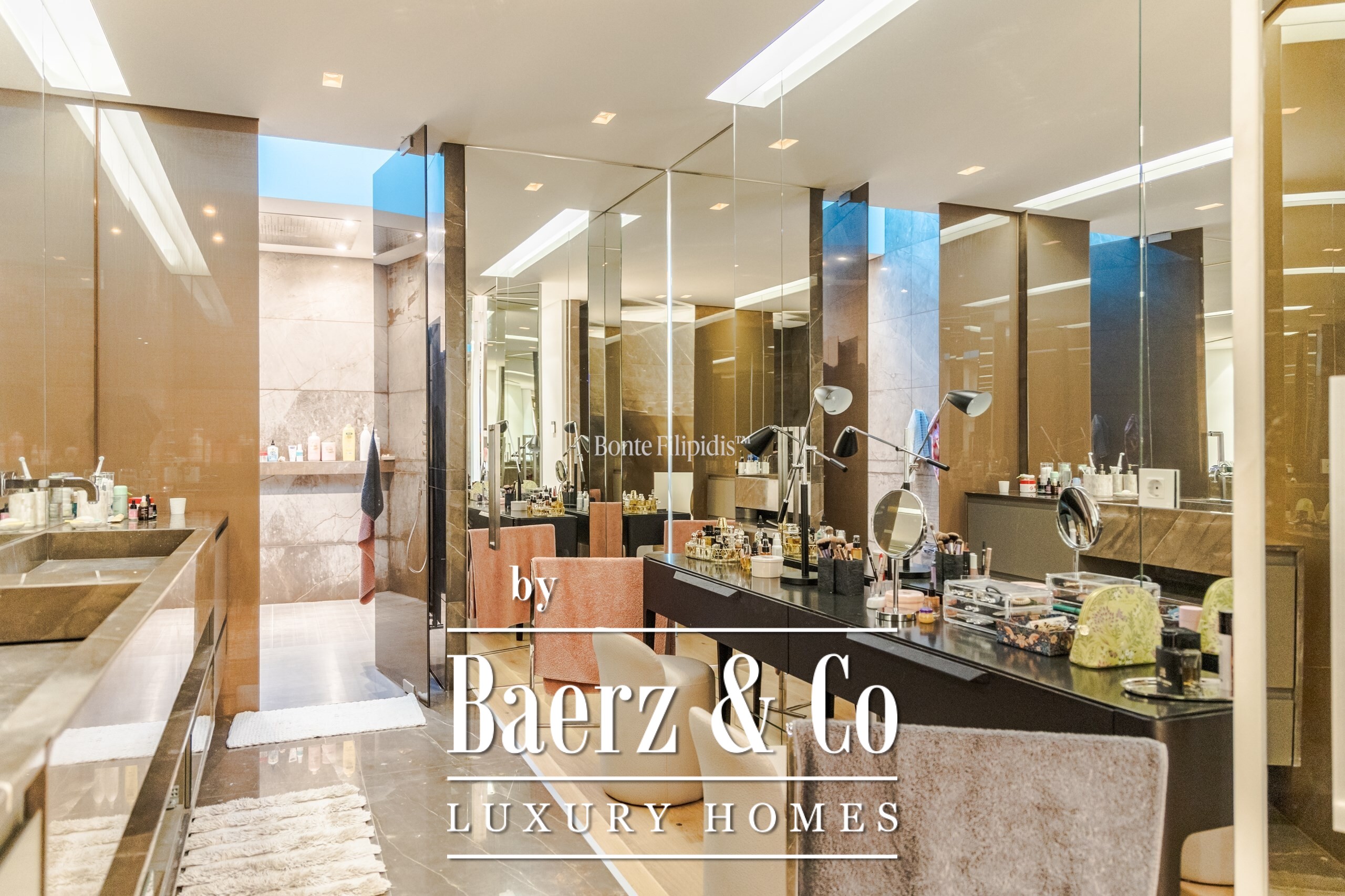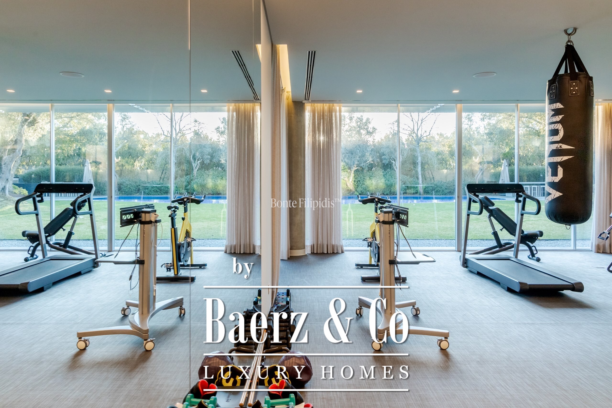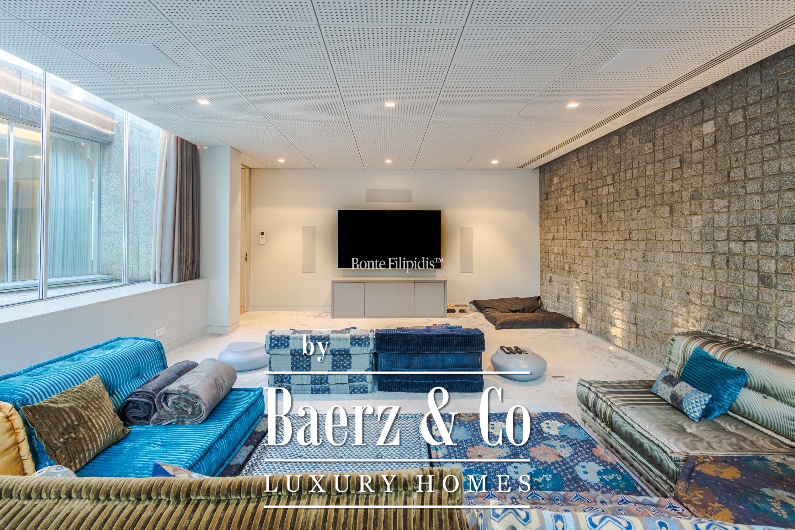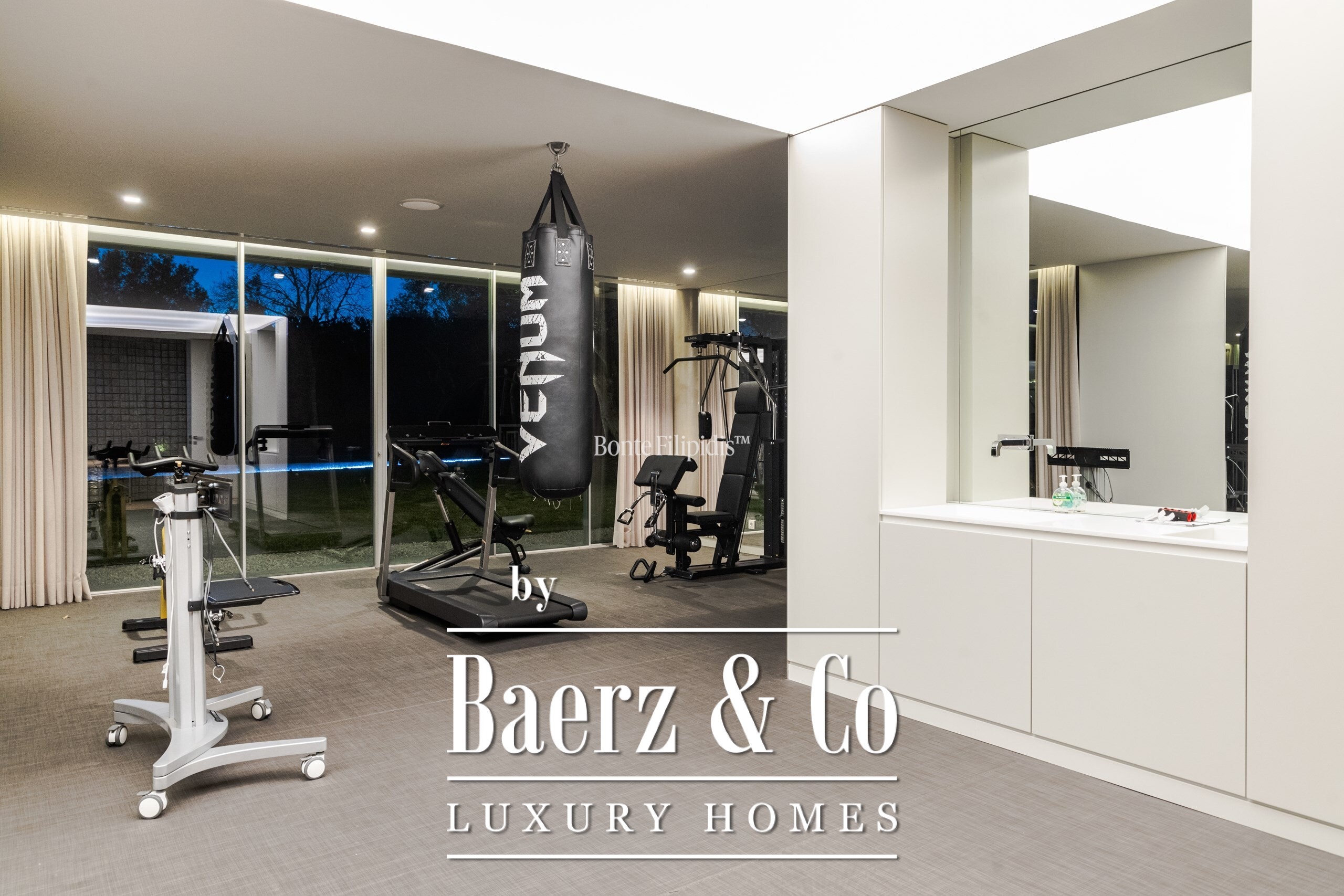 De begane grond wordt gekenmerkt door een royale living die opent naar terrassen voor dineren in de buitenlucht en een barbecuezone. Licht speelt een hoofdrol en verlicht de thuisbioscoop, een werkkamer met uitzicht op de tuin, een gym volledig ingericht op welzijn en een gourmetkeuken voorzien van Gaggenau-apparatuur. Een gastensuite completeert deze verdieping, met een perfecte balans tussen gastvrijheid en zelfstandigheid.