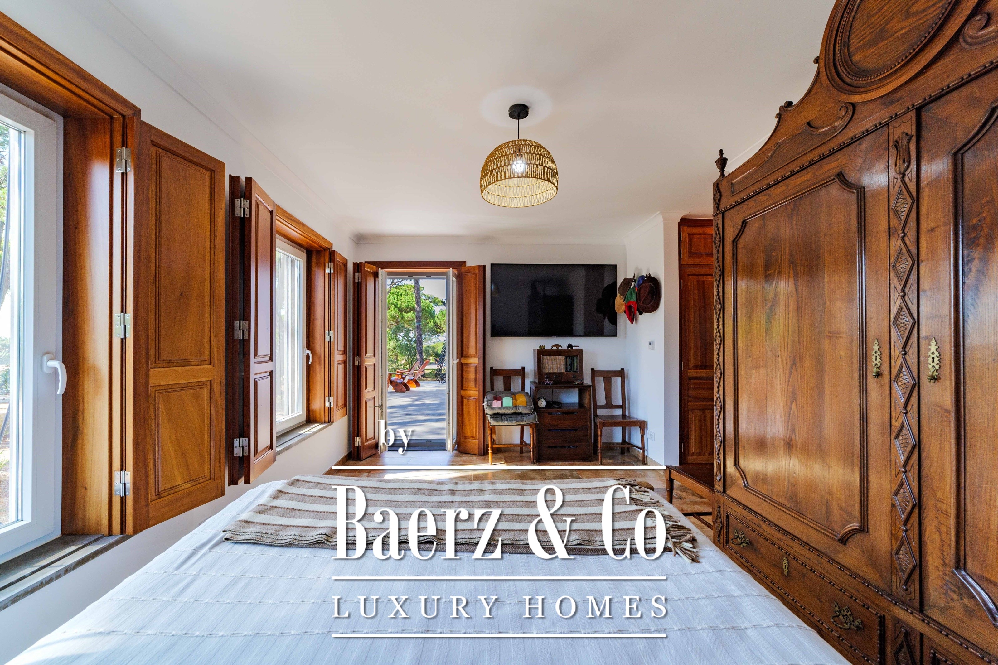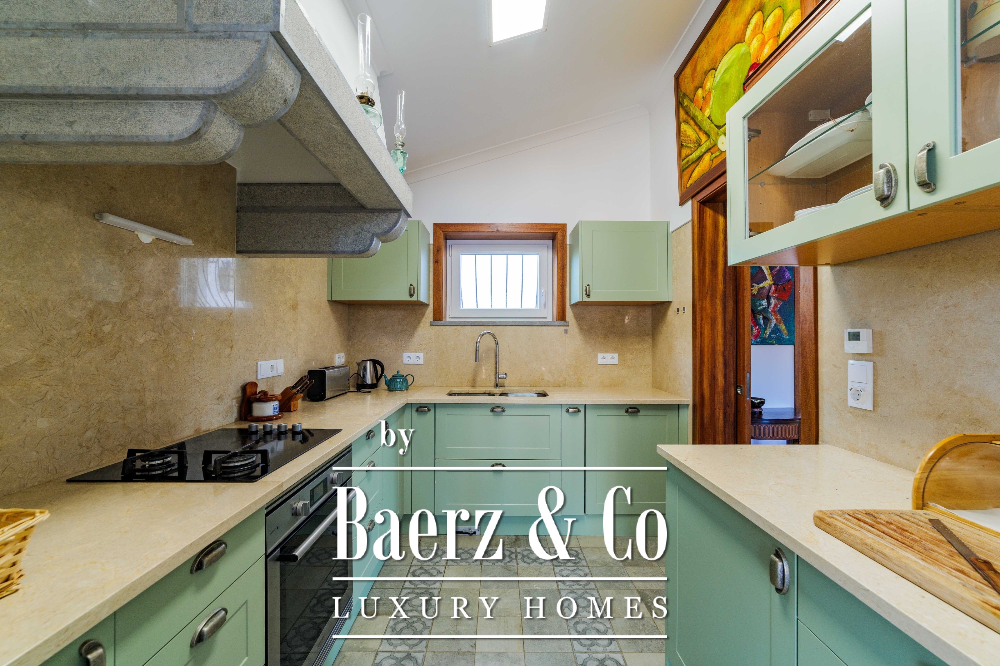 De hoofdresidentie beslaat twee woonlagen en 302 m², voltooid in 2023 met bijzondere aandacht voor authentieke materialen: exotische houtsoorten, natuursteen, traditionele dakpannen van gebakken klei en met de hand vervaardigd smeedijzeren details. Zonlicht van oost tot west vult harmonieus de royaal ingedeelde kamers—ruime woonvertrekken met open haard, een volledig uitgeruste keuken met directe toegang tot de tuin, privé-suites en terrassen georiënteerd op het rustgevende uitzicht over de heuvels van Sintra en de Atlantische Oceaan.