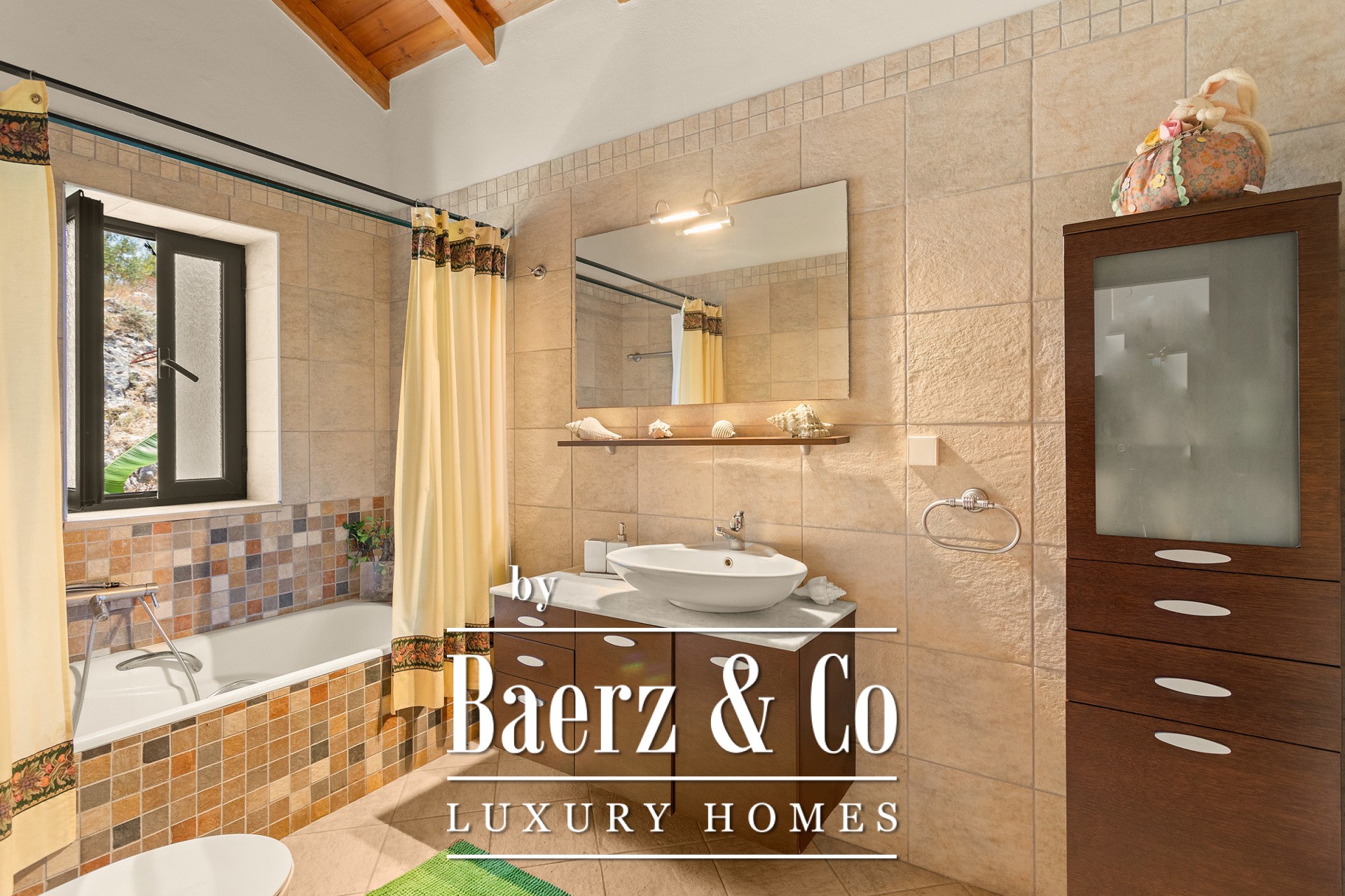 Op de bovenverdiepingen bevinden zich drie extra slaapkamers, waaronder een master suite met inloopkast en en-suite badkamer, elk zorgvuldig gescheiden door eigen terrassen en gesitueerd voor een balans tussen privacy en openheid. De woning beschikt over vijf badkamers, allen met een hoge mate van comfort. Materialen zijn met zorg gekozen: tegels in de algemene ruimtes combineren elegantie met onderhoudsgemak, terwijl eikenhout in alle slaapkamers warmte toevoegt. Ontworpen voor gebruik gedurende het hele jaar is de villa uitgerust met olieverwarming, airconditioning, een zonneboilersysteem en aluminium kozijnen met dubbele beglazing. De veiligheid wordt vergroot door een gepantserde deur en praktische opslagruimtes.