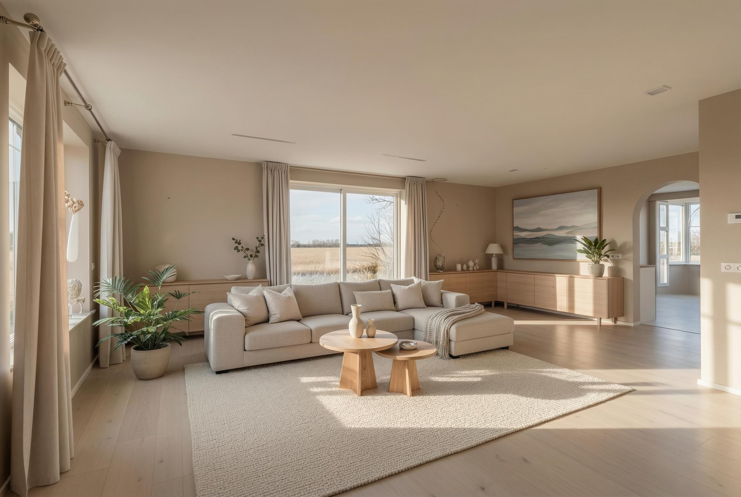 Via de entree komt u in een ruime hal met toegang tot de verschillende vertrekken. De royale woonkamer is georiënteerd op het water en de Friese vergezichten en biedt dankzij de grote raampartijen een adembenemend uitzicht. Aansluitend bevindt zich de serre met dubbele tuindeuren, een heerlijke lichte plek die binnen en buiten naadloos met elkaar verbindt.
