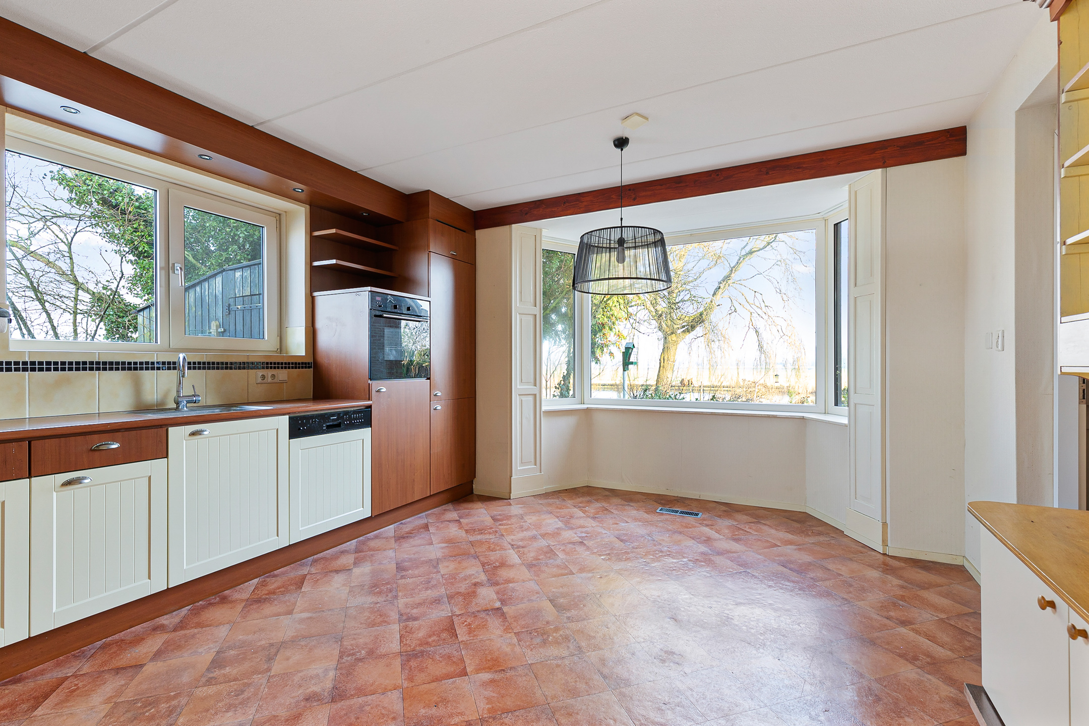 De ruime woonkeuken is voorzien van inbouwapparatuur en een sfeervolle erker met uitzicht over de tuin en weilanden. Verder vindt u op de begane grond een bijkeuken, een royale slaapkamer met tuindeuren, een badkamer met toilet, wastafel en douche, alsmede toegang tot de inpandige garage.