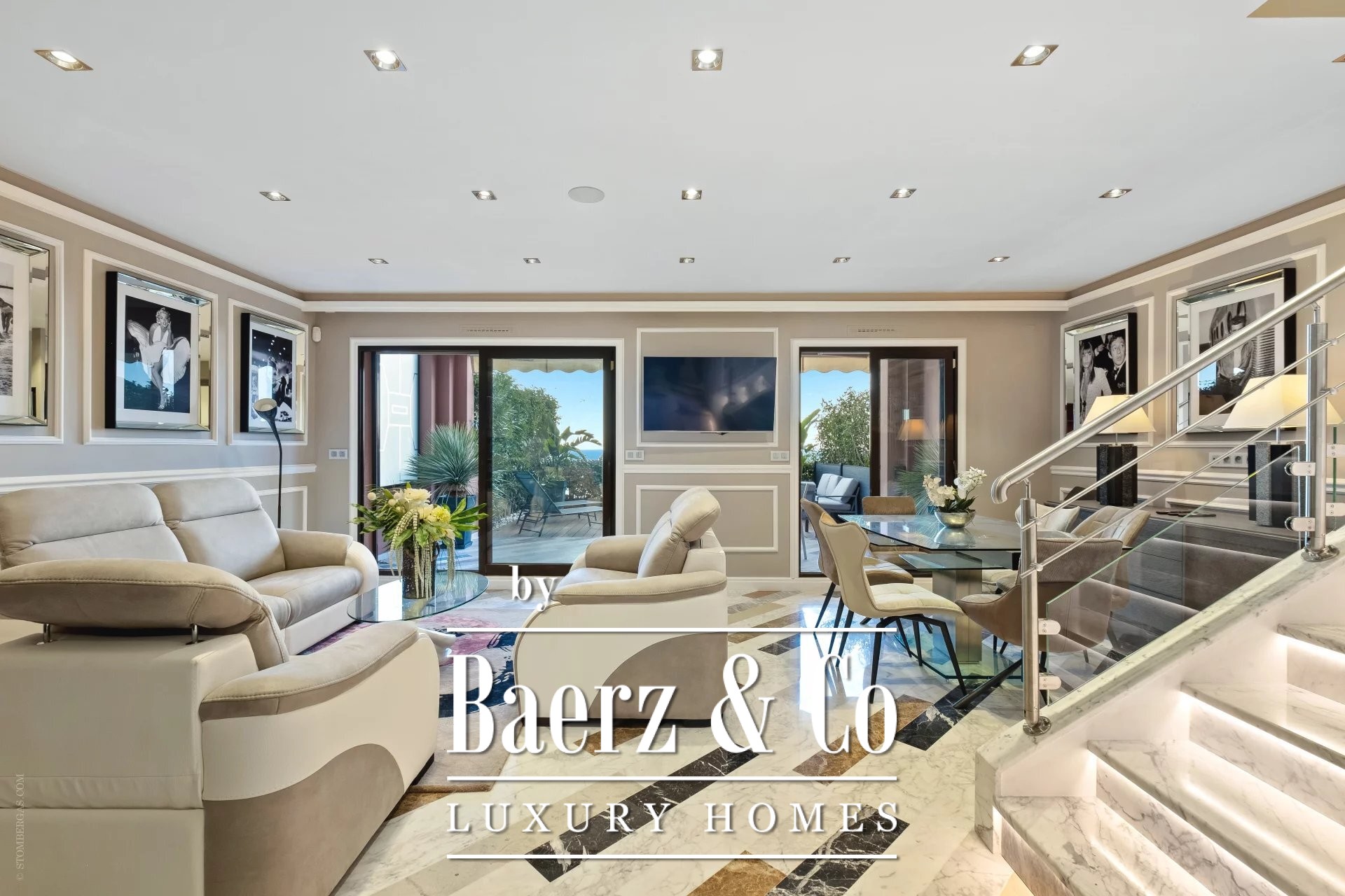 Op de bovenverdieping bieden drie slaapkamers met en-suite badkamers rust en privacy, afgewerkt met hoogwaardige materialen. De hoofdslaapkamer opent naar een privéterras van 16 m² met panoramisch zeezicht, waardoor elke dag gekaderd wordt door bijzonder licht en uitzicht. De vloeiende overgang tussen binnen en buiten is voelbaar in elk detail van dit luxe duplex appartement te koop in Théoule-sur-Mer.