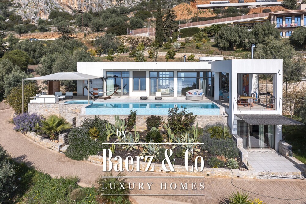Technische perfectie omvat vloerverwarming, centrale airconditioning, geavanceerde isolatie, dubbele beglazing, LED-verlichting en overal wifi. Buiten zijn er voorzieningen zoals een elektrische buggy, overdekte parkeergelegenheid, volwassen olijf- en fruitbomen en automatische irrigatie, ideaal voor comfortabel wonen het hele jaar door. Volledig gemeubileerd en instapklaar aangeboden, combineert deze luxe villa te koop in Tolo architecturale helderheid, verfijnde voorzieningen en een intieme band met zijn Egeïsche omgeving. Het eigendom kan tevens samen met Villa Sunrise worden verworven, voor een uitzonderlijk toevluchtsoord aan de Griekse kust.