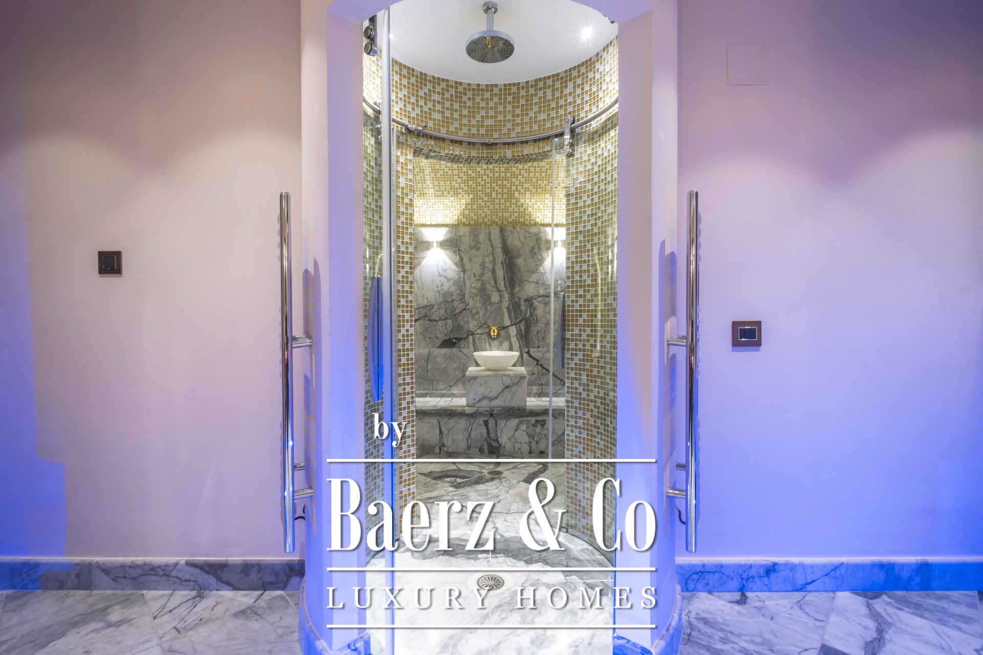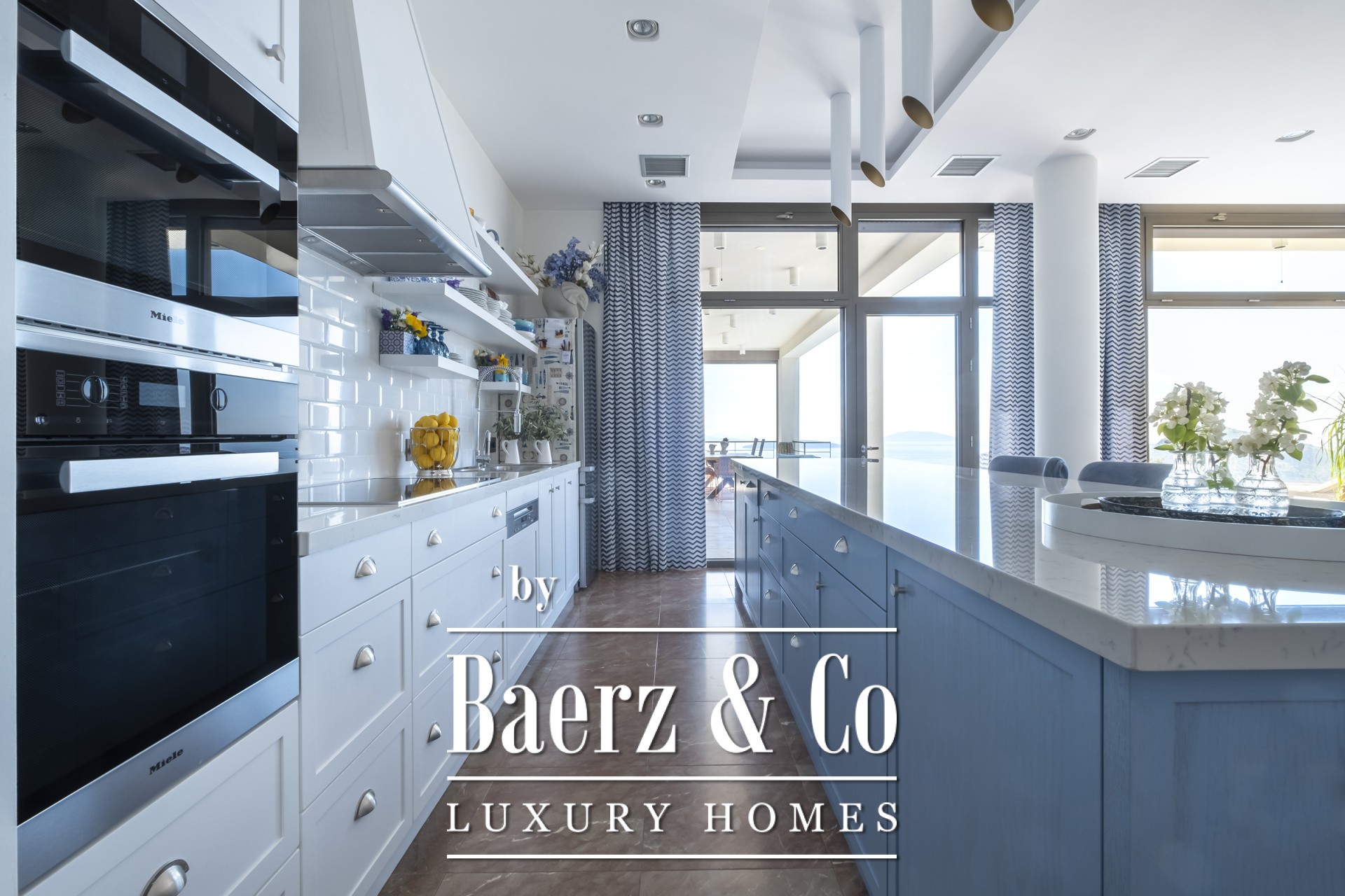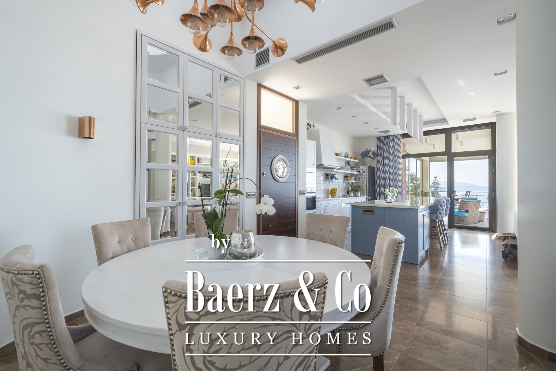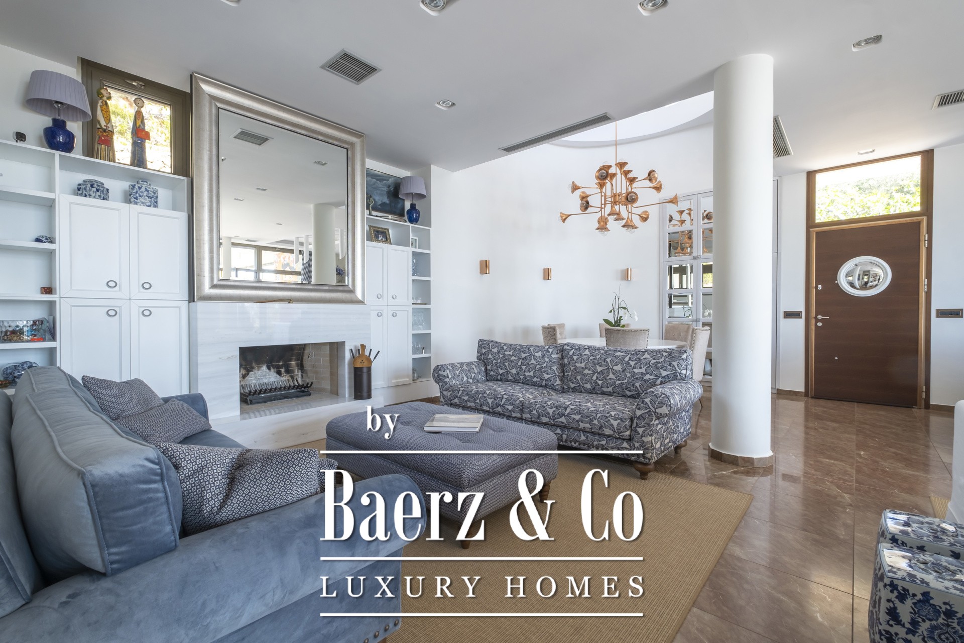 Binnen kenmerkt de open woonkamer zich door zachte wittinten, blauwe en koperen accenten en een op maat gemaakte marmeren open haard. Het hart van het huis is de Miele-keuken, met een opvallend blauw werkblad, fraai geïntegreerd in de marmeren vloeren die door de hele villa lopen. De villa beschikt over vier karakteristieke slaapkamers, waaronder een hoofdbadkamer met dubbele entree, een studeer- of logeerkamer, een volledig uitgeruste fitnessruimte en een opvallende, klimaatgeregelde wijnkelder. De spa-suite heeft een binnenjacuzzi met maatwerk zitplekken en een hammam met douche voor een ultiem gevoel van welzijn, waarbij het geïntegreerde audiosysteem de sfeer van de fitnessruimte tot aan de buitenbar voortzet.
