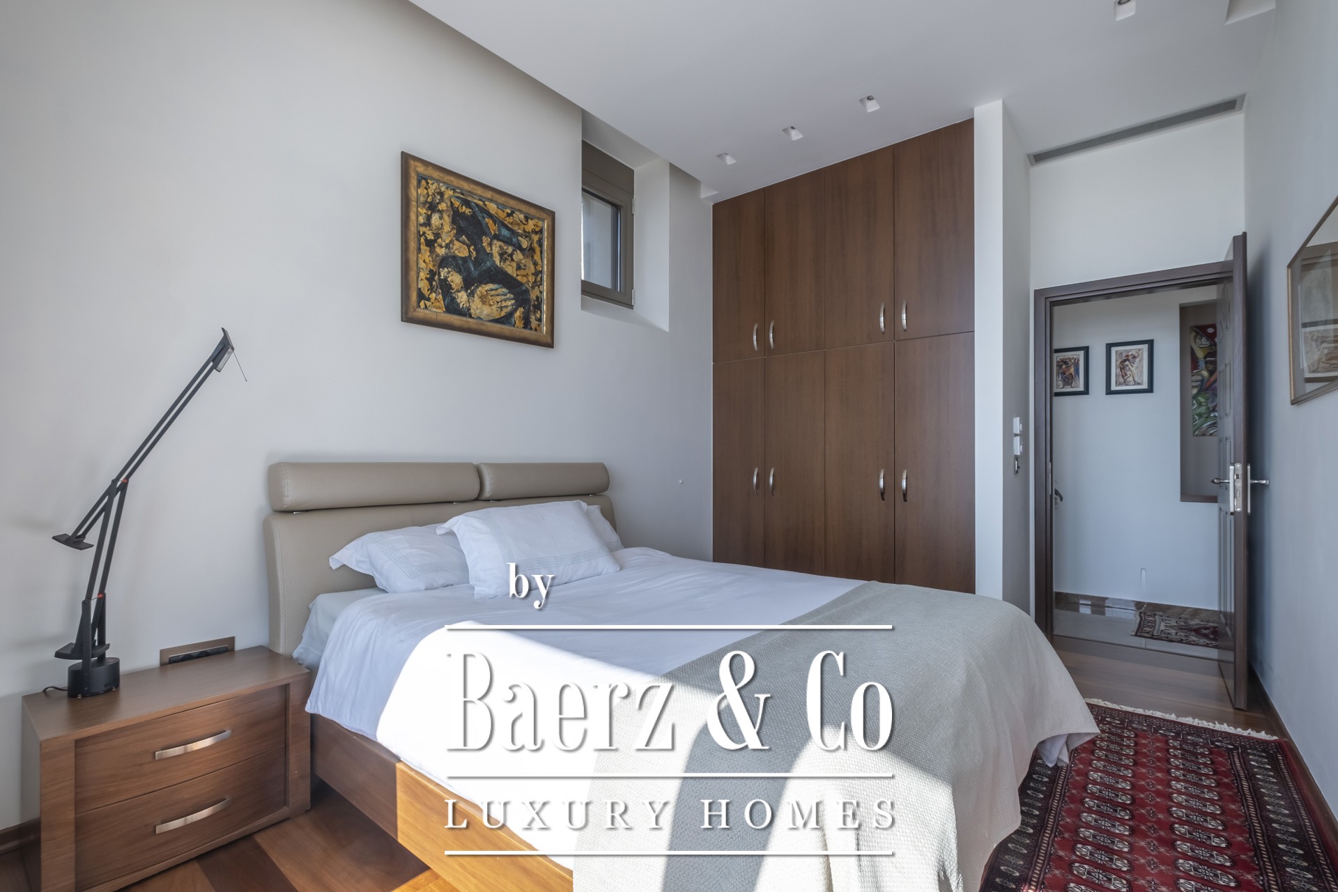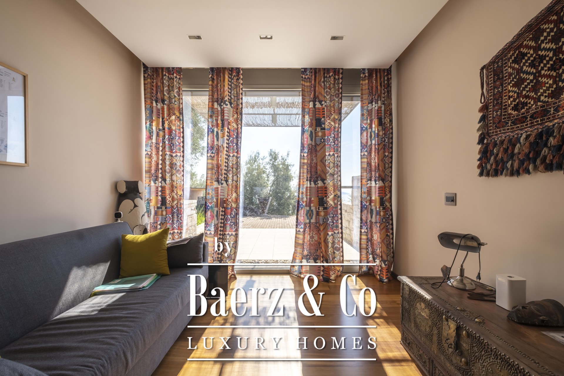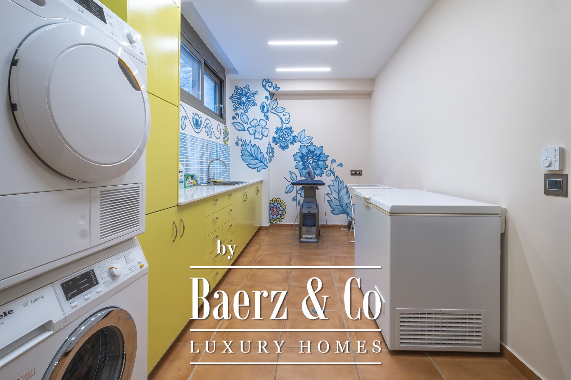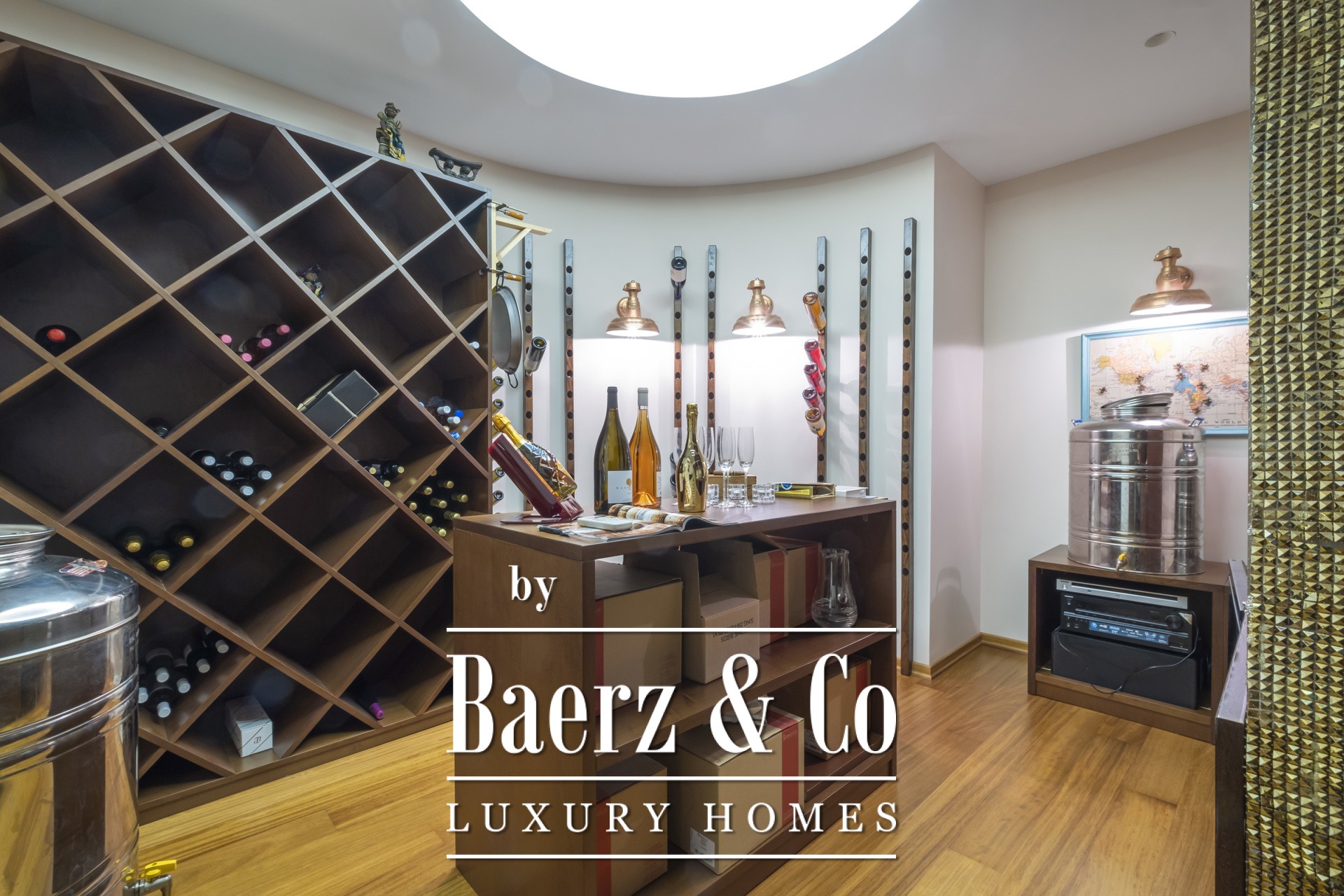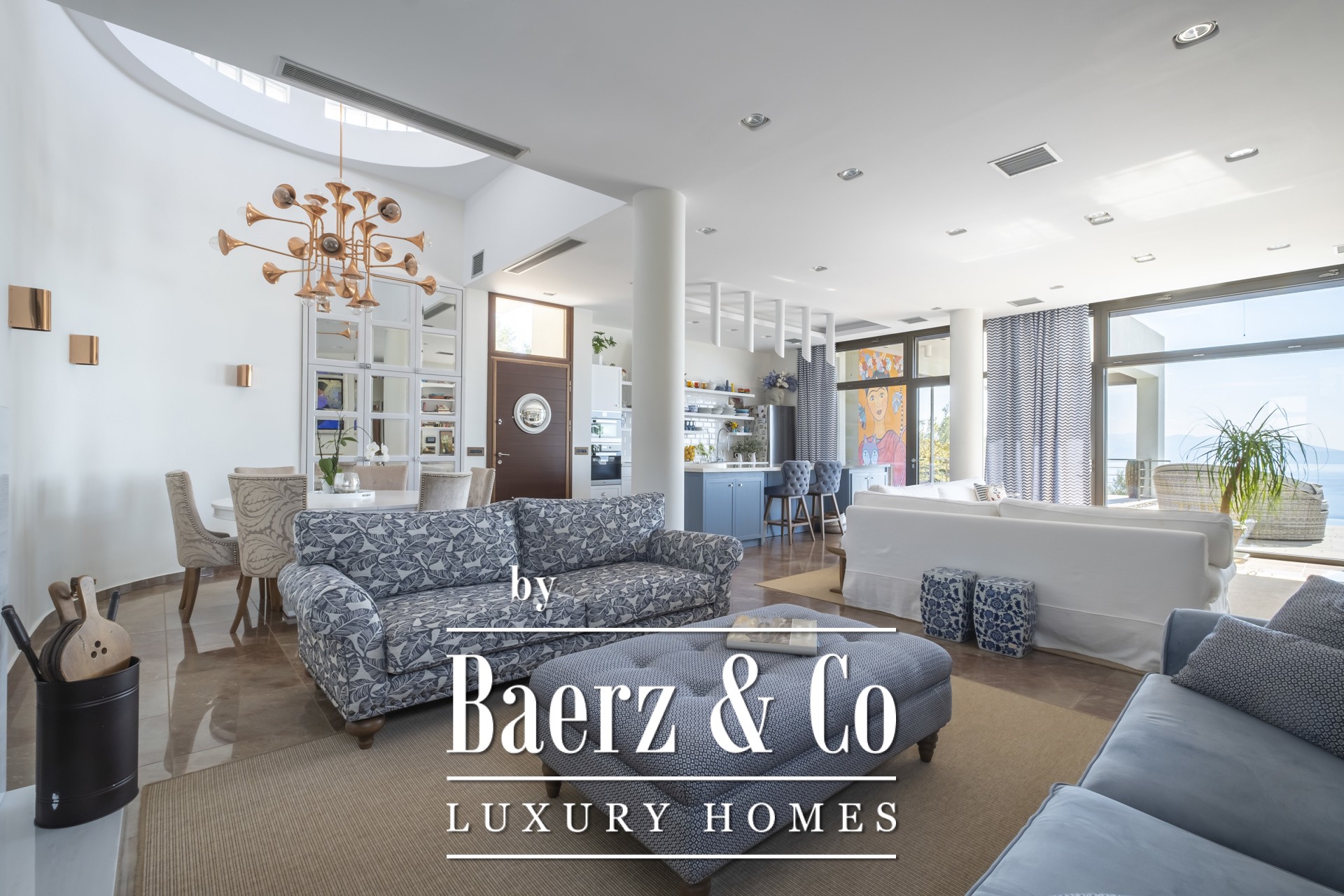 Binnen kenmerkt de open woonkamer zich door zachte wittinten, blauwe en koperen accenten en een op maat gemaakte marmeren open haard. Het hart van het huis is de Miele-keuken, met een opvallend blauw werkblad, fraai geïntegreerd in de marmeren vloeren die door de hele villa lopen. De villa beschikt over vier karakteristieke slaapkamers, waaronder een hoofdbadkamer met dubbele entree, een studeer- of logeerkamer, een volledig uitgeruste fitnessruimte en een opvallende, klimaatgeregelde wijnkelder. De spa-suite heeft een binnenjacuzzi met maatwerk zitplekken en een hammam met douche voor een ultiem gevoel van welzijn, waarbij het geïntegreerde audiosysteem de sfeer van de fitnessruimte tot aan de buitenbar voortzet.