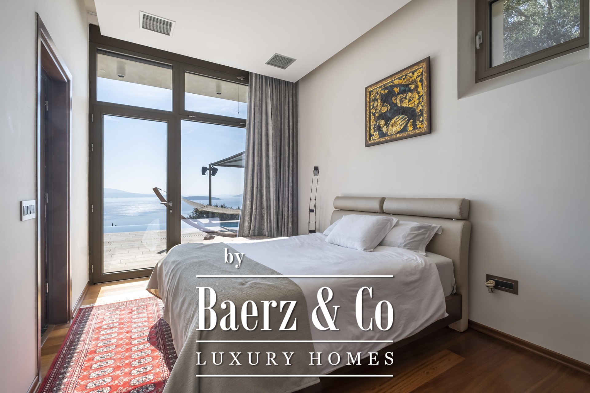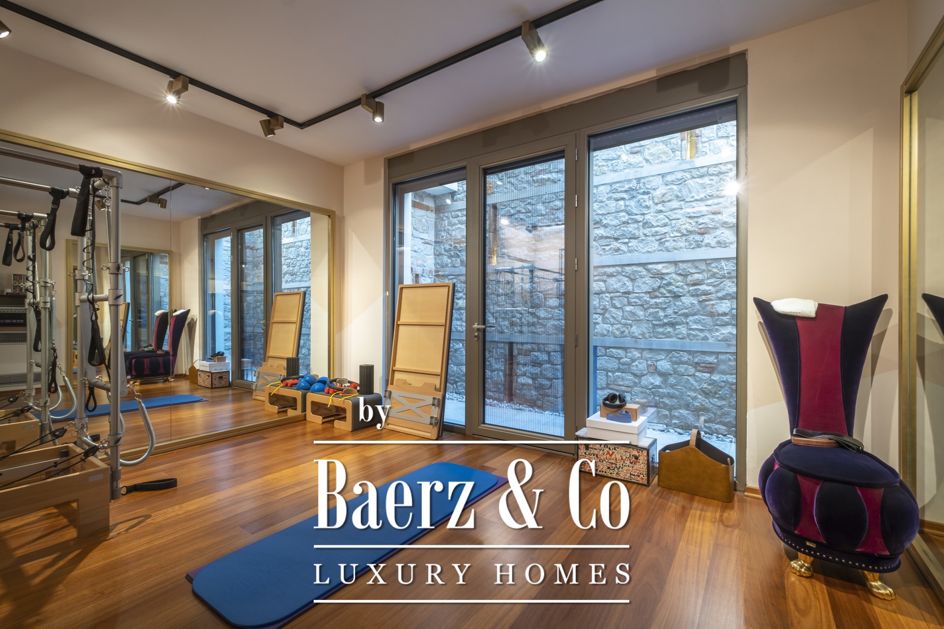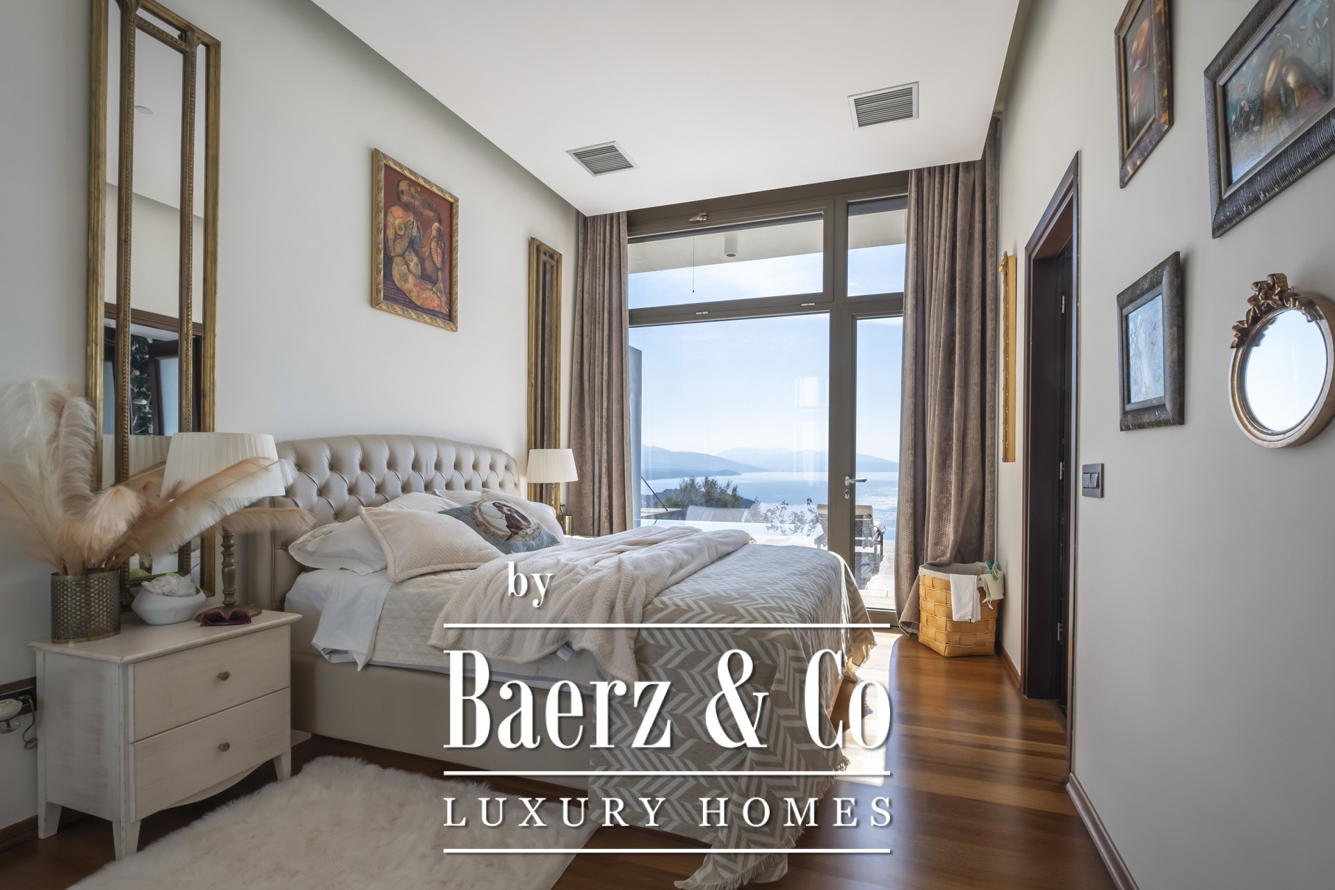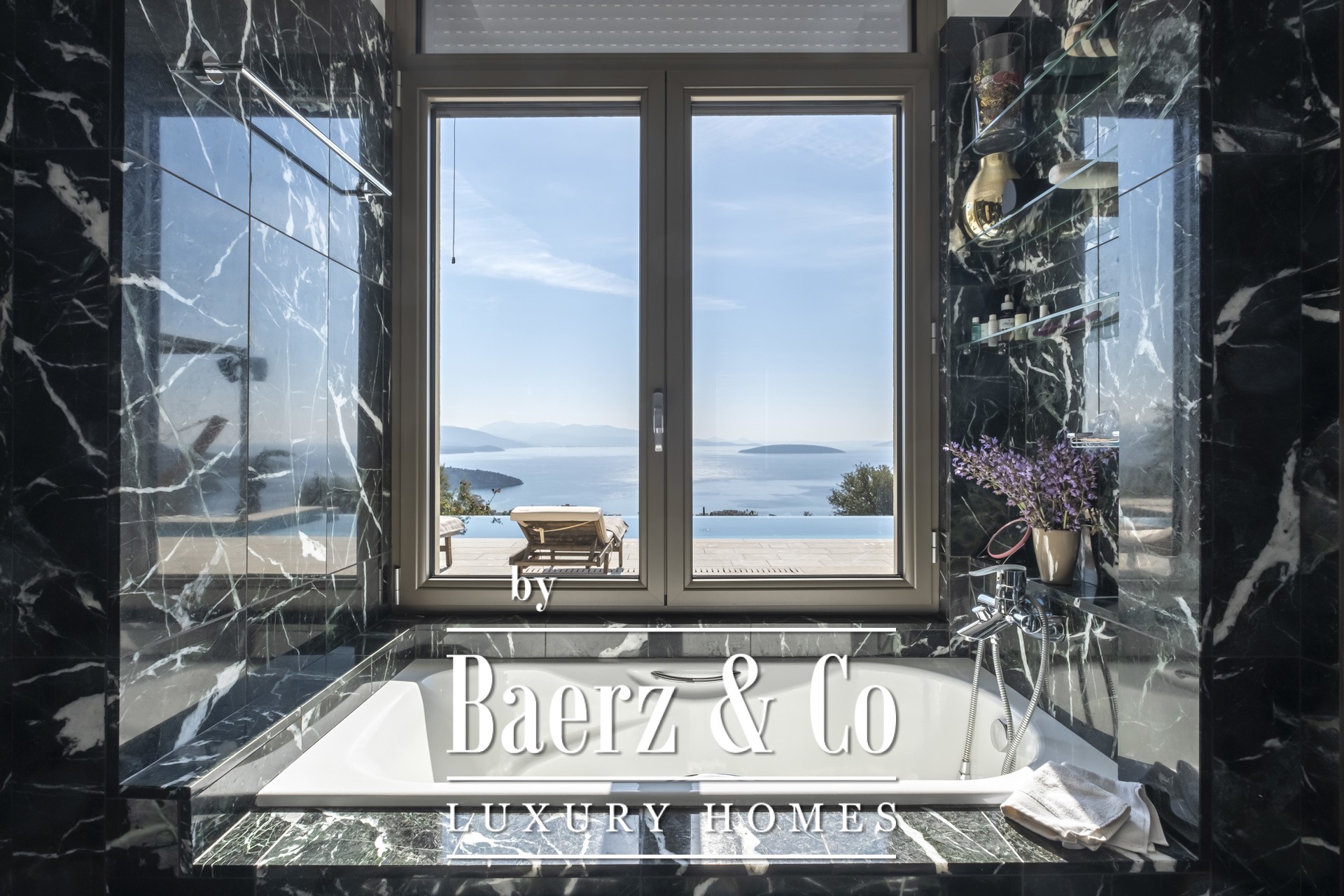 Binnen kenmerkt de open woonkamer zich door zachte wittinten, blauwe en koperen accenten en een op maat gemaakte marmeren open haard. Het hart van het huis is de Miele-keuken, met een opvallend blauw werkblad, fraai geïntegreerd in de marmeren vloeren die door de hele villa lopen. De villa beschikt over vier karakteristieke slaapkamers, waaronder een hoofdbadkamer met dubbele entree, een studeer- of logeerkamer, een volledig uitgeruste fitnessruimte en een opvallende, klimaatgeregelde wijnkelder. De spa-suite heeft een binnenjacuzzi met maatwerk zitplekken en een hammam met douche voor een ultiem gevoel van welzijn, waarbij het geïntegreerde audiosysteem de sfeer van de fitnessruimte tot aan de buitenbar voortzet.