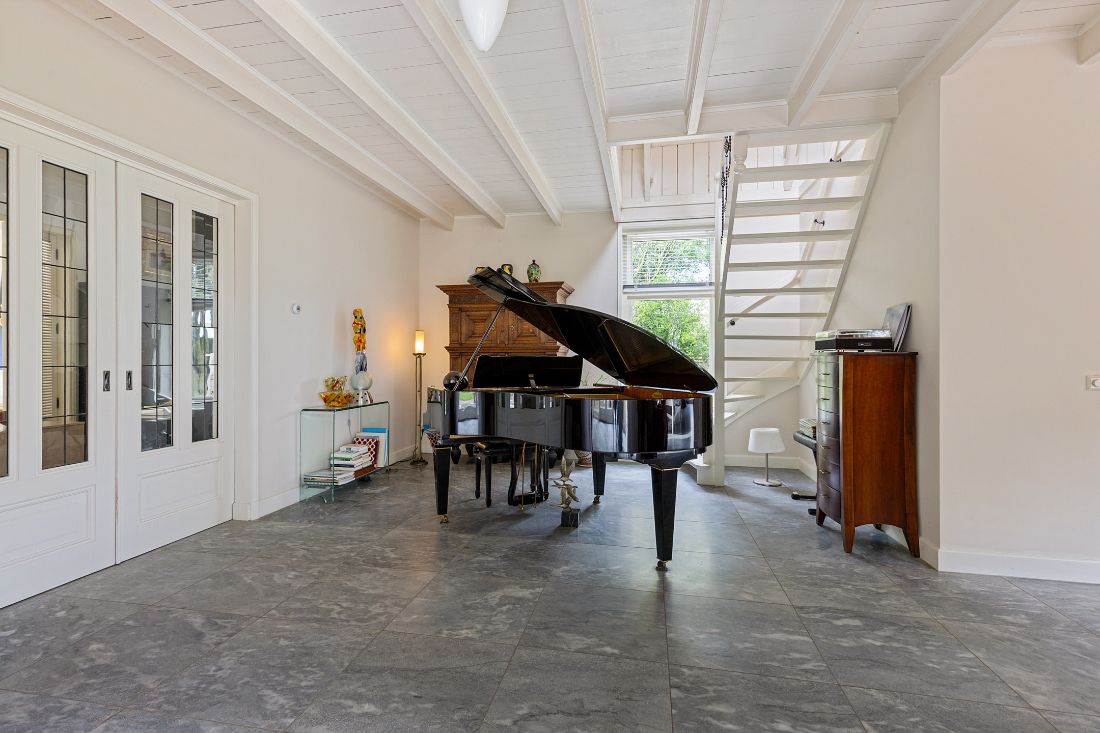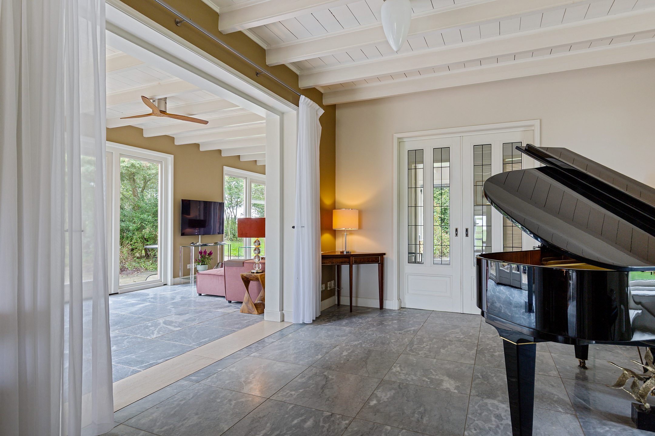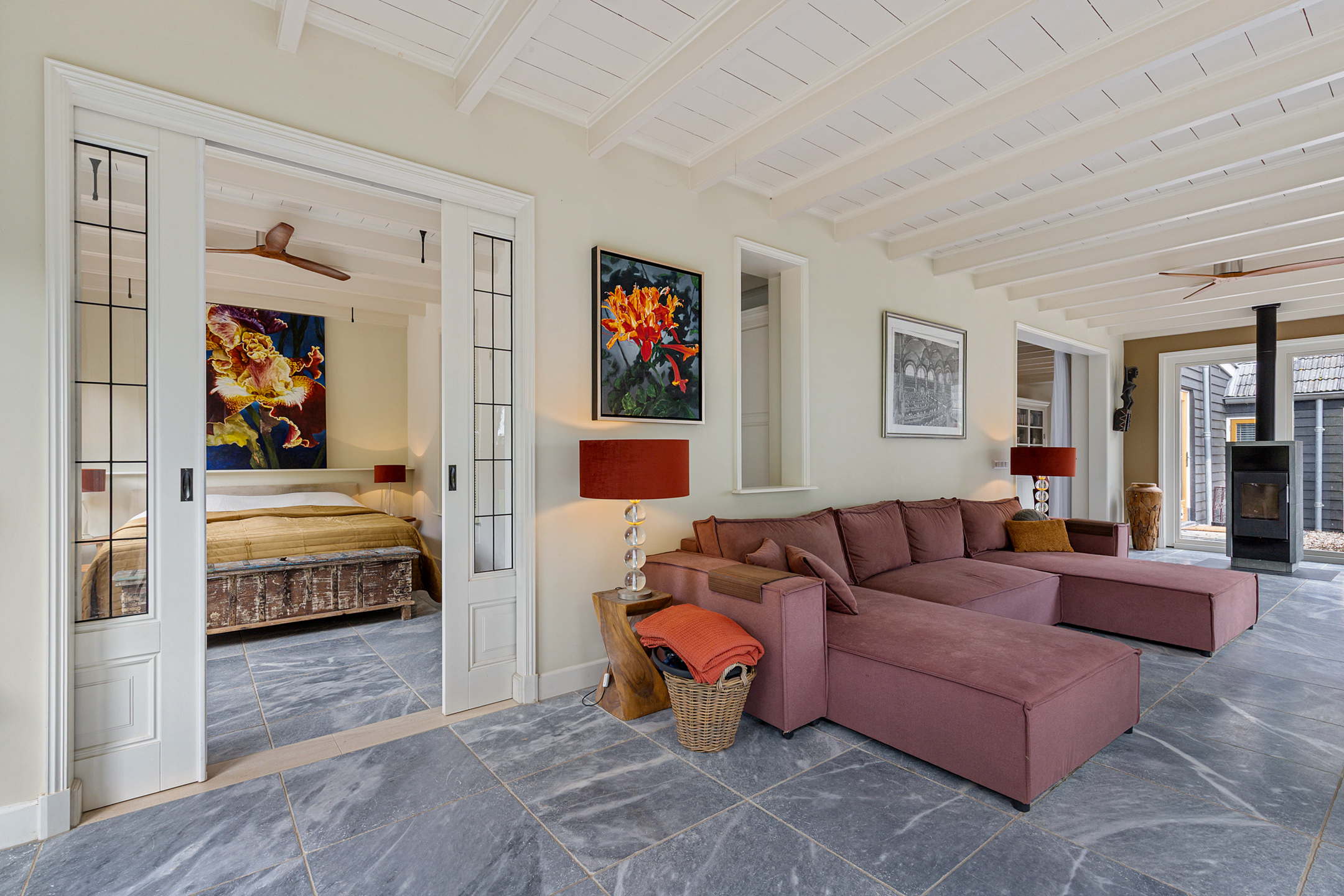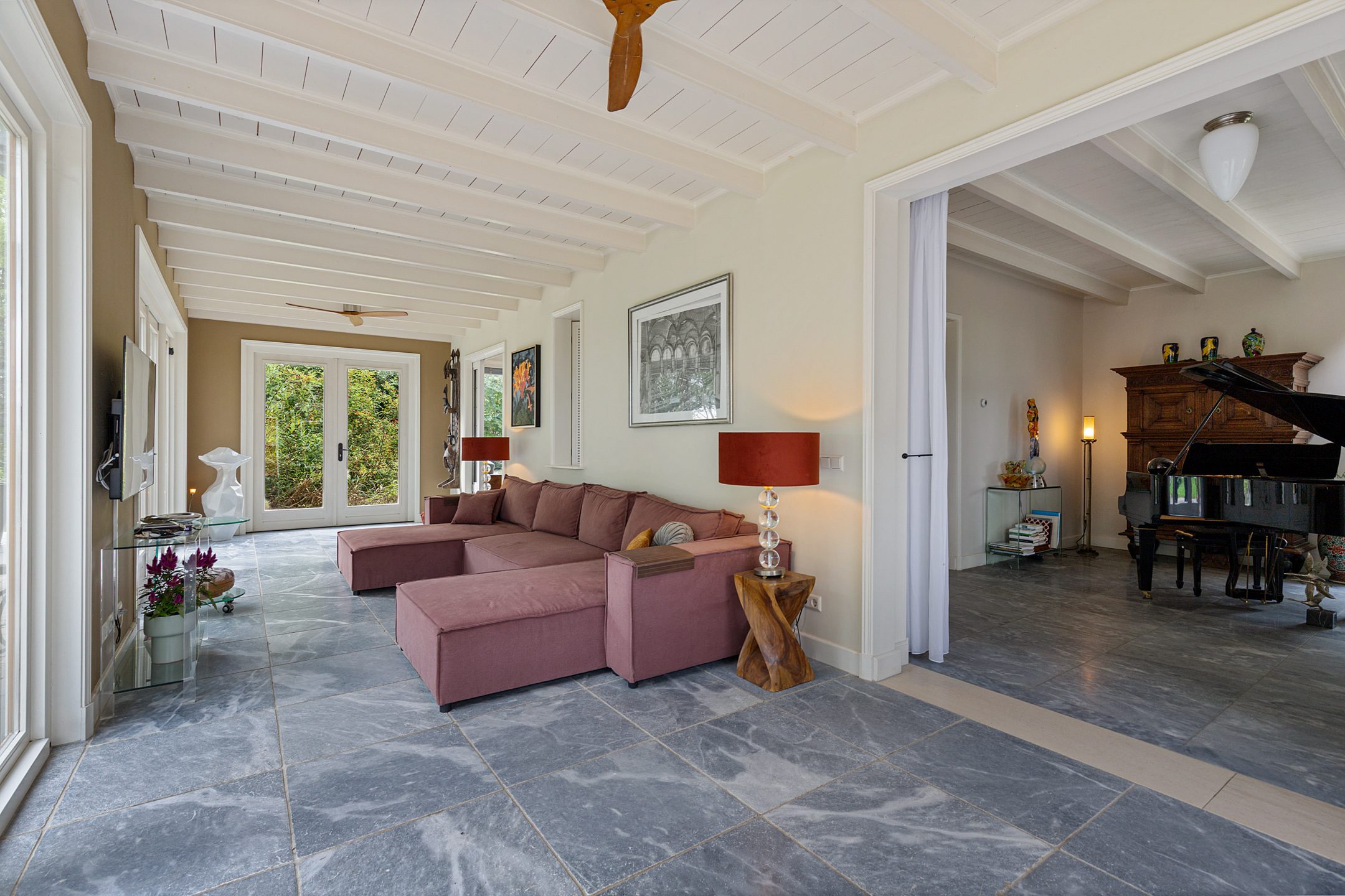 De woonkamer in de rechterflank van het huis toont het originele balkenplafond. De L-vormige living bestaat uit een muziekkamer met trap naar de verdieping, glas-in-lood schuifdeuren naar een werkkamer en een royale lichte tuinkamer met openslaande deuren en uitzicht op tuin, paardenstallen en boomgaard. Glas-in-lood deuren verbinden de tuinkamer met de master bedroom, die via een aparte ingang toegang heeft tot de wellnessruimte met jacuzzi, sauna, zonneterras en buitendouche. De master is verbonden met een werkkamer/walk-in closet.