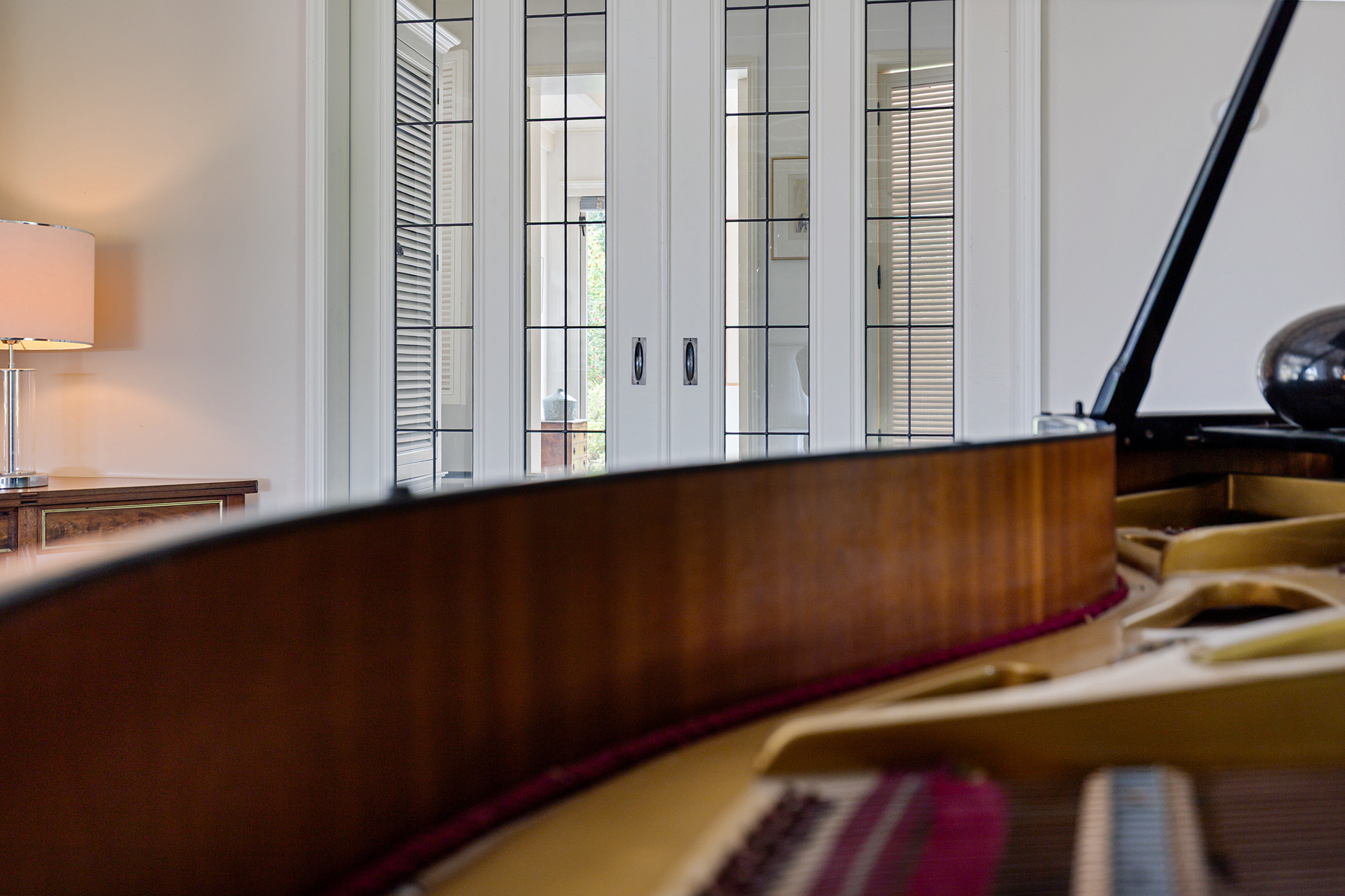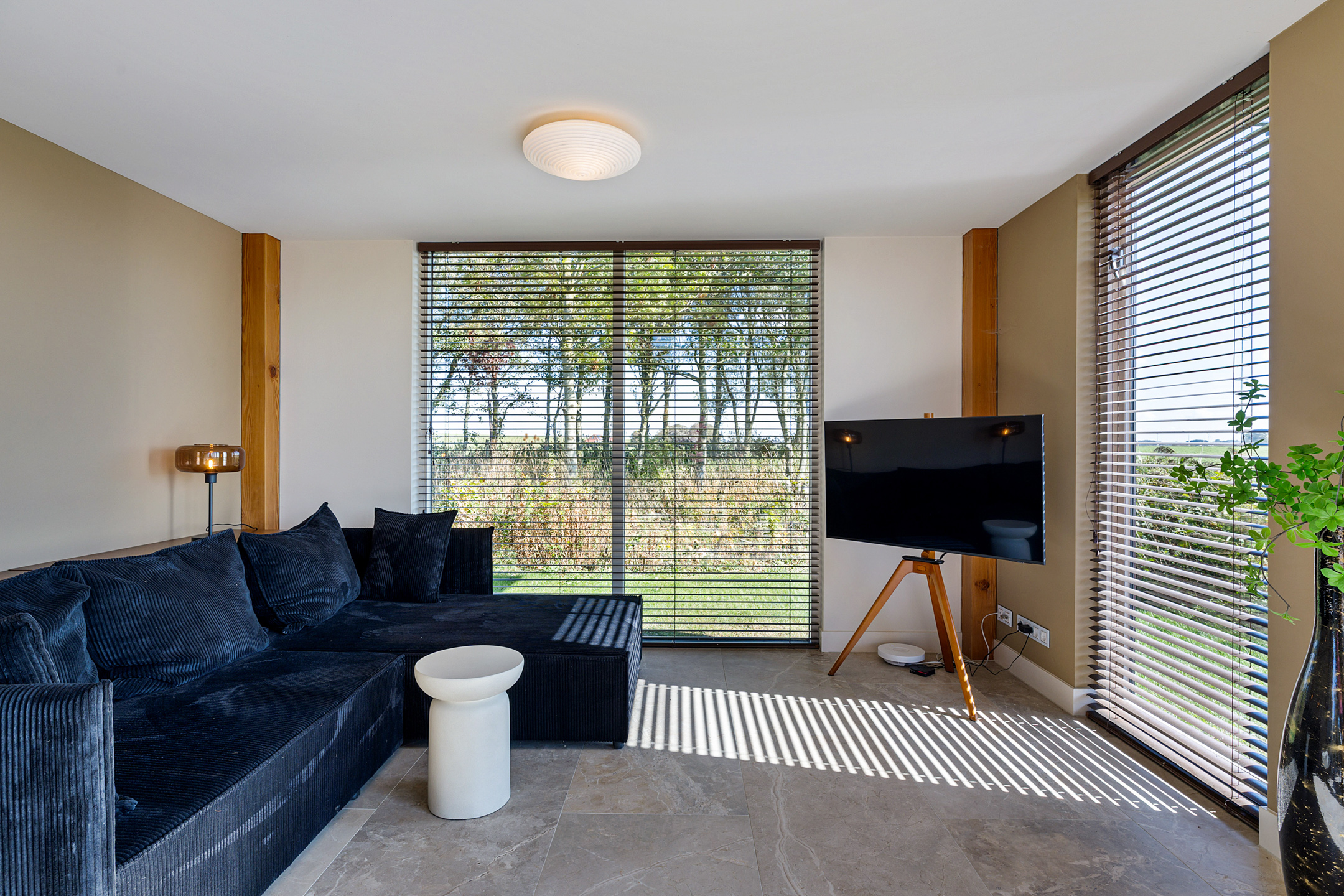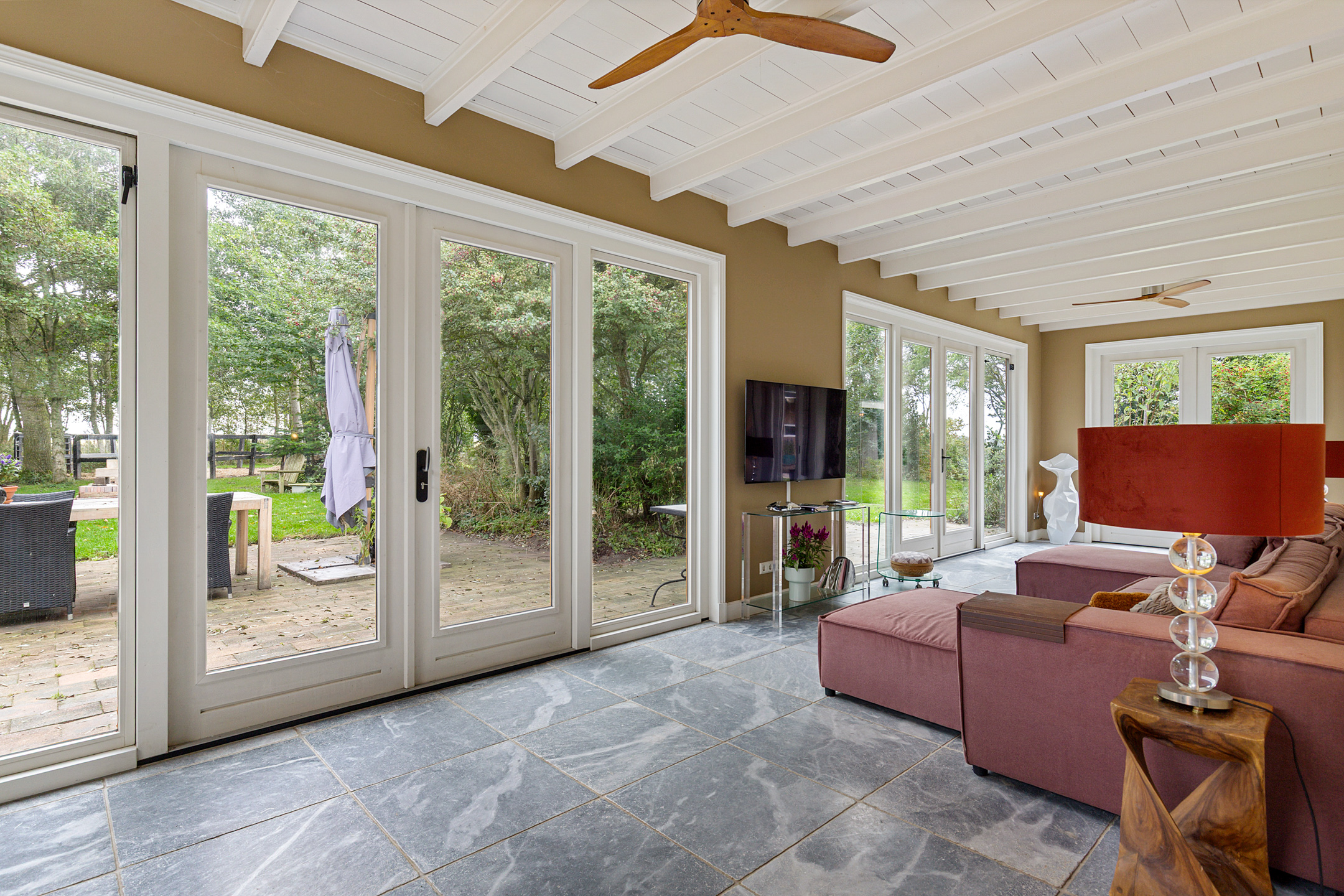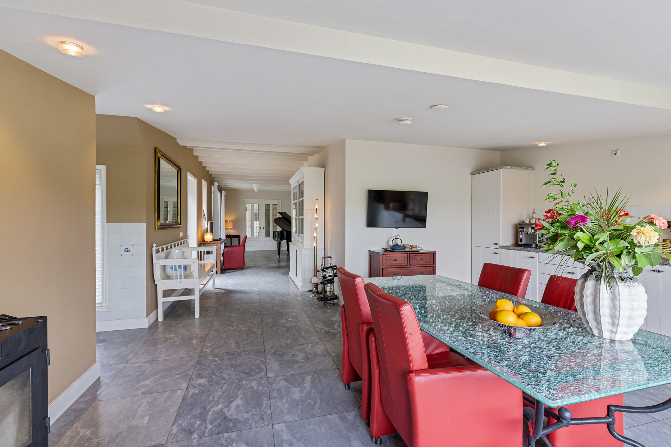 De woonkamer in de rechterflank van het huis toont het originele balkenplafond. De L-vormige living bestaat uit een muziekkamer met trap naar de verdieping, glas-in-lood schuifdeuren naar een werkkamer en een royale lichte tuinkamer met openslaande deuren en uitzicht op tuin, paardenstallen en boomgaard. Glas-in-lood deuren verbinden de tuinkamer met de master bedroom, die via een aparte ingang toegang heeft tot de wellnessruimte met jacuzzi, sauna, zonneterras en buitendouche. De master is verbonden met een werkkamer/walk-in closet.