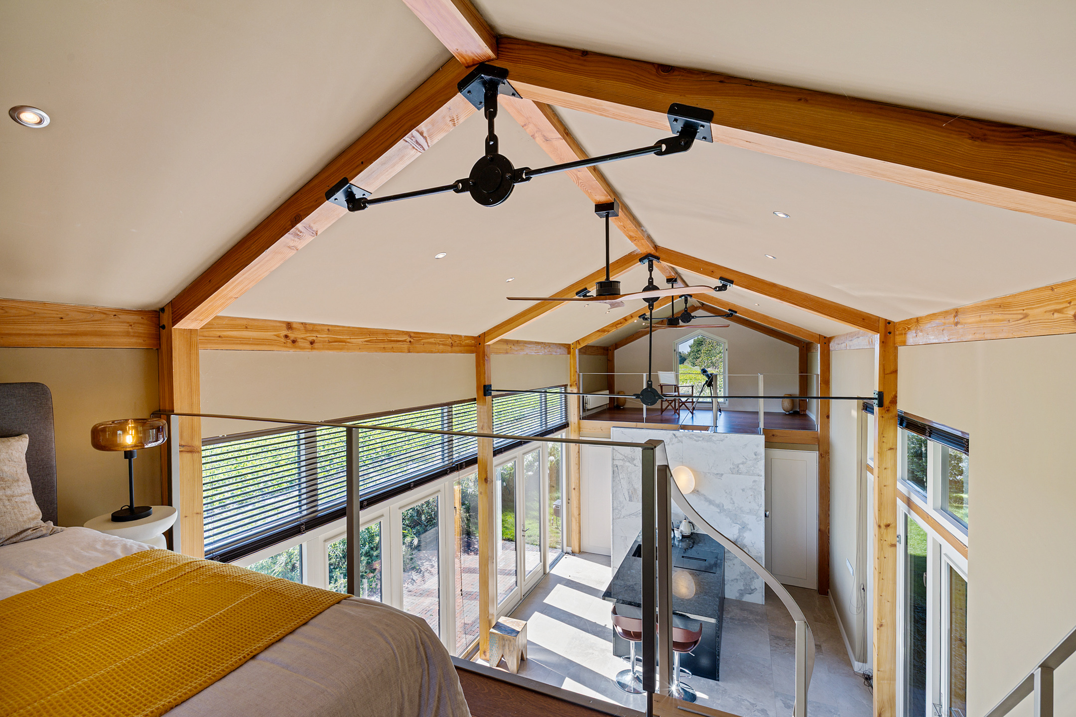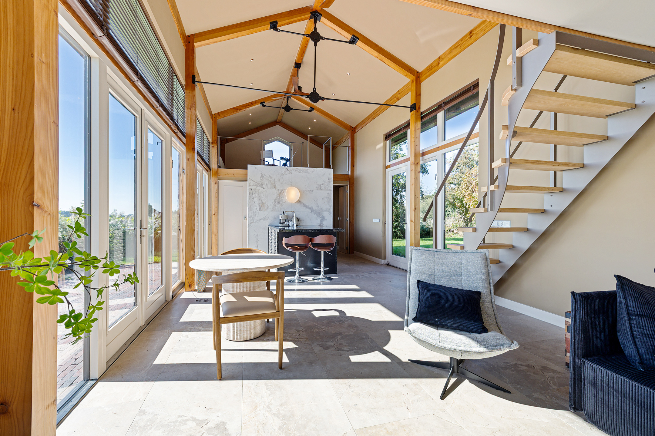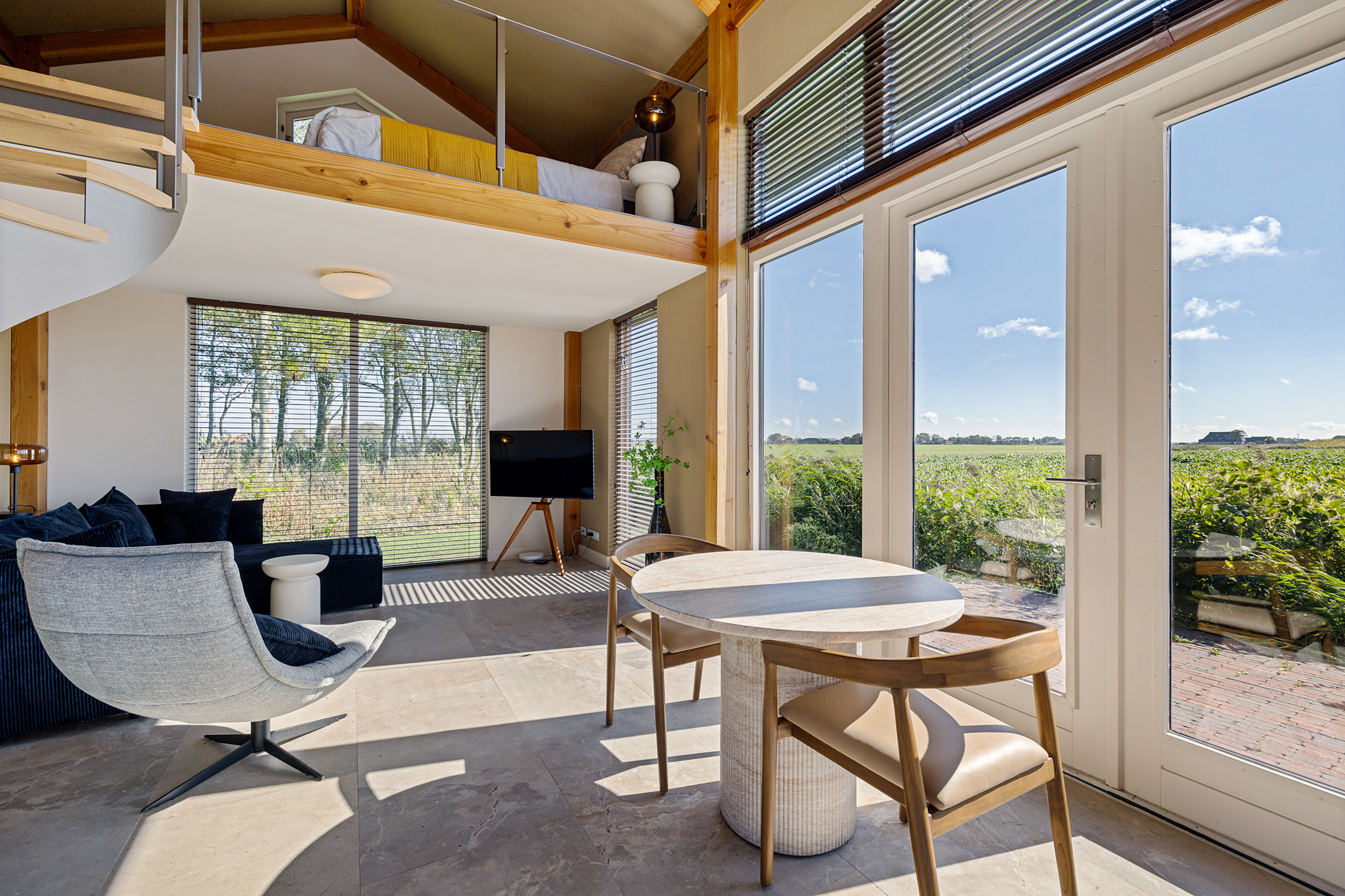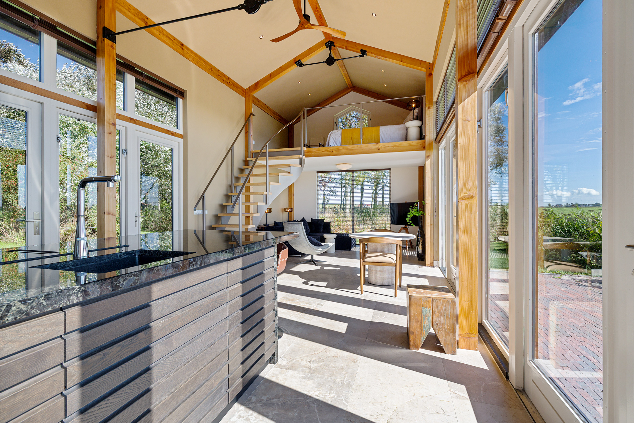 De living of het kantoor heeft een prominente plek onder de linker loft.