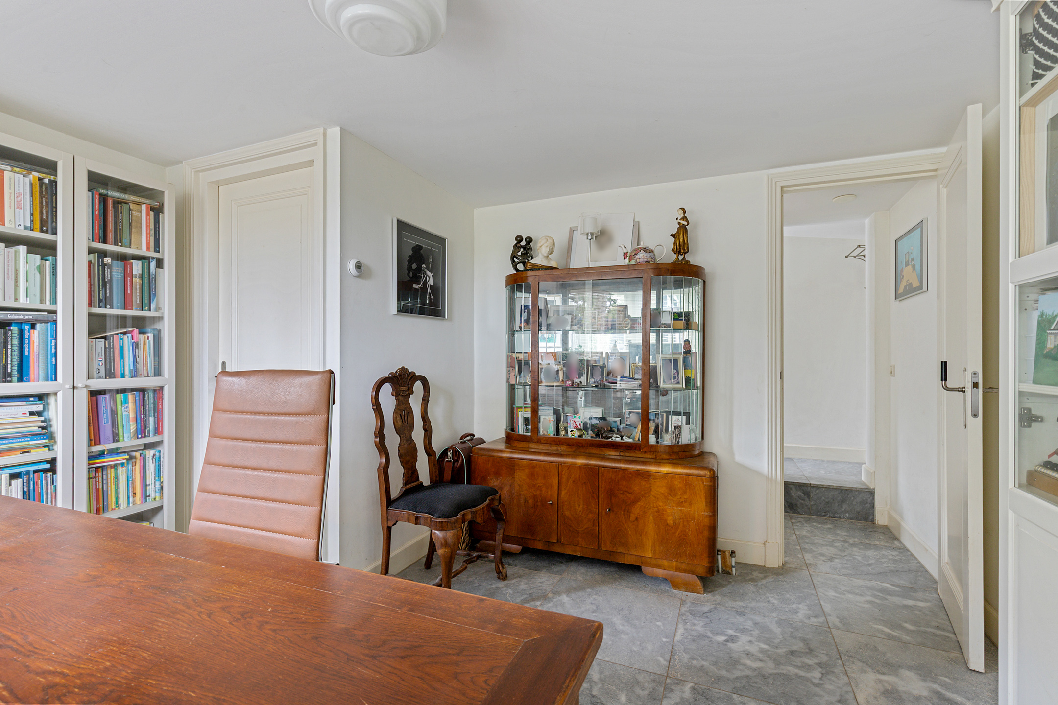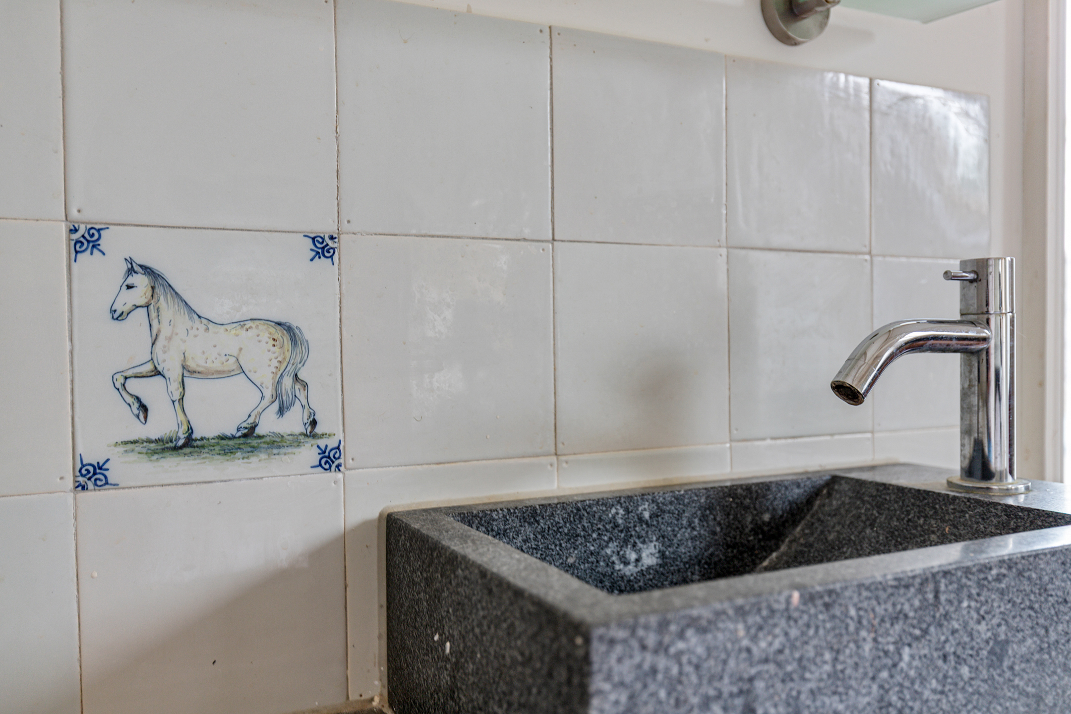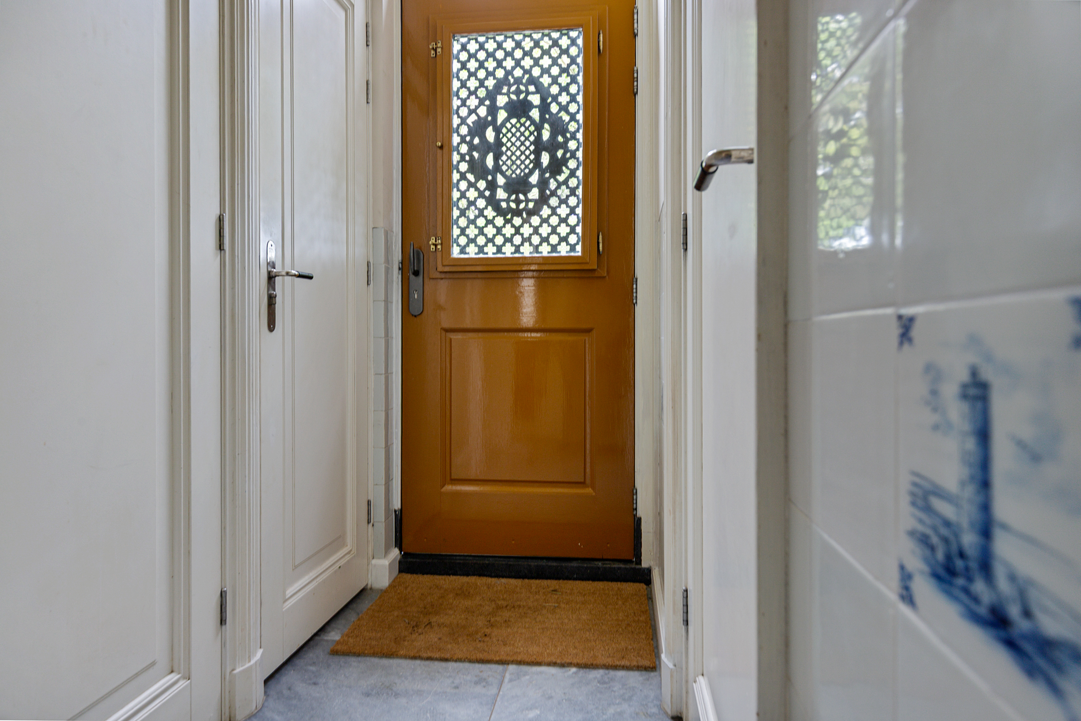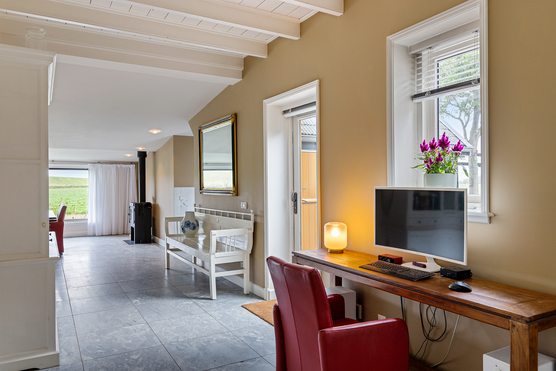 Bij binnenkomst valt meteen de stijl op: de voordeur met sierlijk smeedijzeren deurlichtrooster, een wand van oude Friese tegeltjes en een hardstenen vloer zetten de toon van dit zorgvuldig verbouwde dijkhuis. De hal geeft toegang tot een royale badkamer met dubbel wastafelmeubel, ligbad, inloopdouche en toilet.