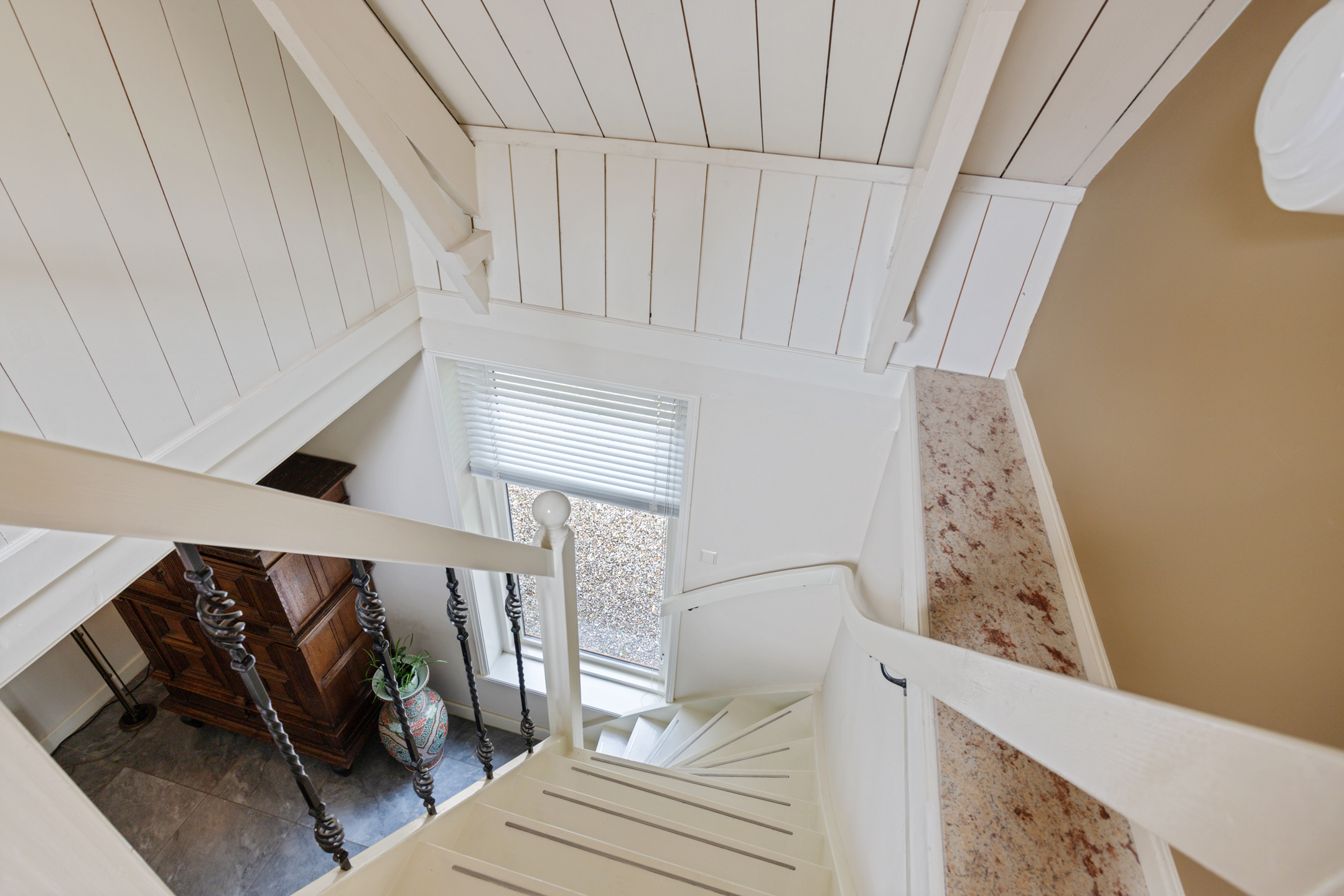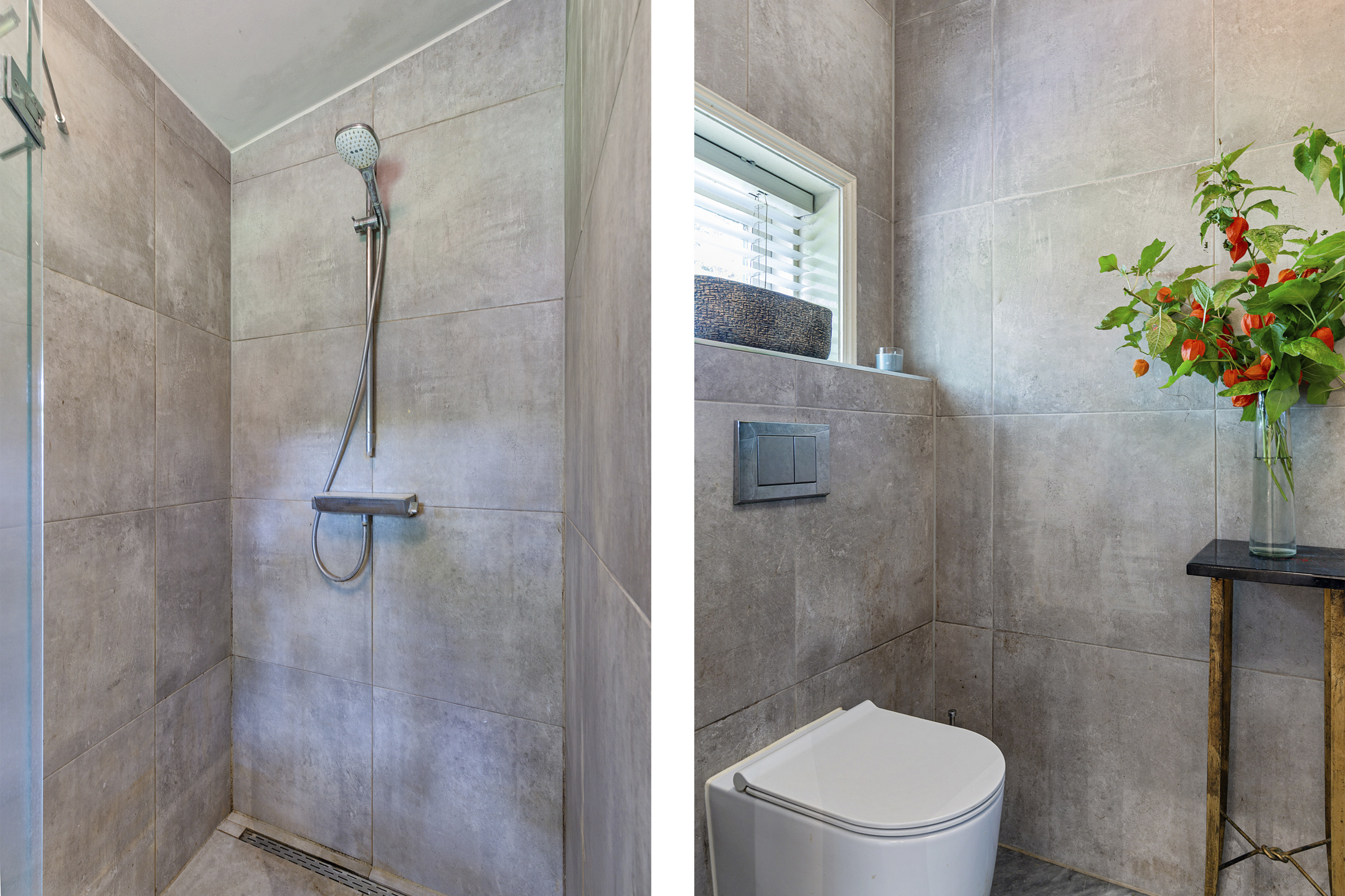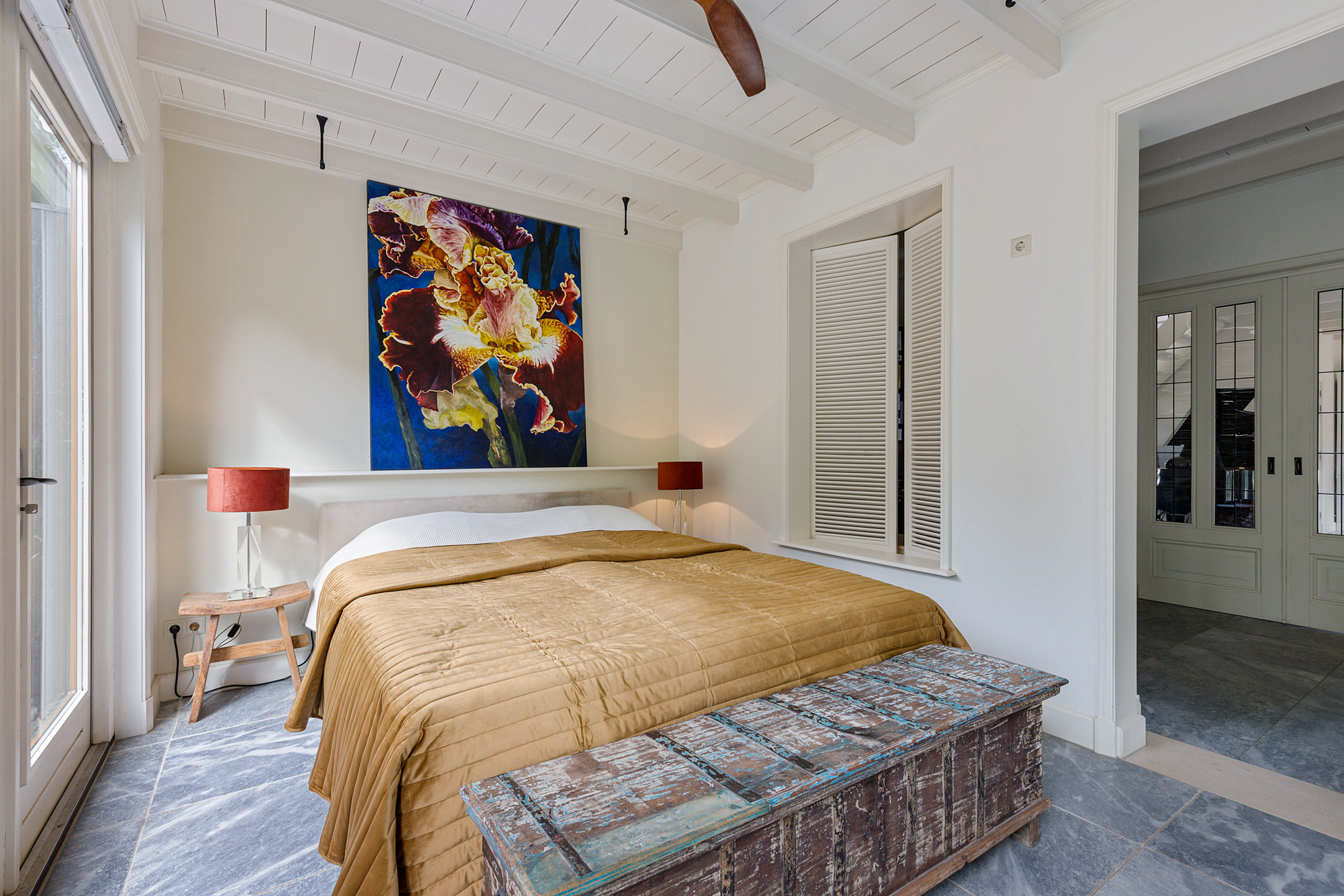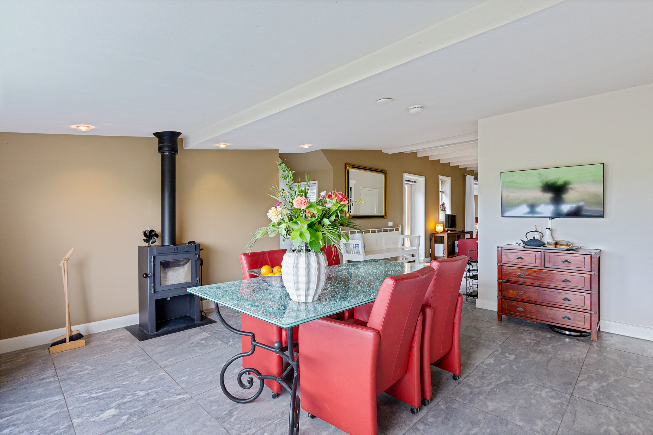 Bij binnenkomst valt meteen de stijl op: de voordeur met sierlijk smeedijzeren deurlichtrooster, een wand van oude Friese tegeltjes en een hardstenen vloer zetten de toon van dit zorgvuldig verbouwde dijkhuis. De hal geeft toegang tot een royale badkamer met dubbel wastafelmeubel, ligbad, inloopdouche en toilet.